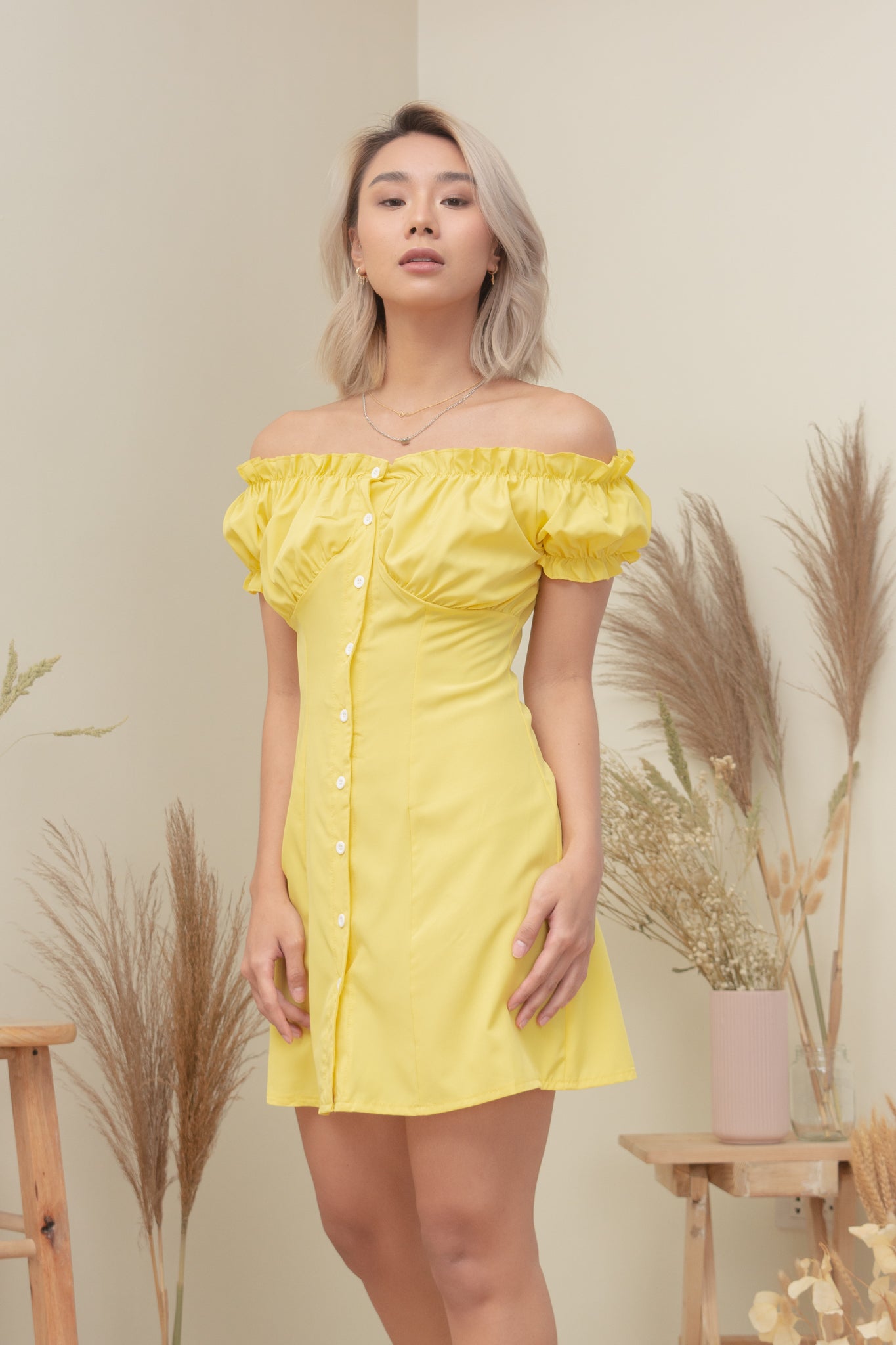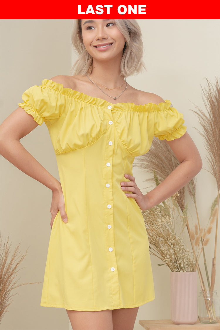 A woven dress featuring off-the-shoulder neckline or as short puff sleeves, elasticized shoulders and functional buttons.