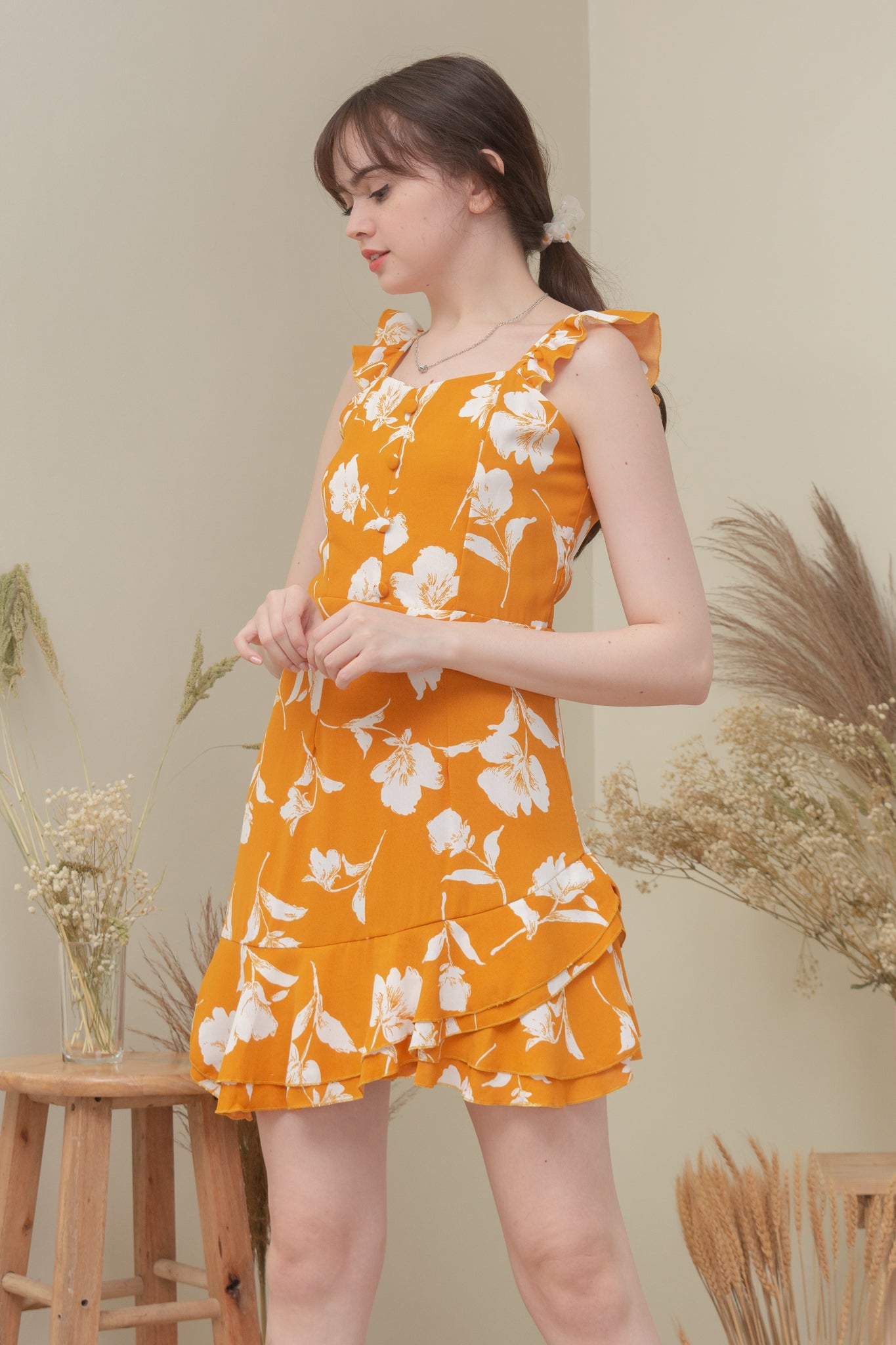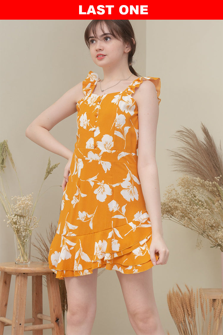 A woven dress featuring floral designs all over, scoop neckline, ruffle straps, mock buttons (non-functional), concealed back zipper, and a mini length.