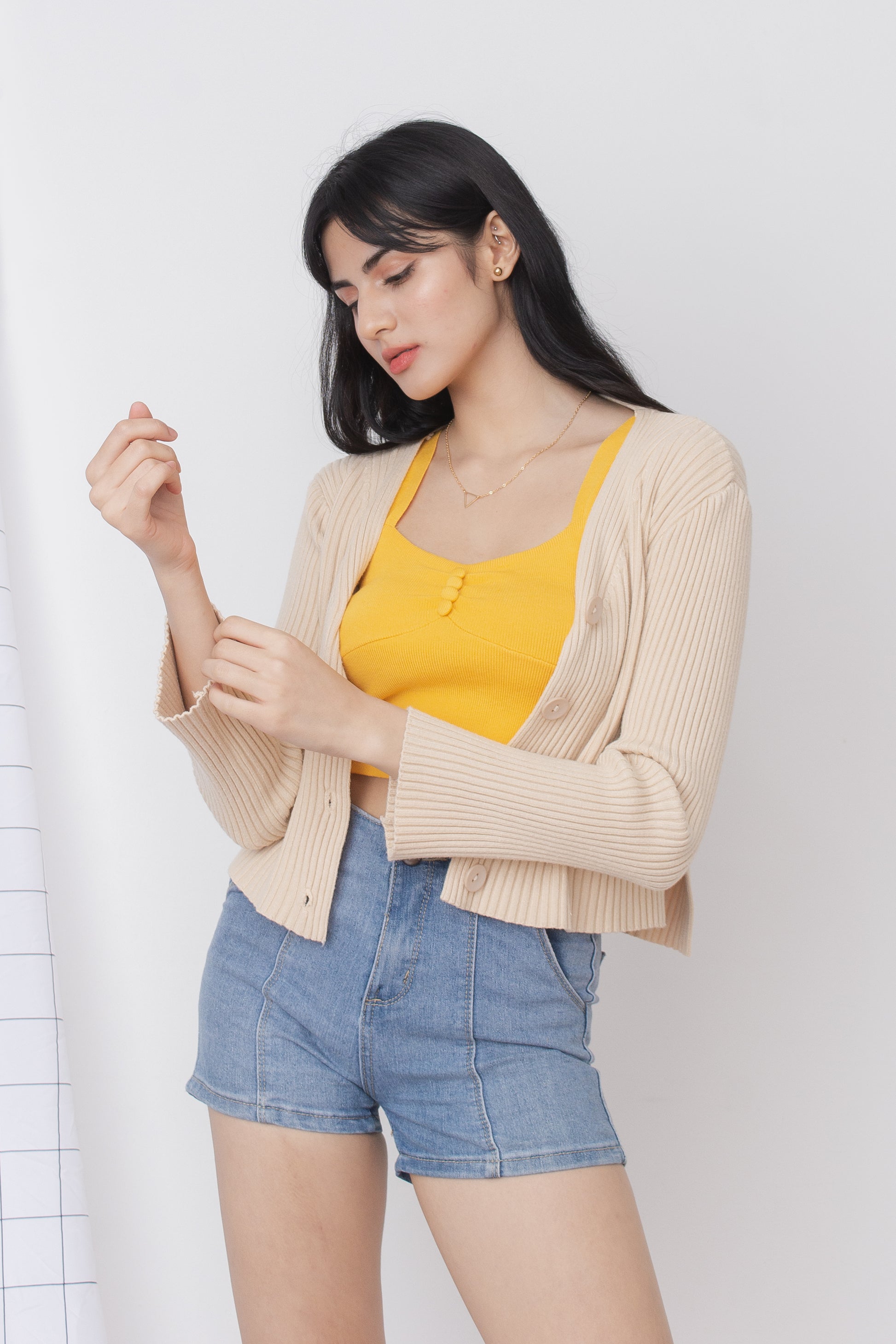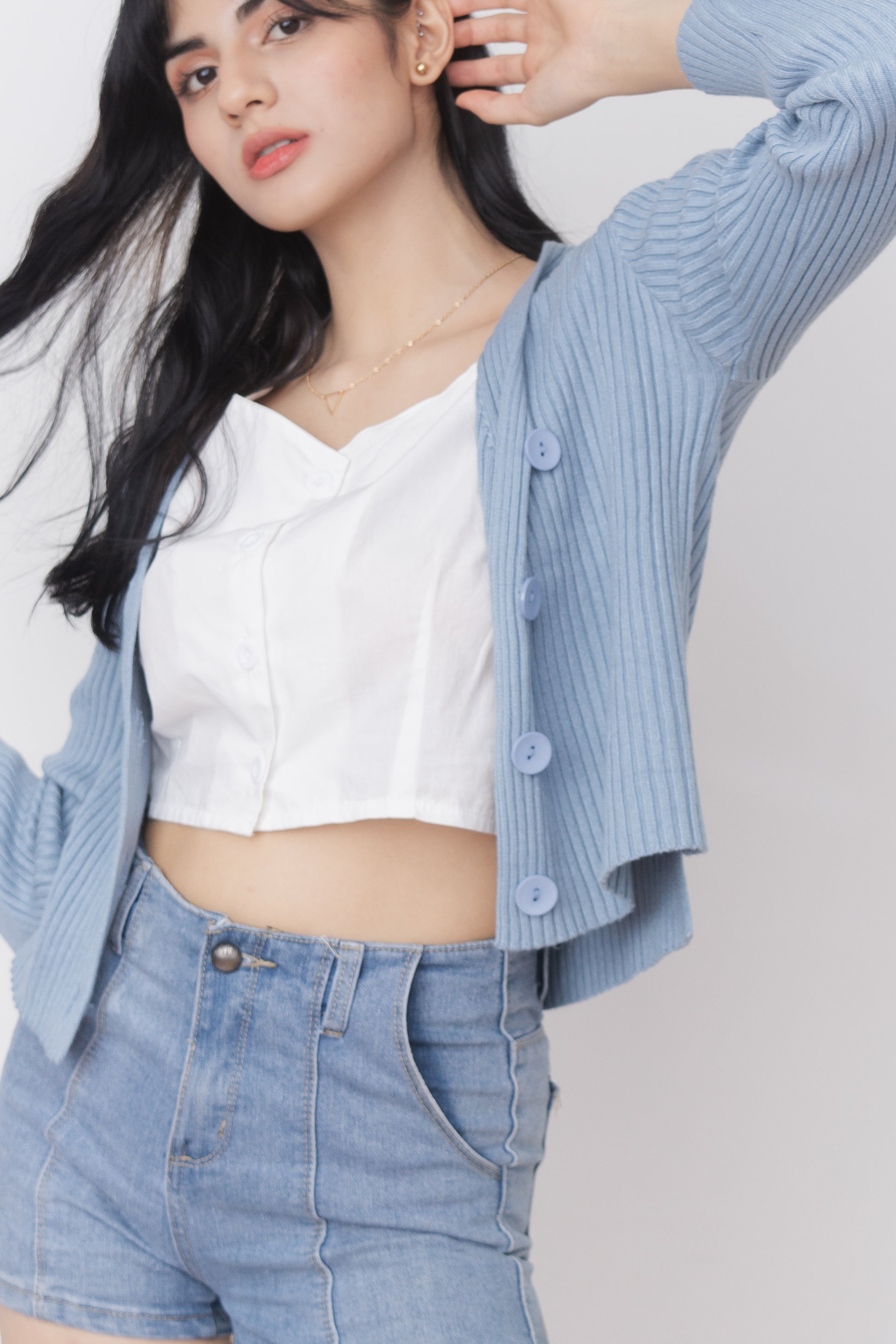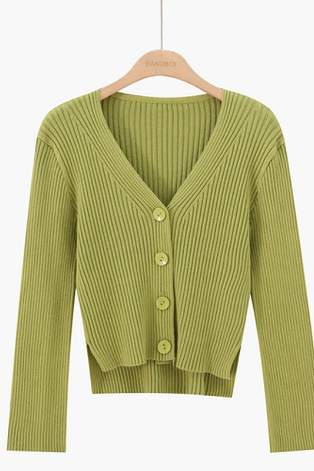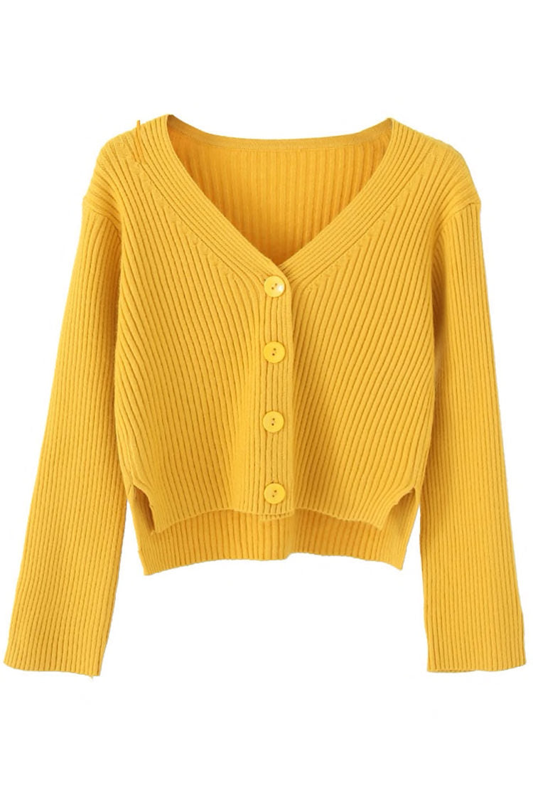 A stretchy knit long sleeves full top or can also be worn as sweater type, cardigan, featuring V neckline, ribbed design, functional buttons and loose fitting.