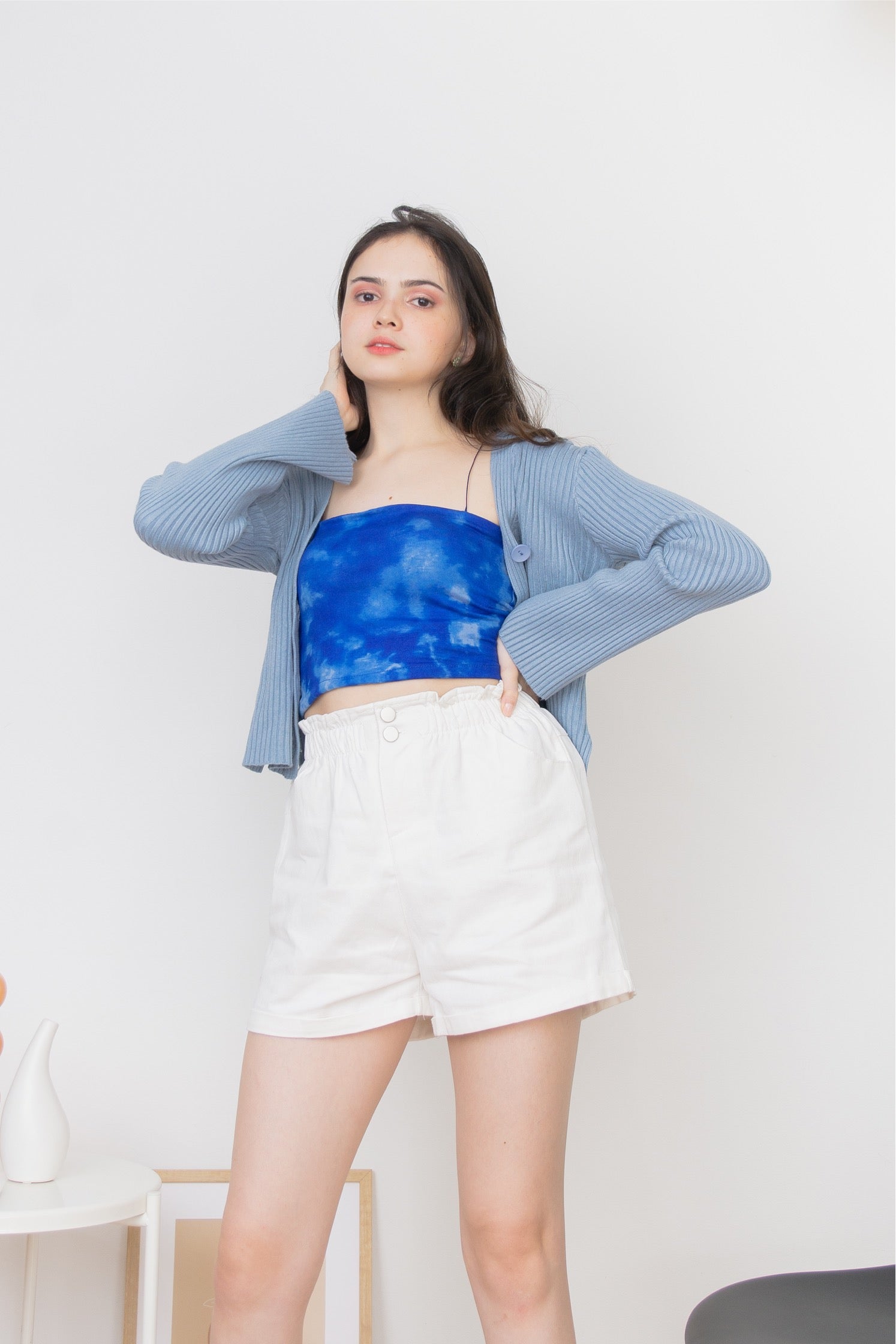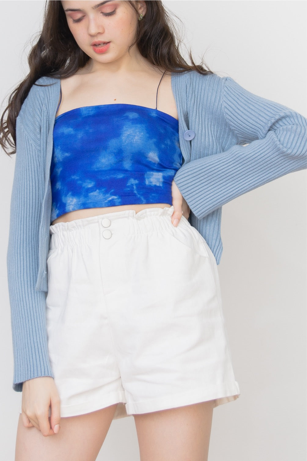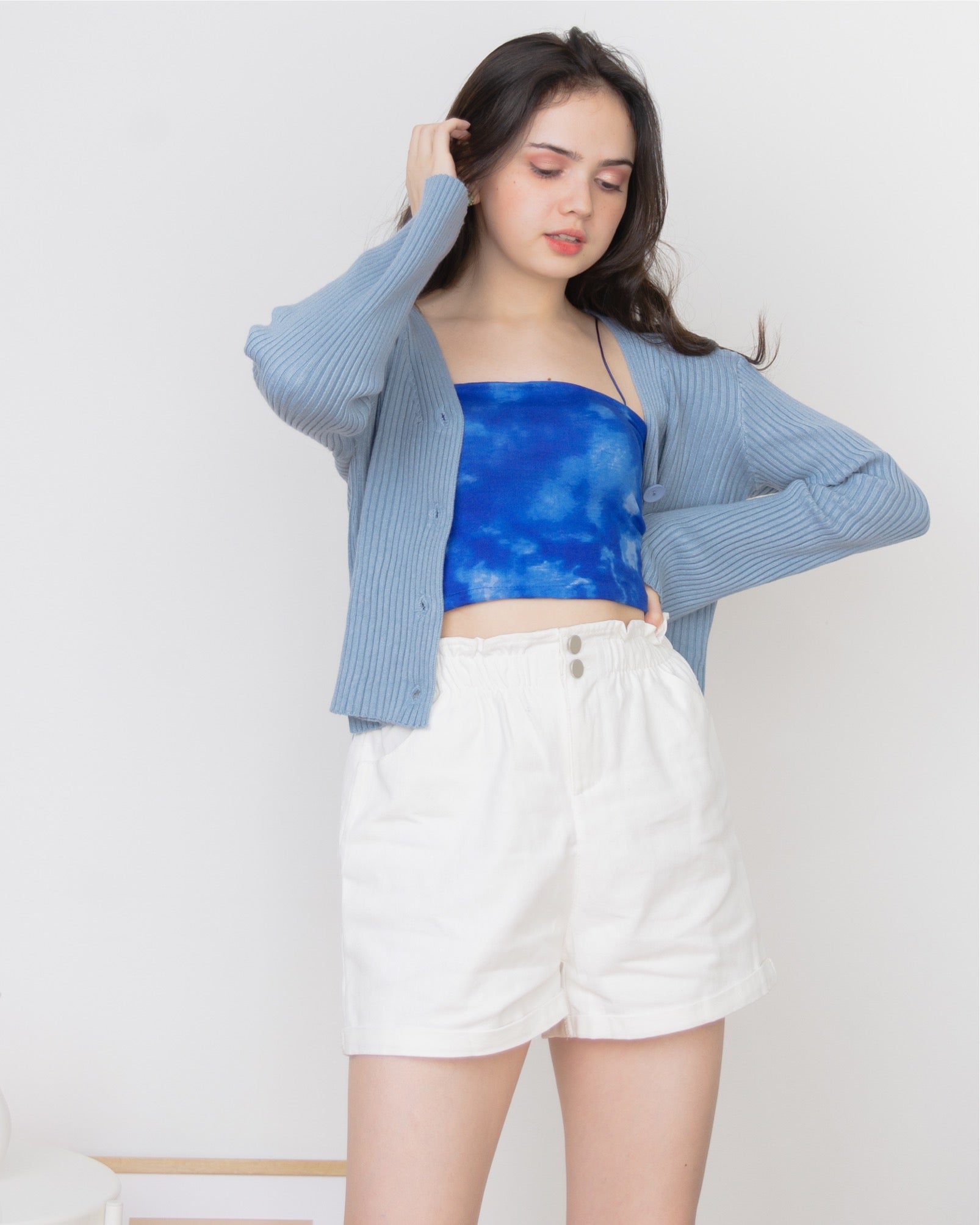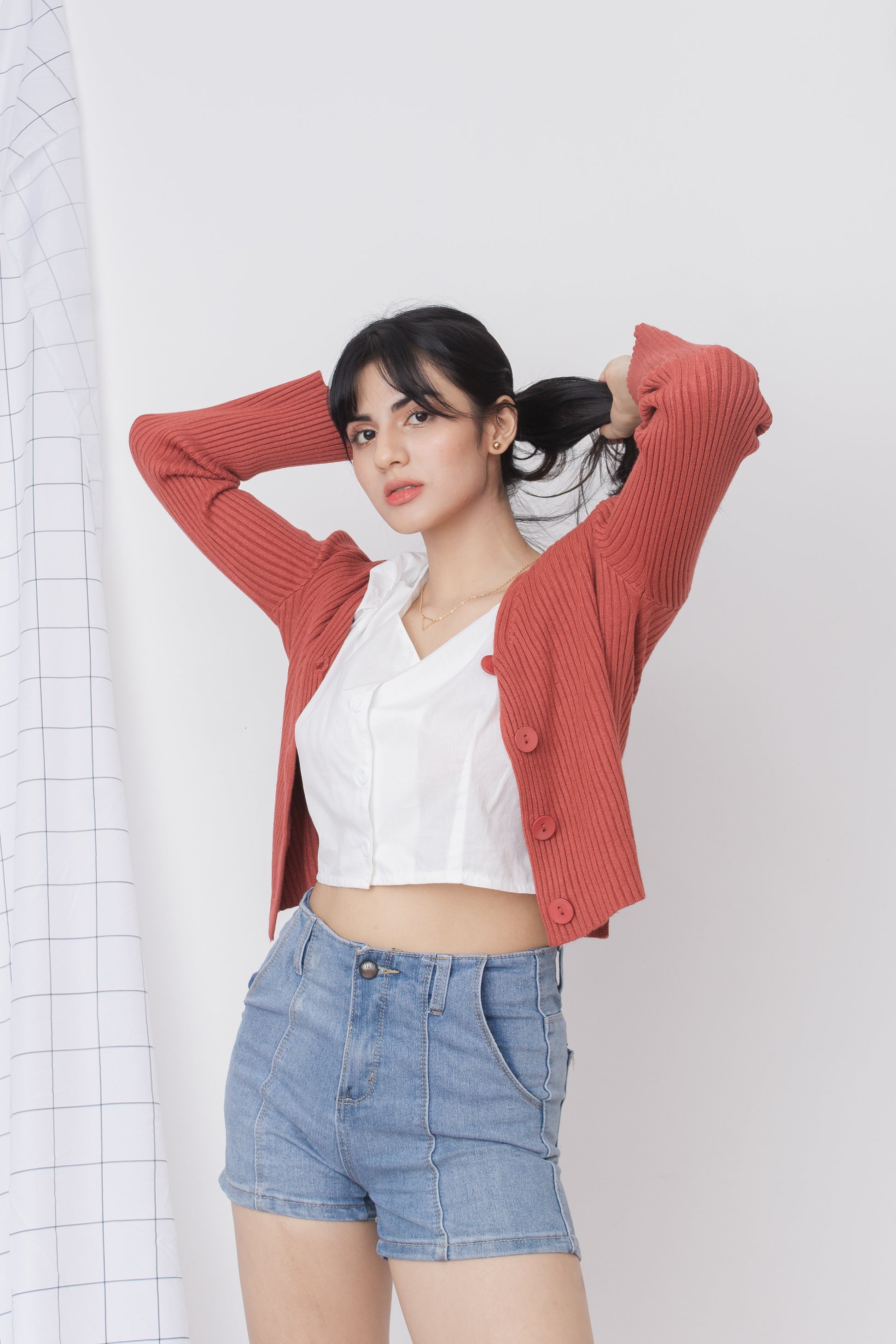 A stretchy knit long sleeves full top or can also be worn as sweater type, cardigan, featuring V neckline, ribbed design, functional buttons and loose fitting.