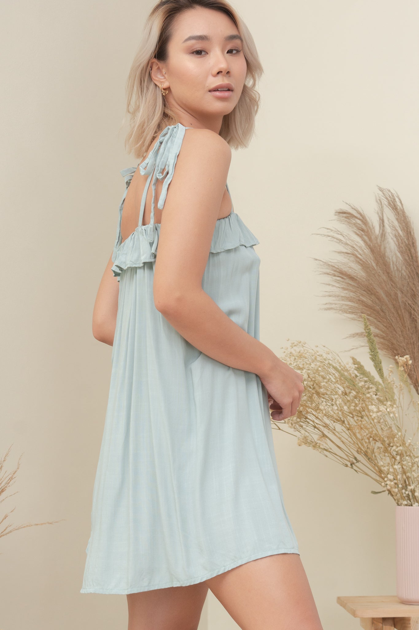 A woven dress featuring elasticized square neckline with ruffles, self-tie straps, mini length with side slit (you can also put the slit on front, sideways, or at the back) and a flowy silhouette.