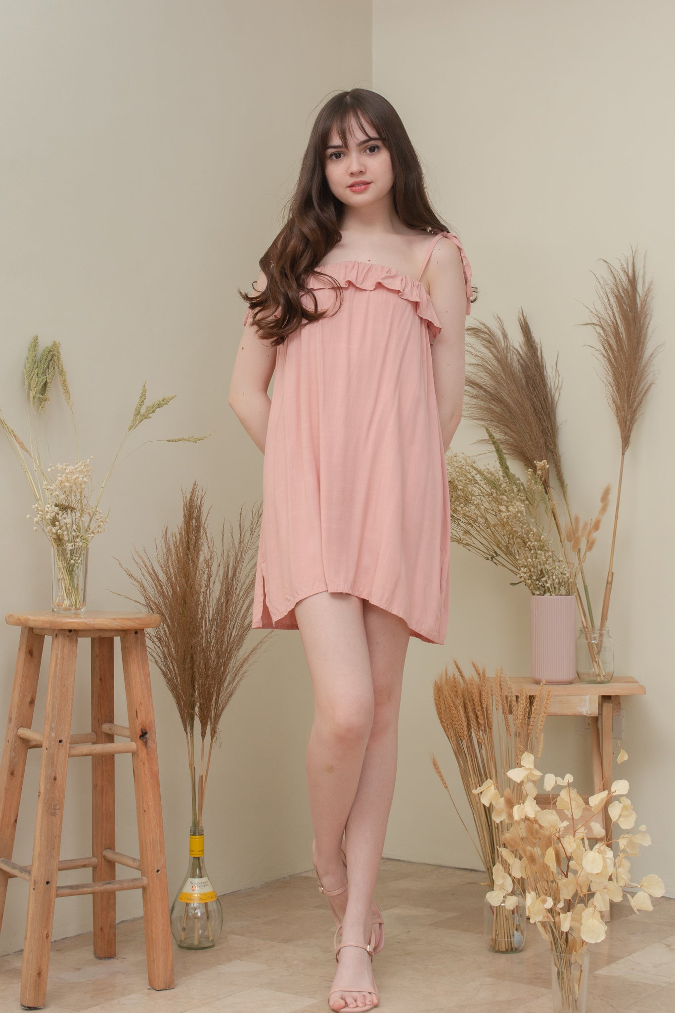 A woven dress featuring elasticized square neckline with ruffles, self-tie straps, mini length with side slit (you can also put the slit on front, sideways, or at the back) and a flowy silhouette.