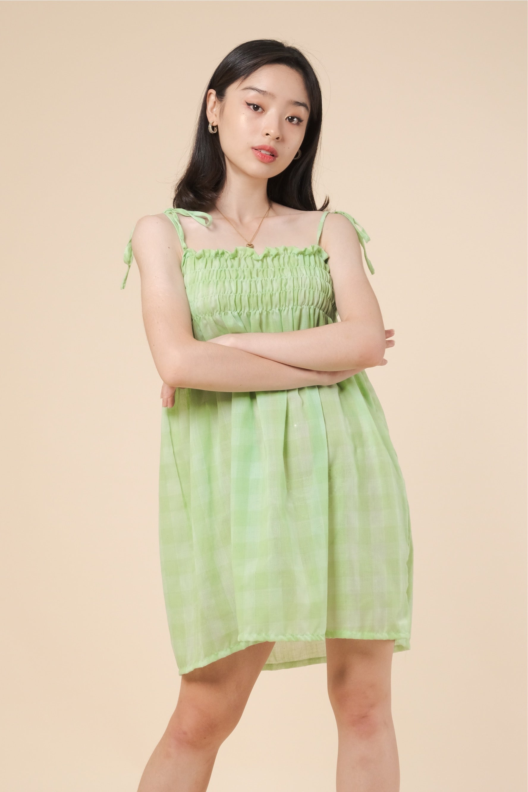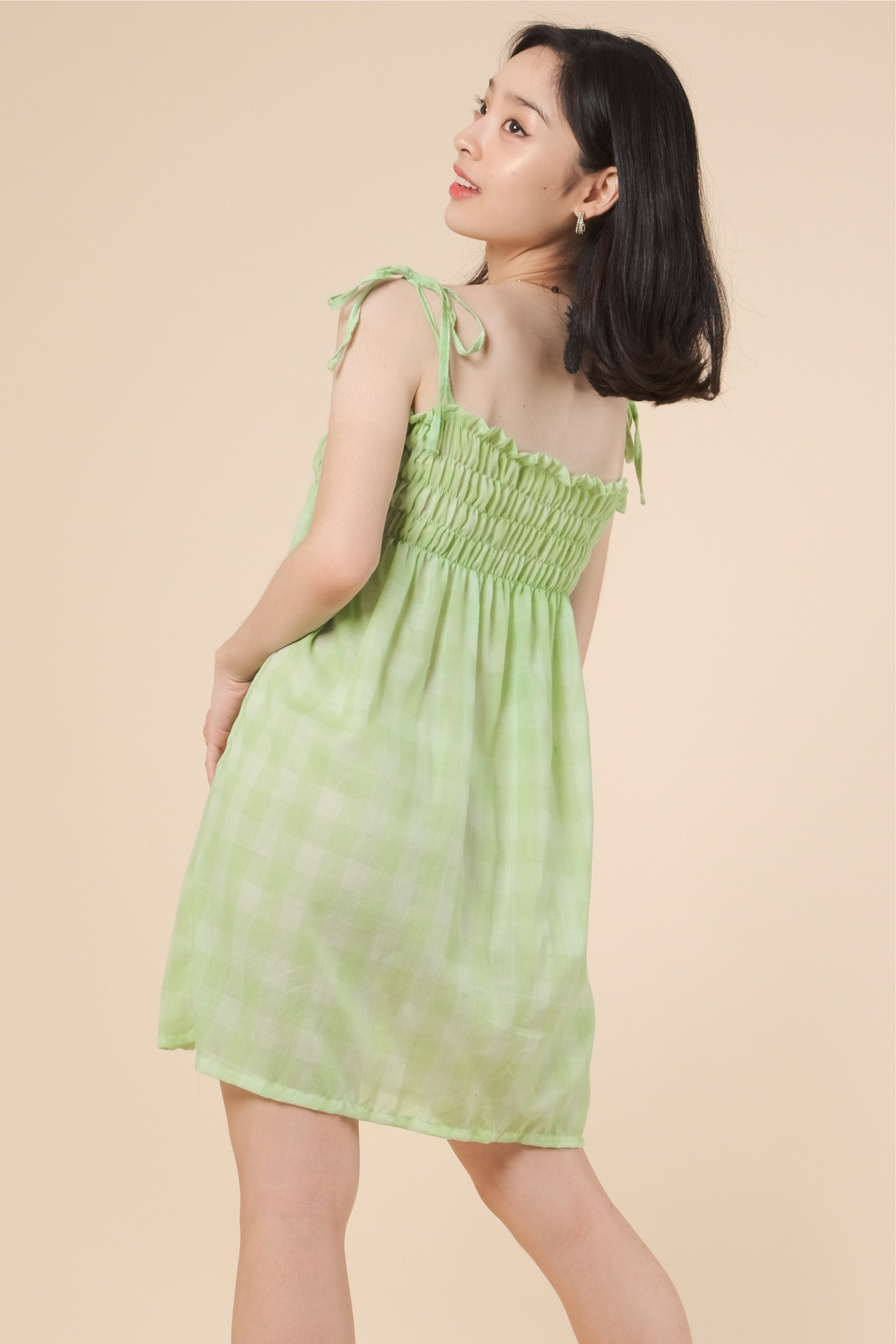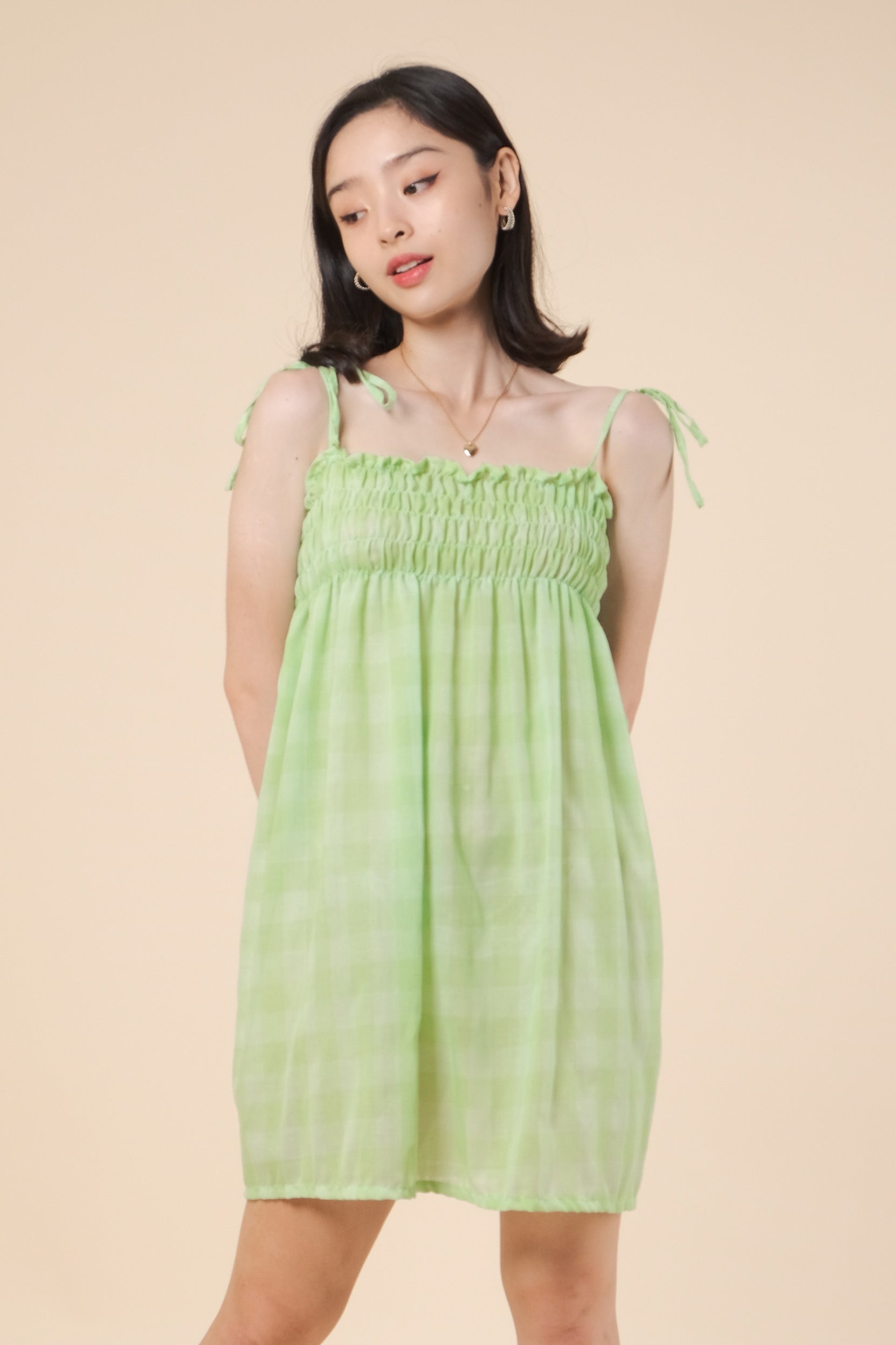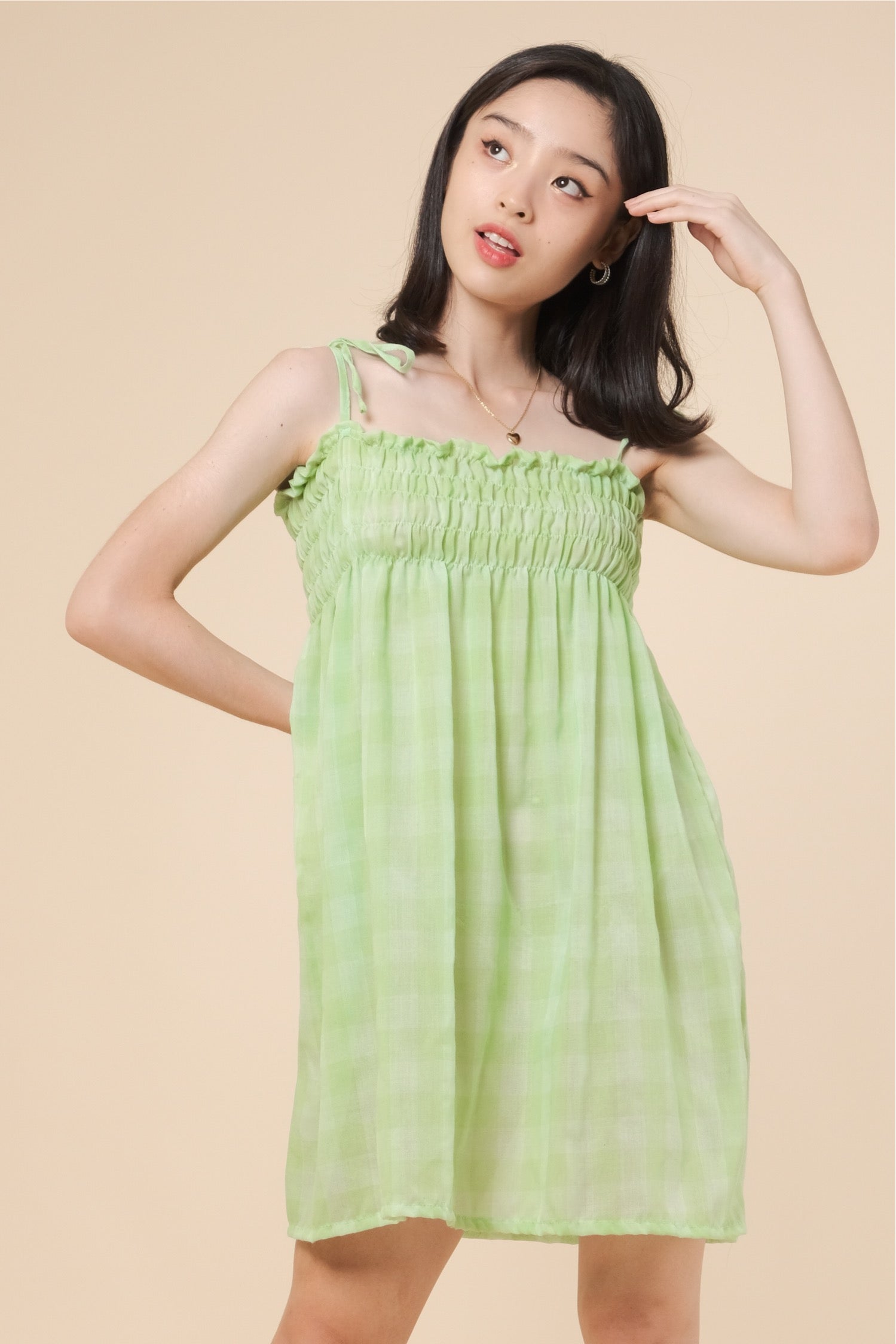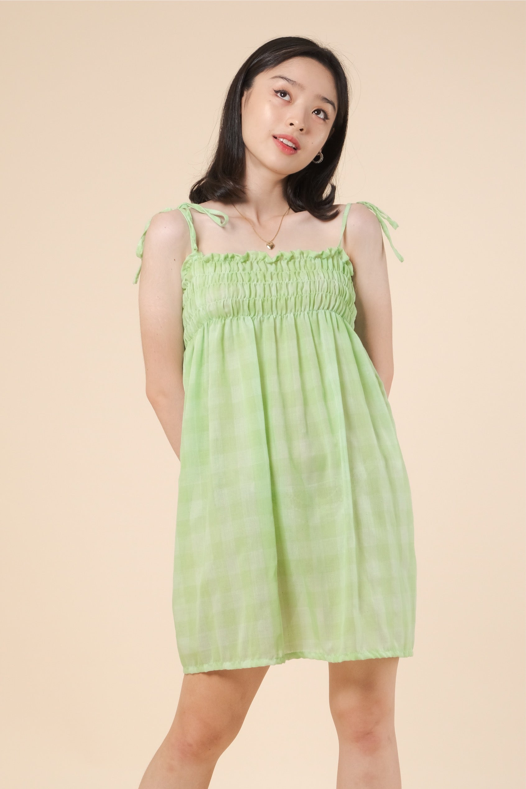 A woven dress featuring square neckline, smocked bodice, self-tie fastening straps, and flowy silhouette.