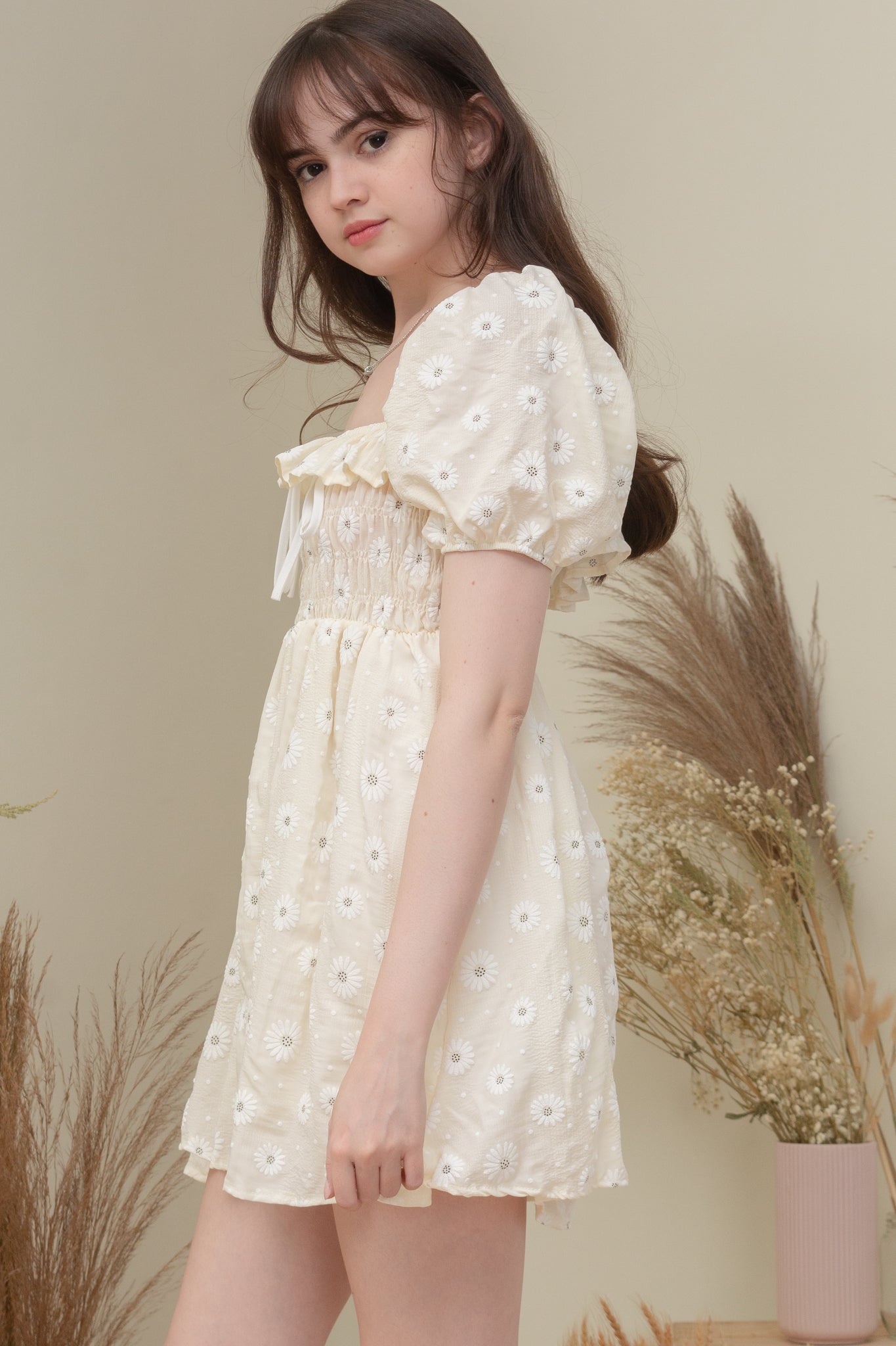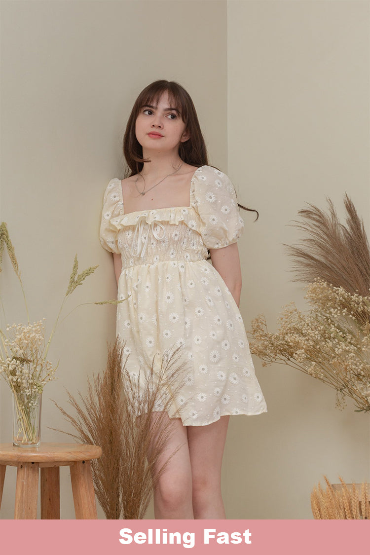 A woven baby doll dress featuring square neckline with self-tie fastening details and ruffles, elasticized short puff sleeves, smocked bodice, fully lined (bottom), and flowy silhouette.