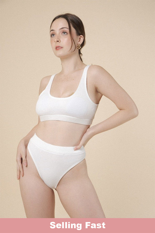A pair of ribbed knit bikini set featuring a bikini top with ribbed construction, shoulder straps, and a square-cut neck and back, high-rise waist, cheeky coverage, lined, and high-leg cut.