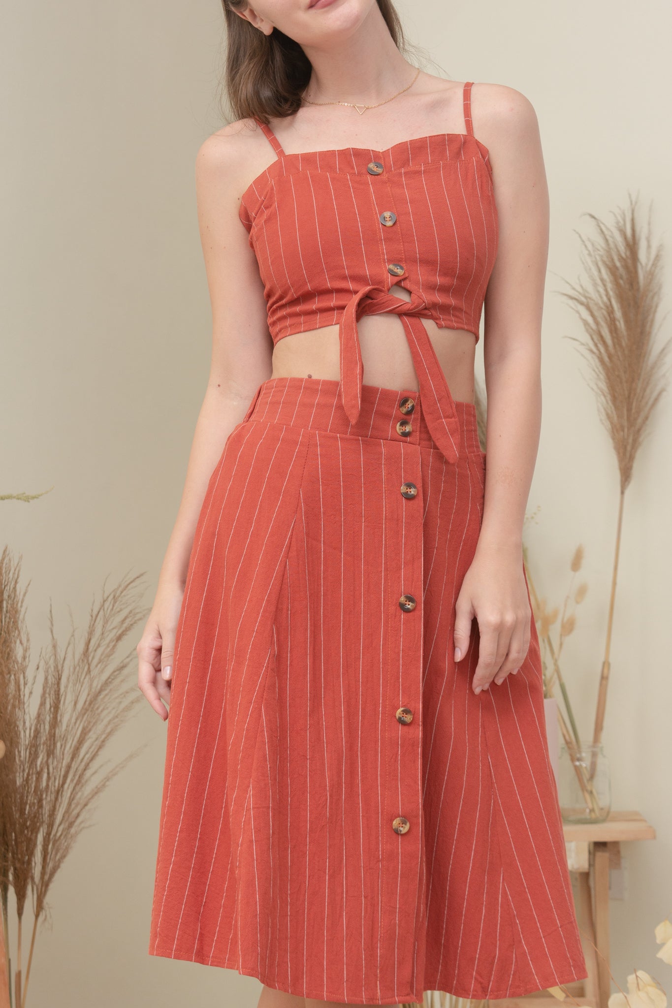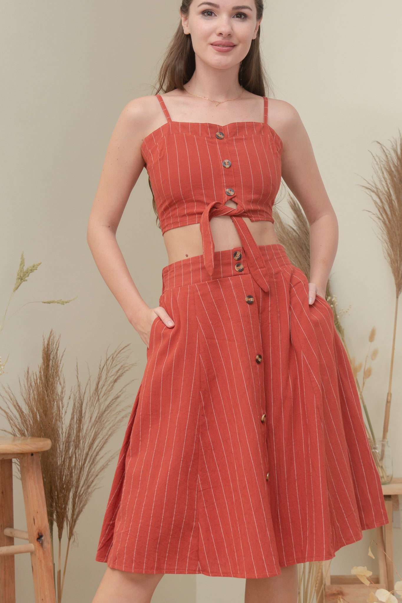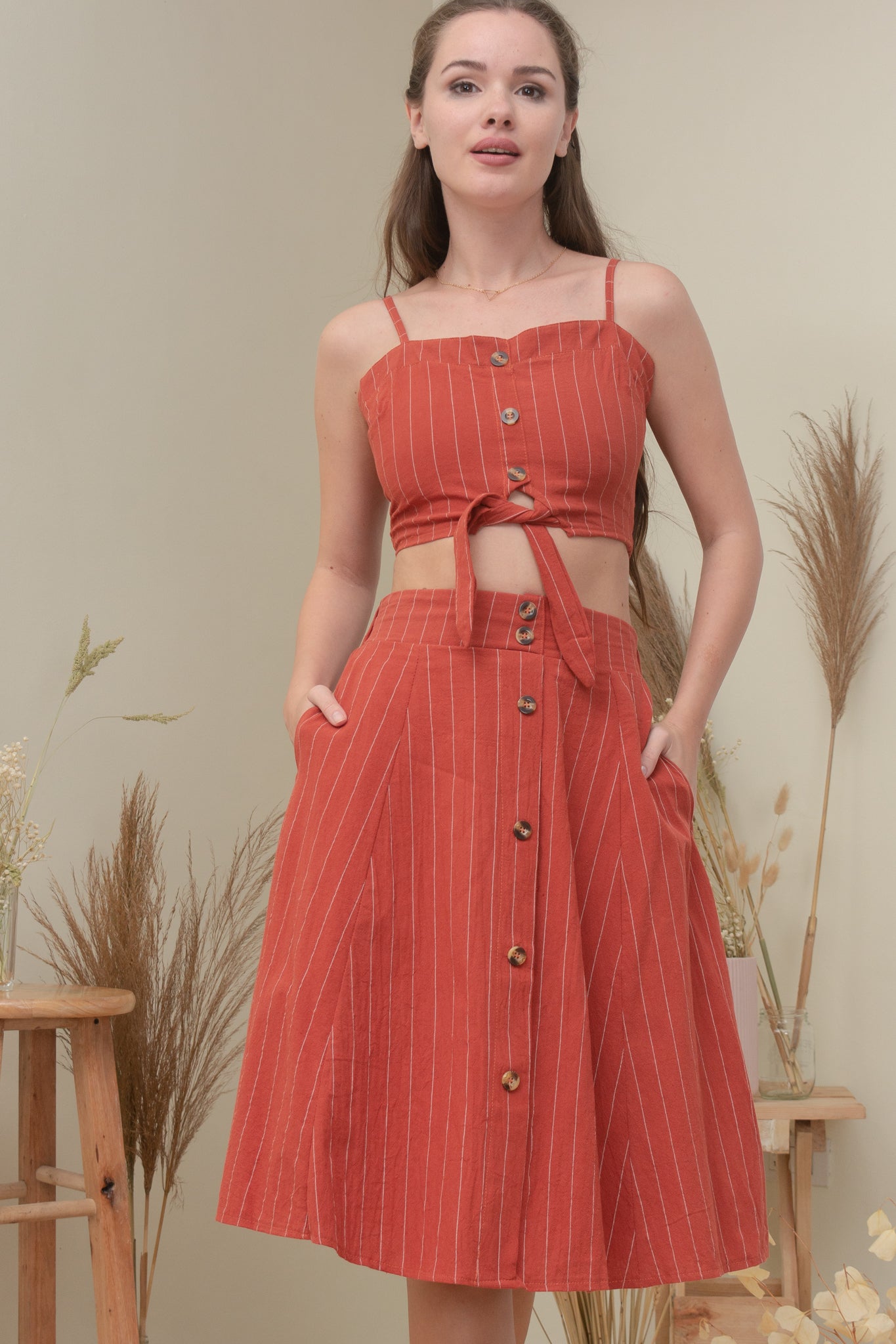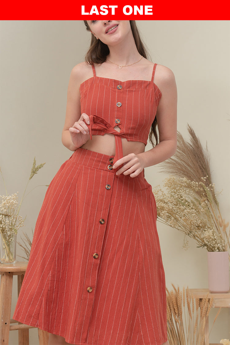 A woven smocked crop top with mock buttons (non-functional), adjustable straps, self-tie fastening and a midi semi A-line skirt featuring elasticized back waist, and mock buttons (non-functional).