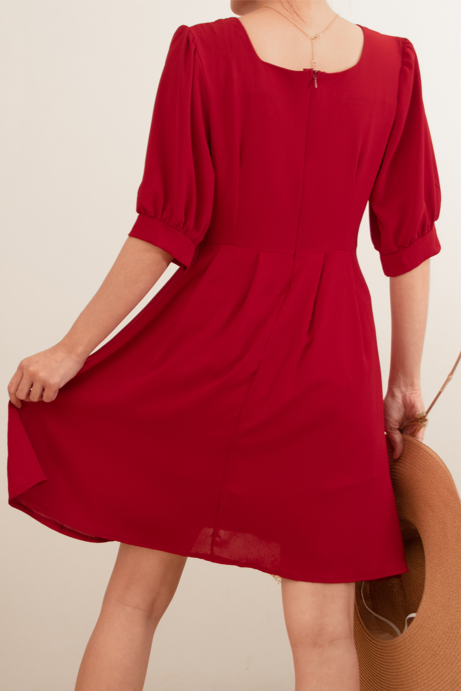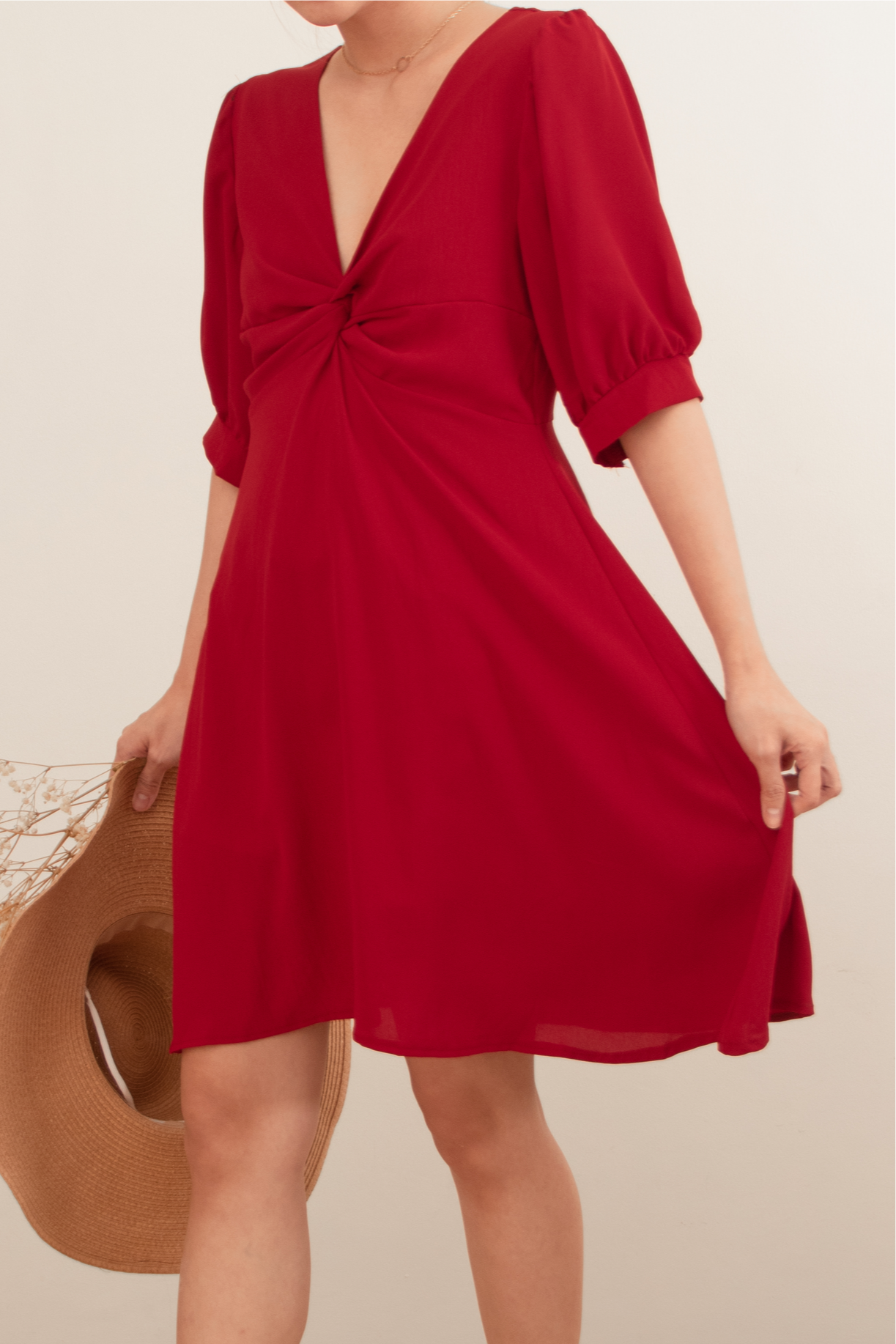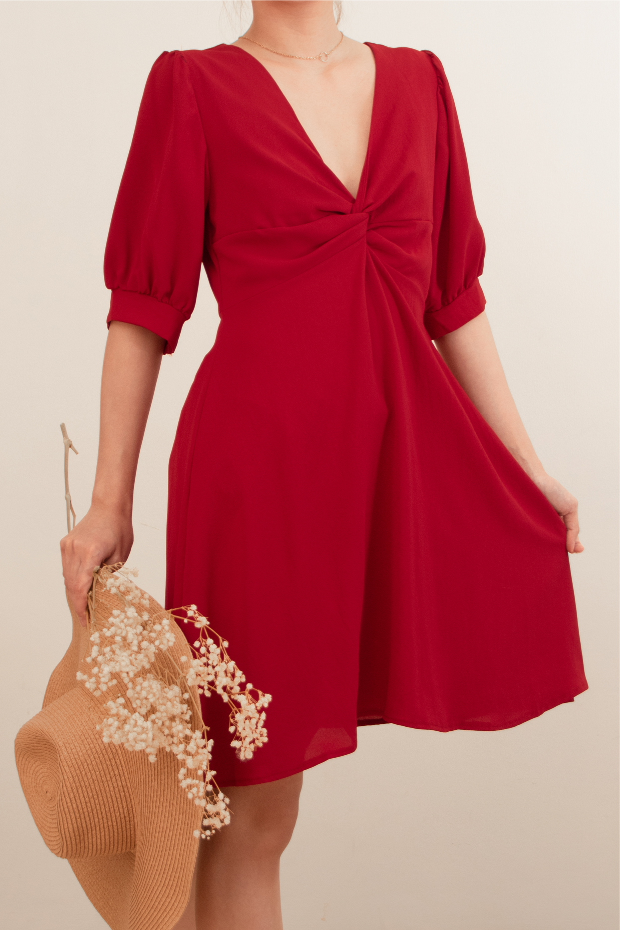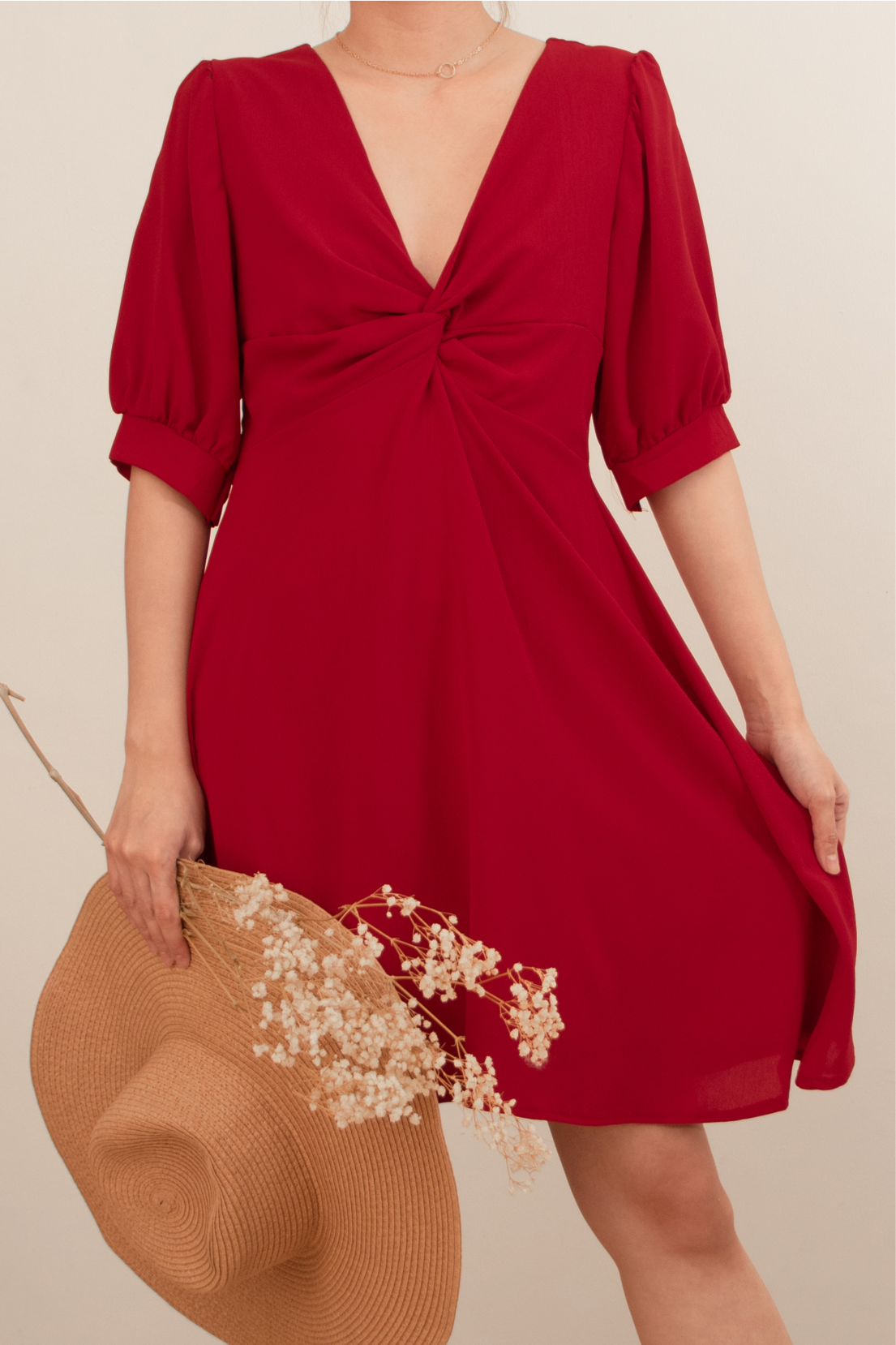 A woven dress featuring V neckline with twist design, short sleeves with cuffed hem, with lining, concealed back zipper and flowy silhouette.
