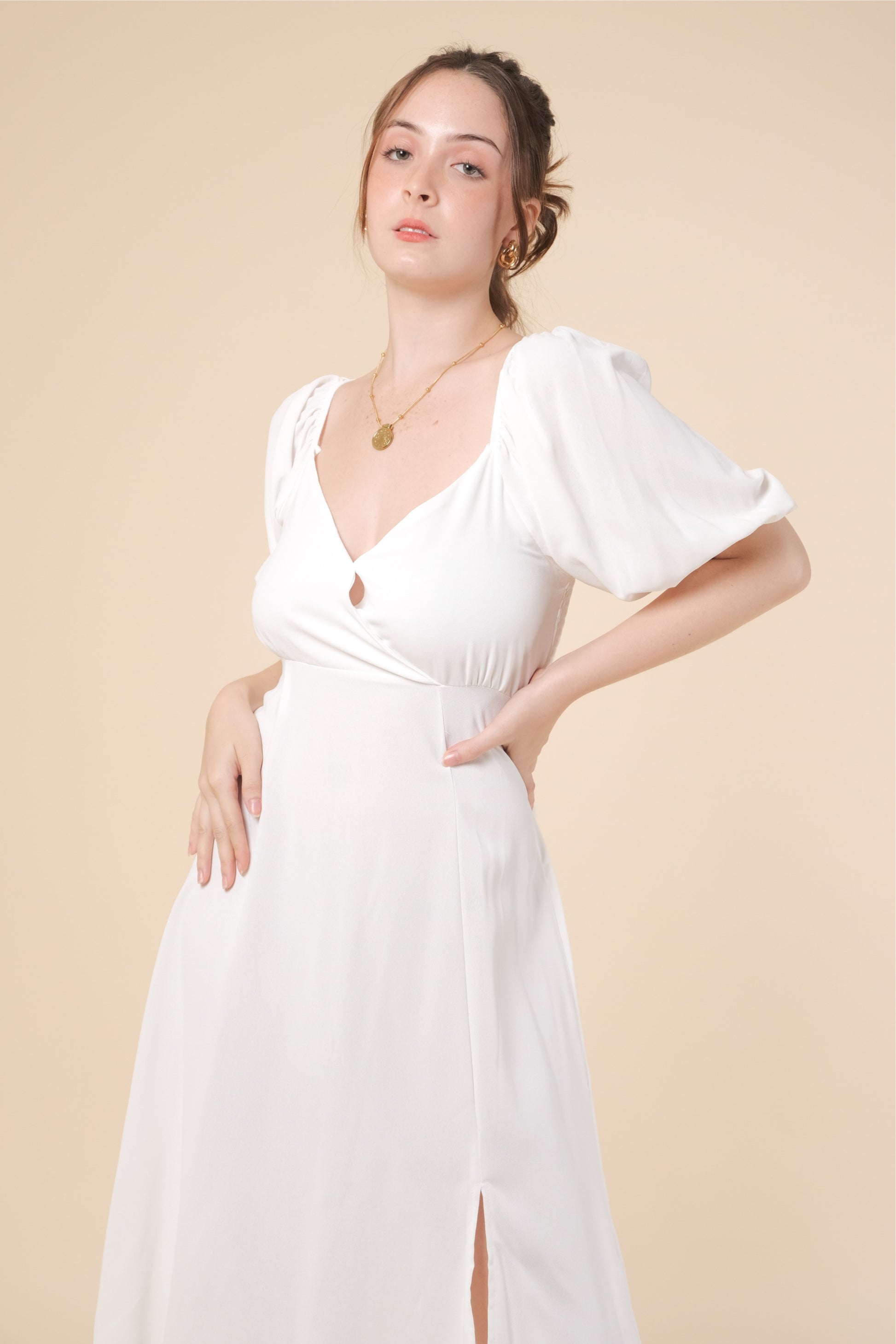 A woven dress featuring surplice neckline, short puff sleeves, smocked back, front slit and flowy silhouette.