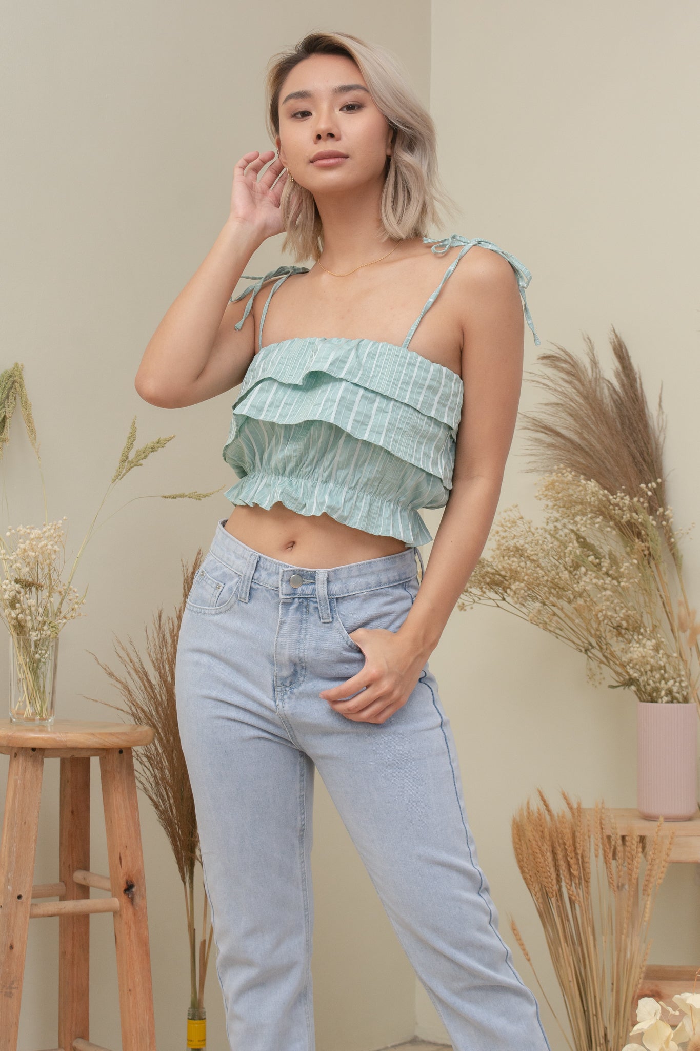 A woven top featuring elasticized square neckline, self-tie cami straps, elasticized waist, and flounce layer all over.