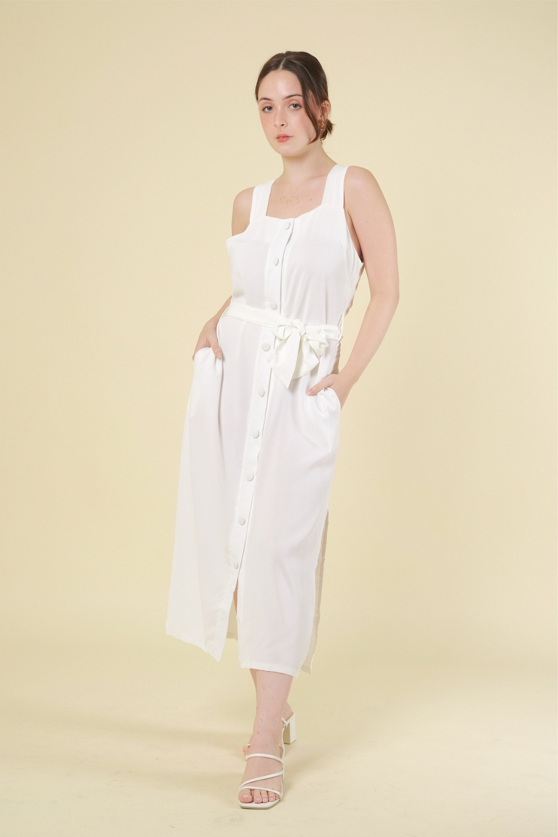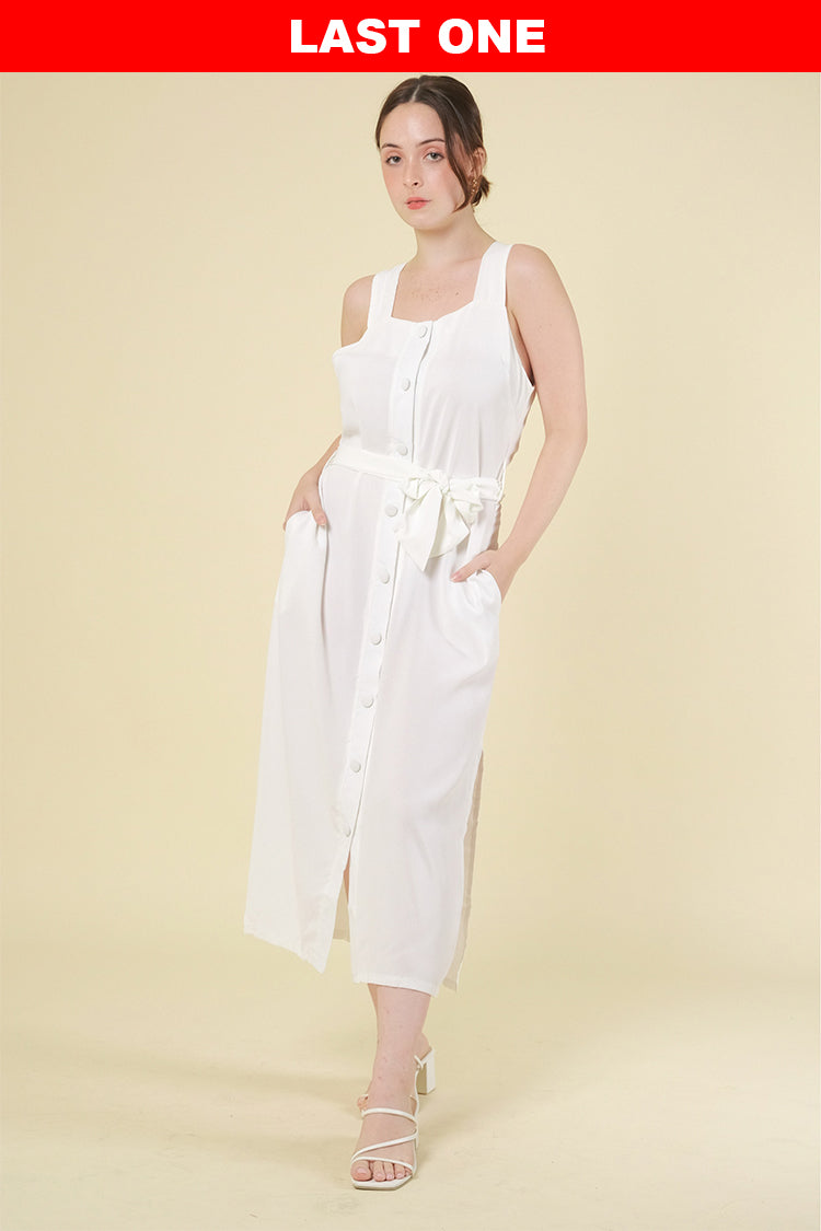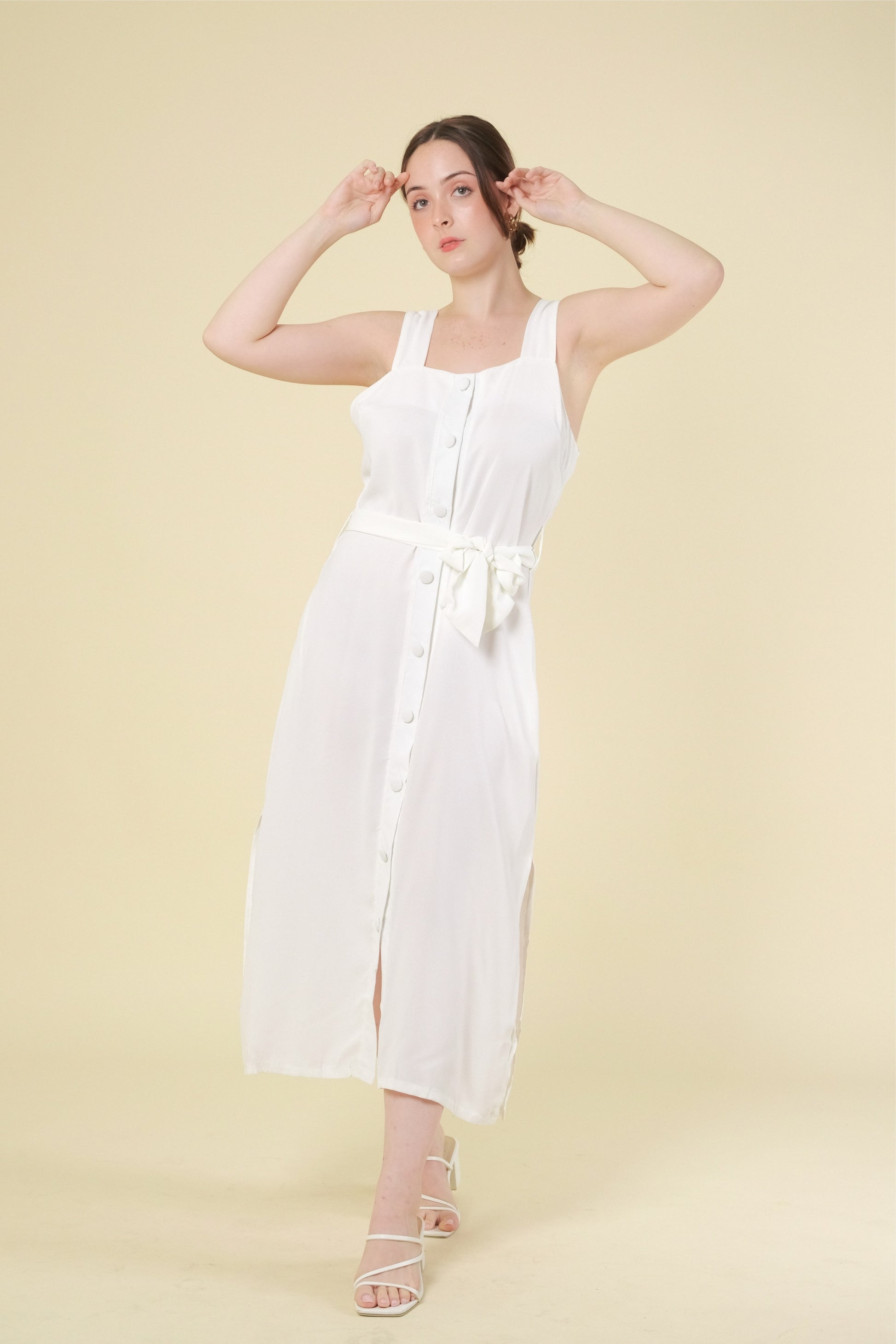 A woven dress featuring square neckline, wide straps, functional buttons, belt loops with detachable self-tie waist fastening details, elasticized back waist, front dual side pockets, side slits and a flowy silhouette.