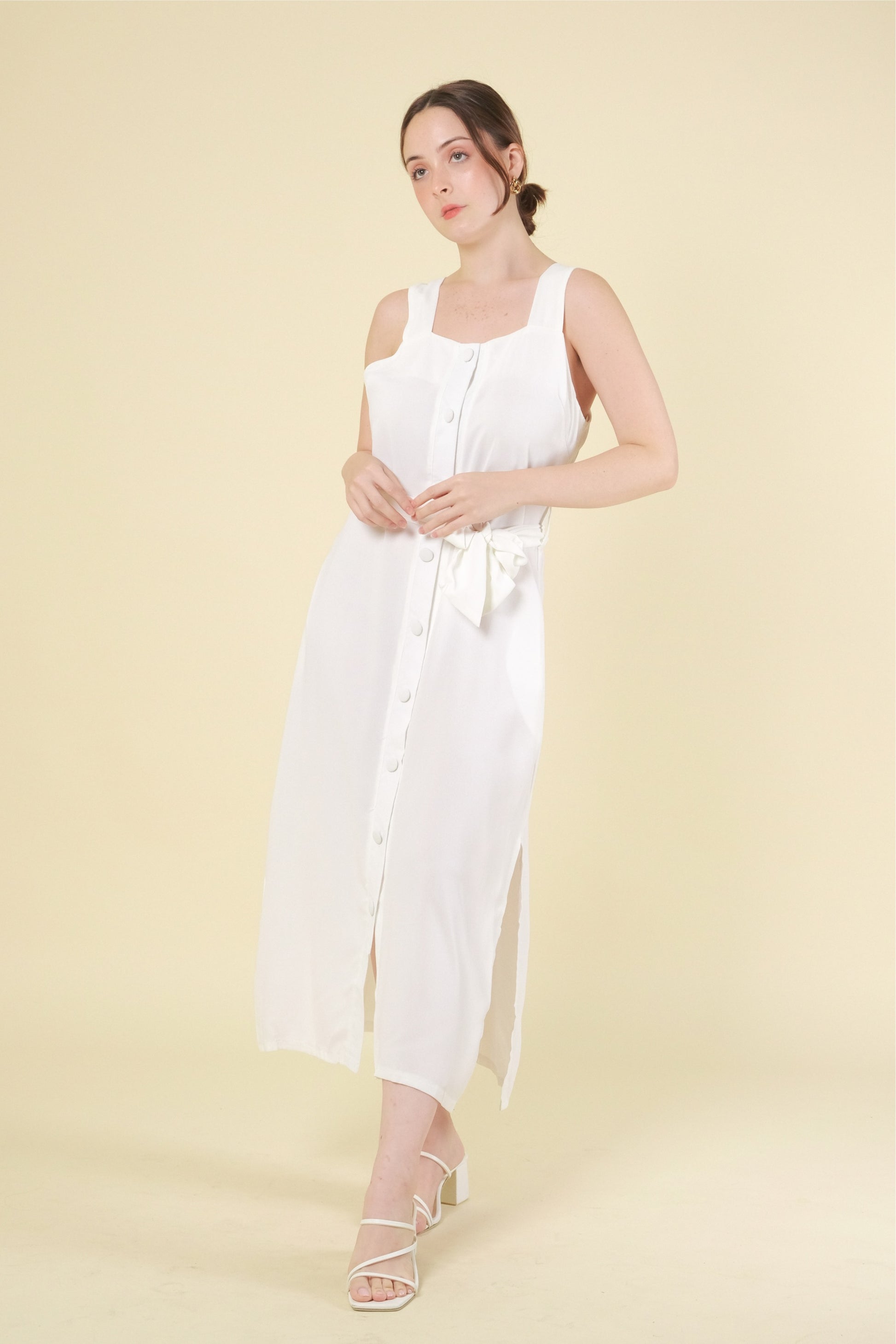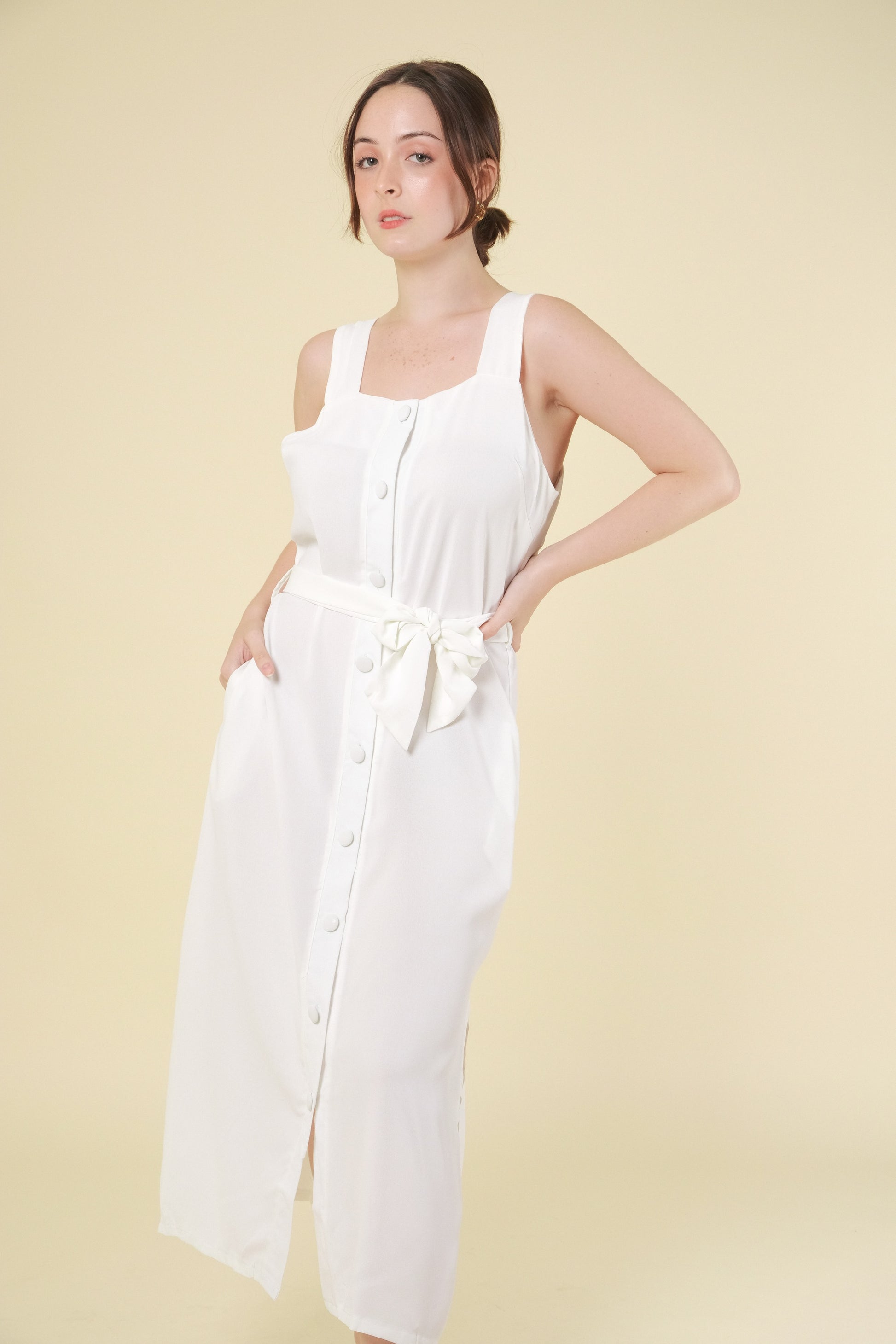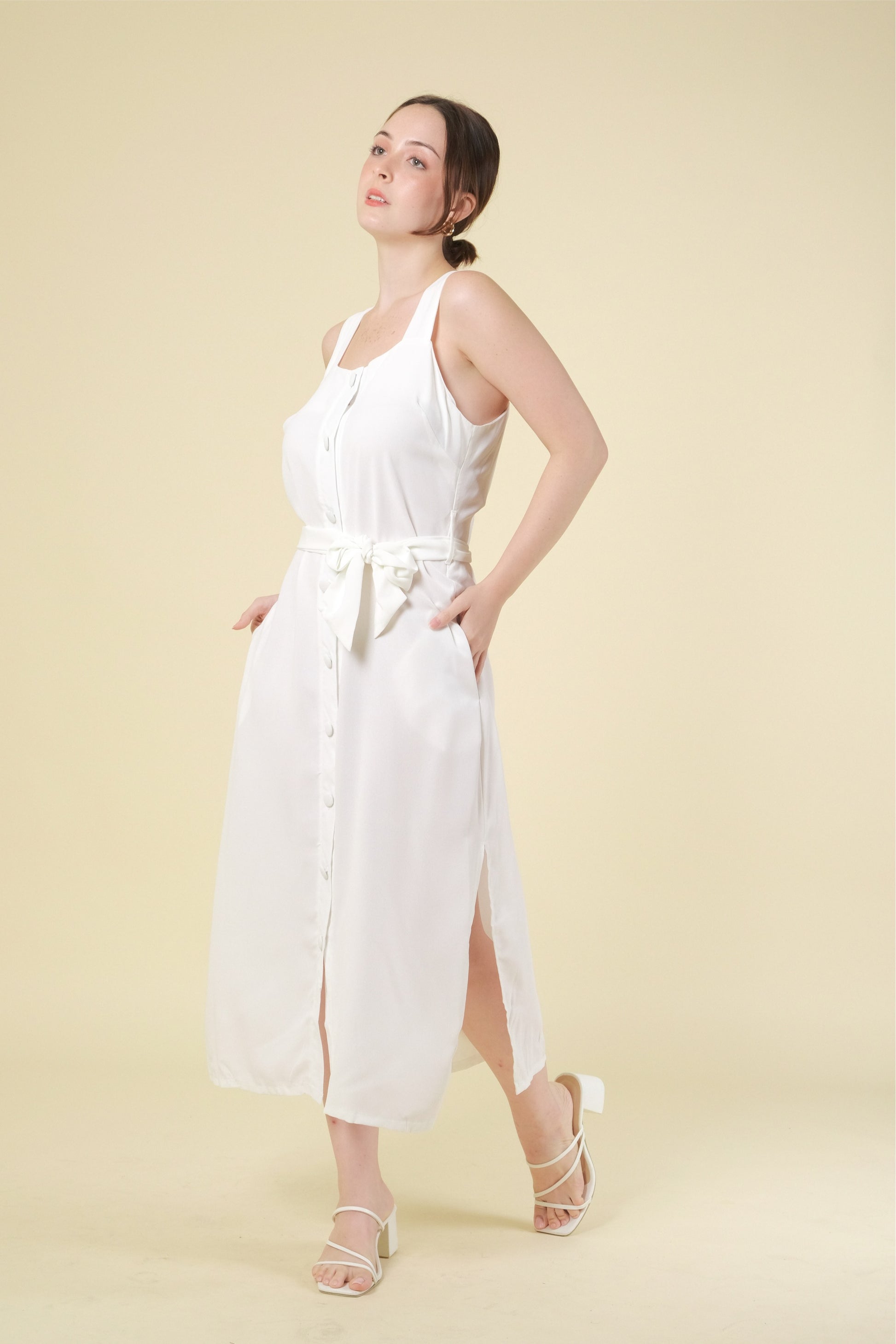 A woven dress featuring square neckline, wide straps, functional buttons, belt loops with detachable self-tie waist fastening details, elasticized back waist, front dual side pockets, side slits and a flowy silhouette.