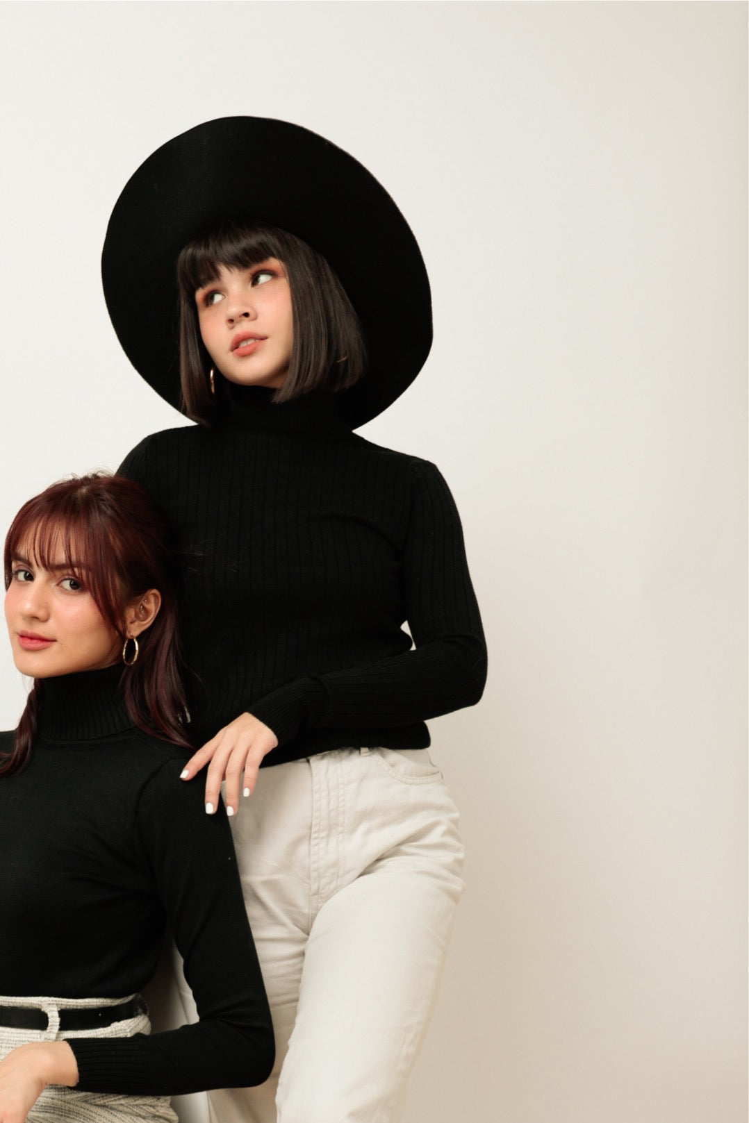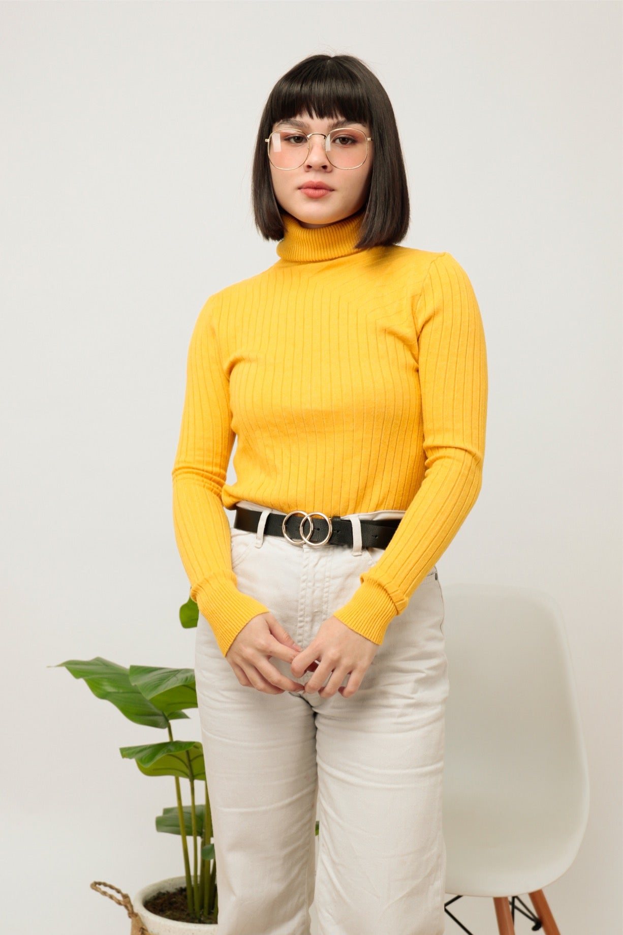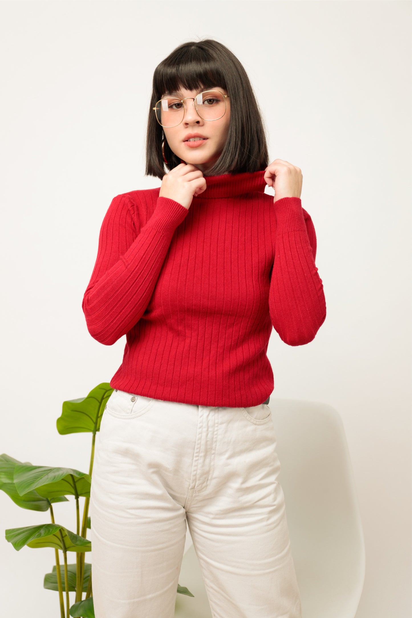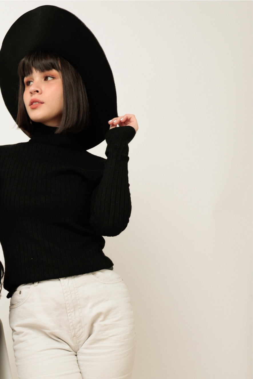 A stretchy knit long sleeves full top featuring turtle-neck neckline, zig zag ribbed design, and form fitting silhouette.