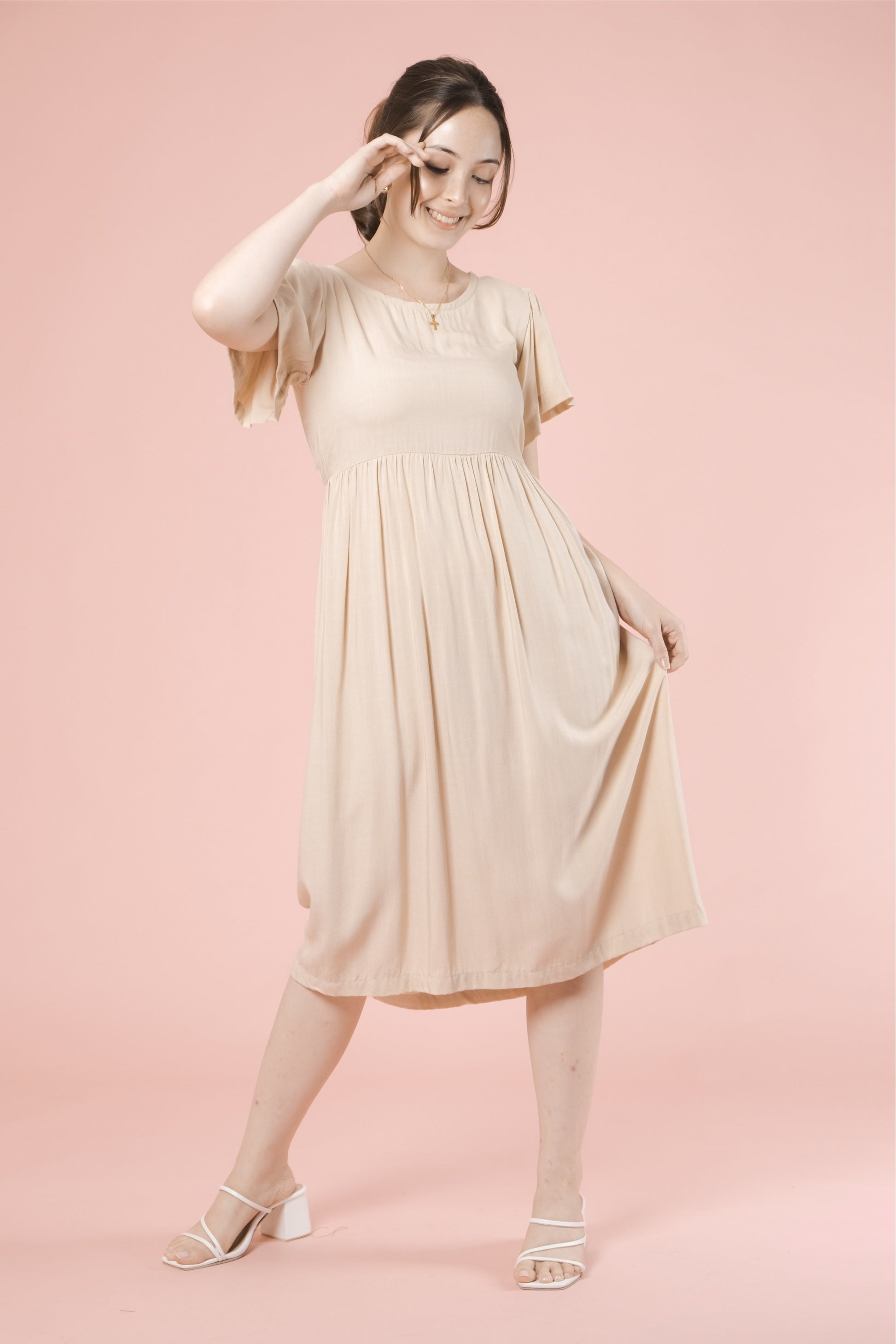 A woven dress featuring scoop neckline, short puff sleeves, back self-tie fastening details, elasticized back waist, midi length and flowy silhouette.