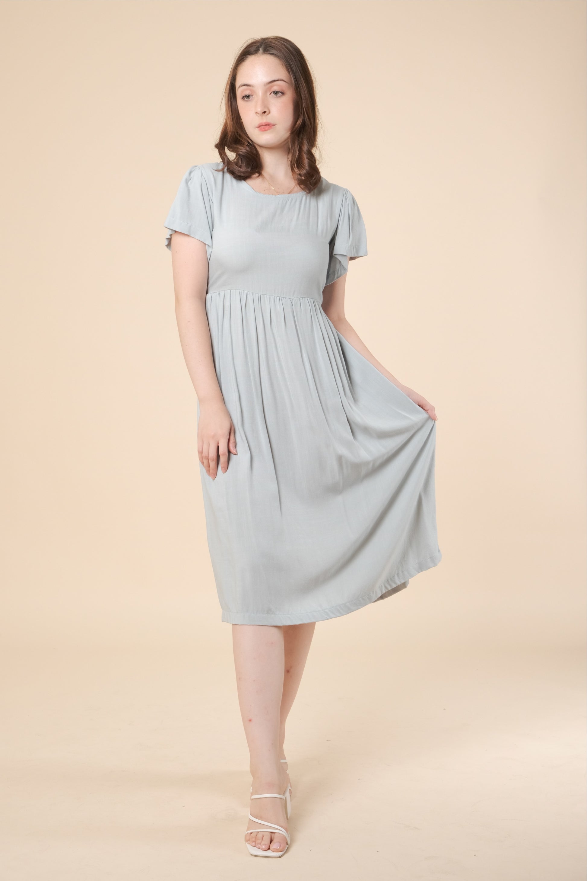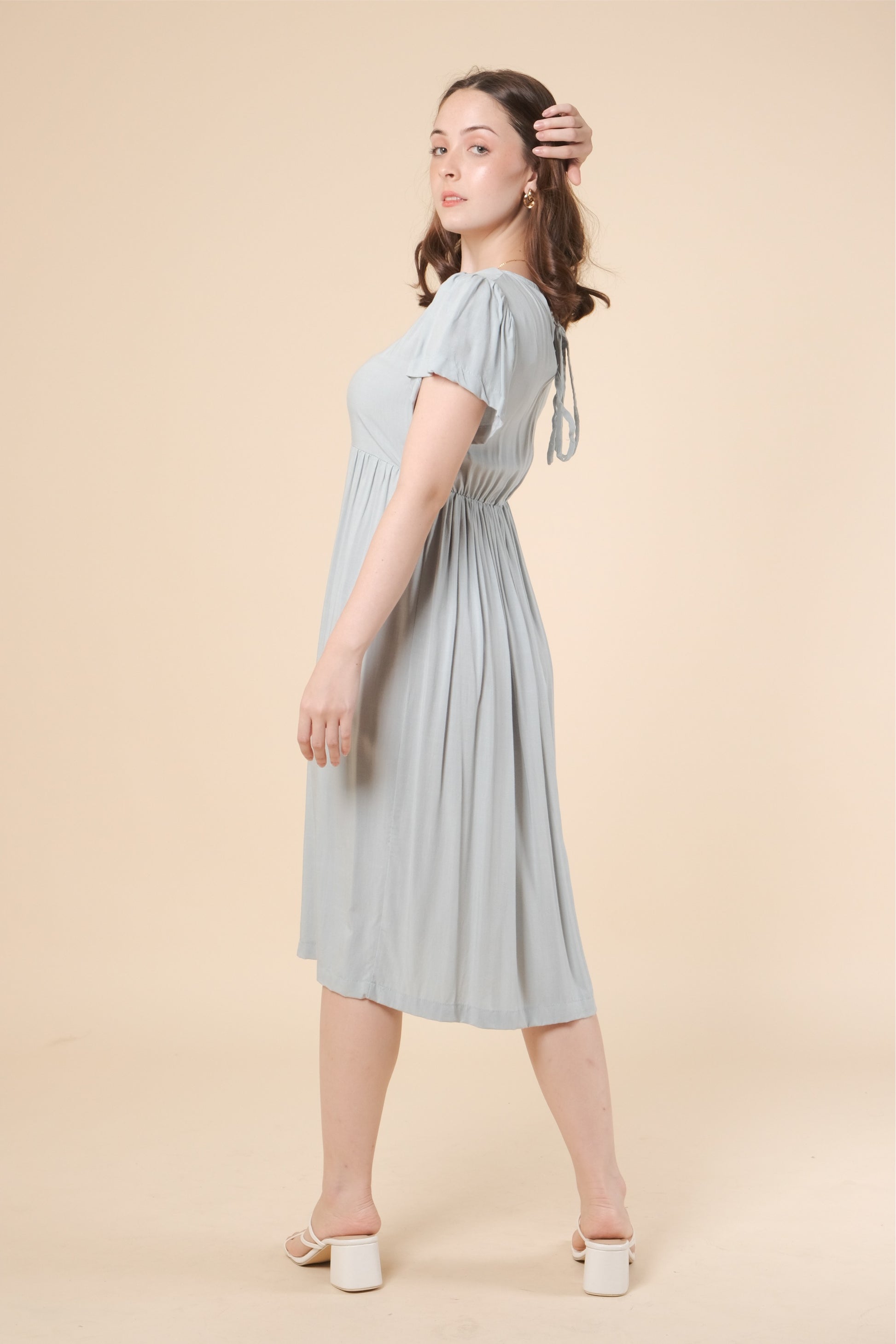 A woven dress featuring scoop neckline, short puff sleeves, back self-tie fastening details, elasticized back waist, midi length and flowy silhouette.