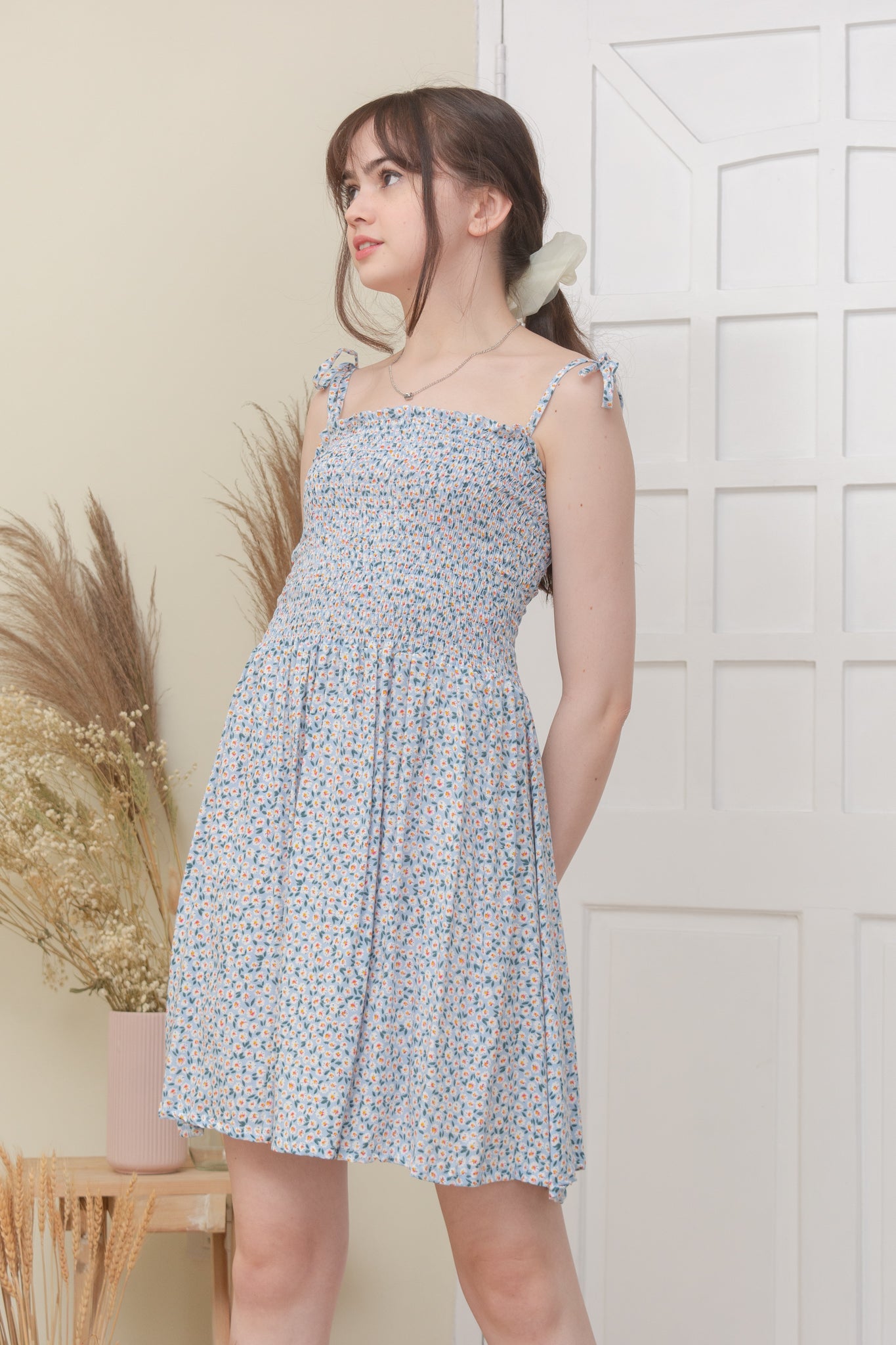 A woven dress featuring square neckline, self-tie cami straps, smocked bodice and flowy silhouette.