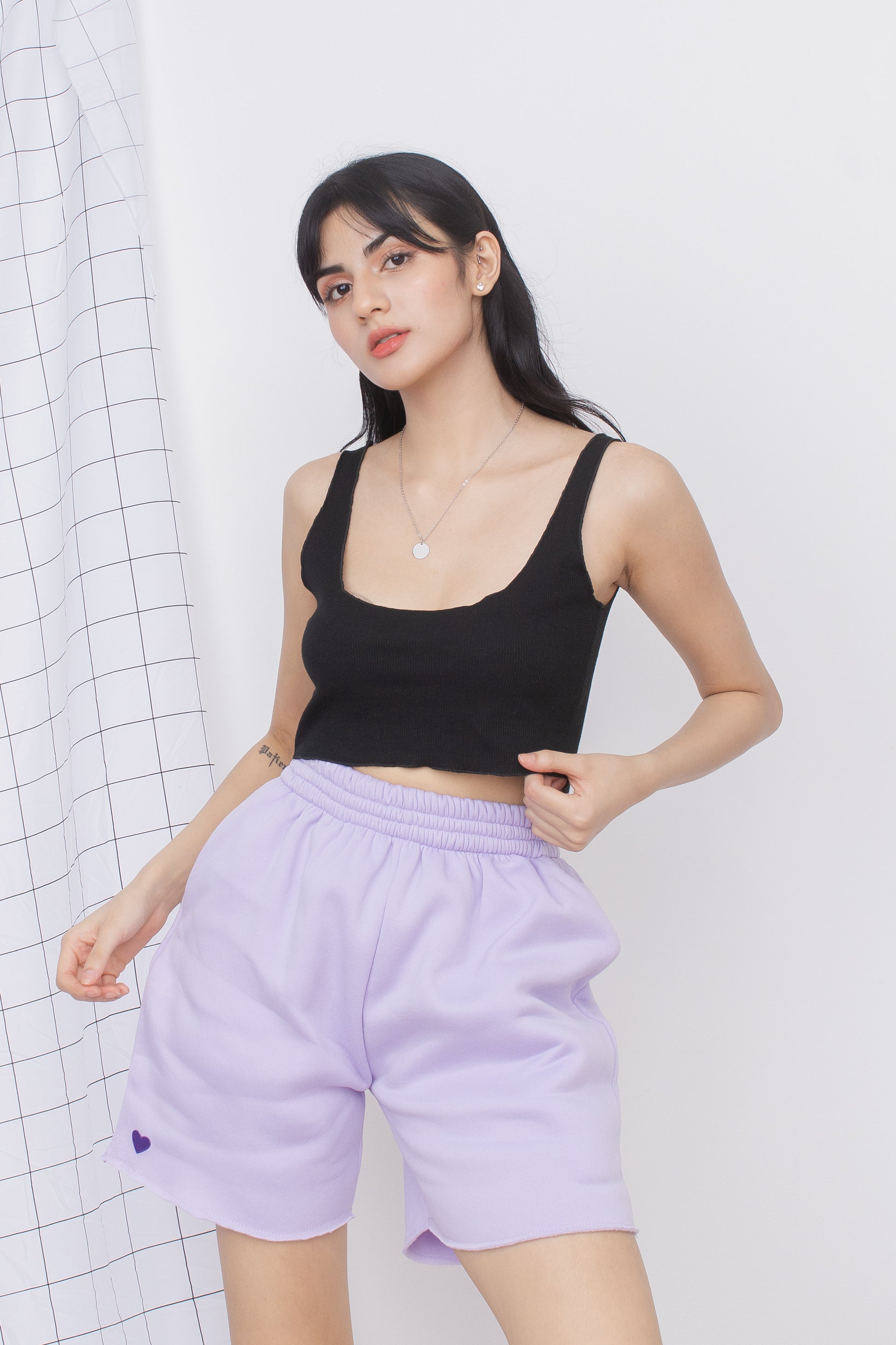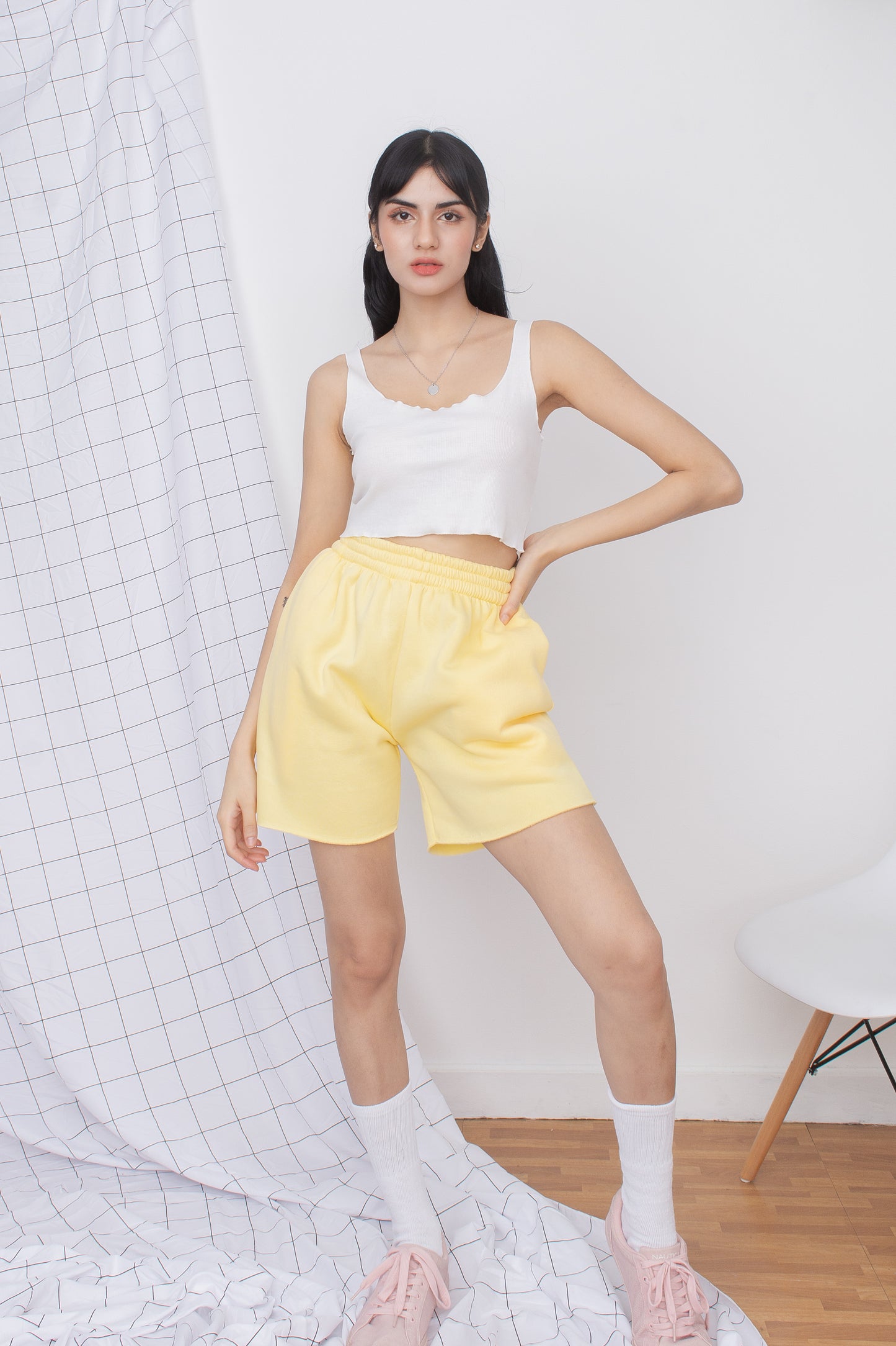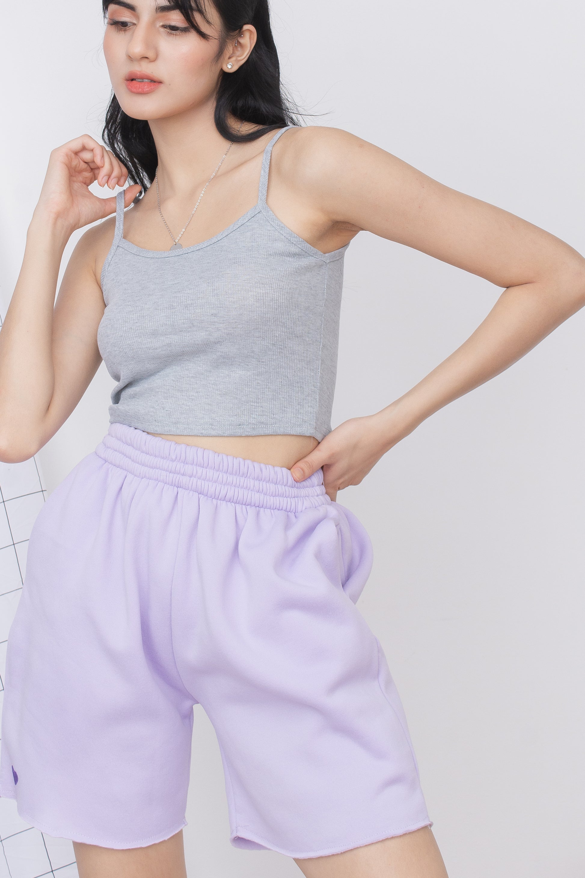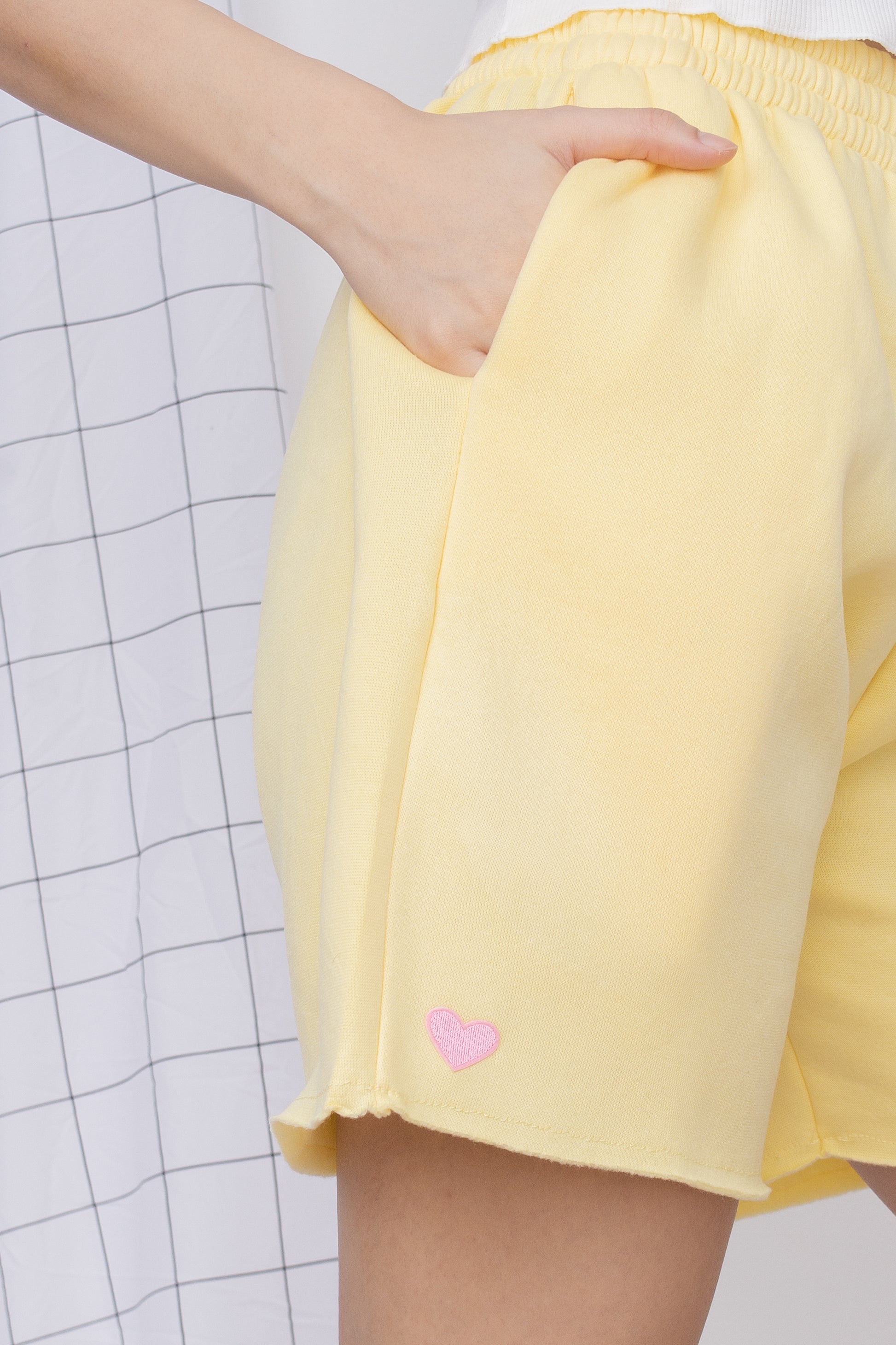A pair of lounge shorts featuring elasticized waist, side pockets, and a raw-cut hem.