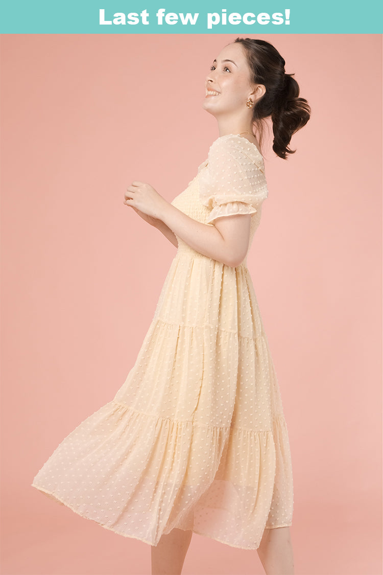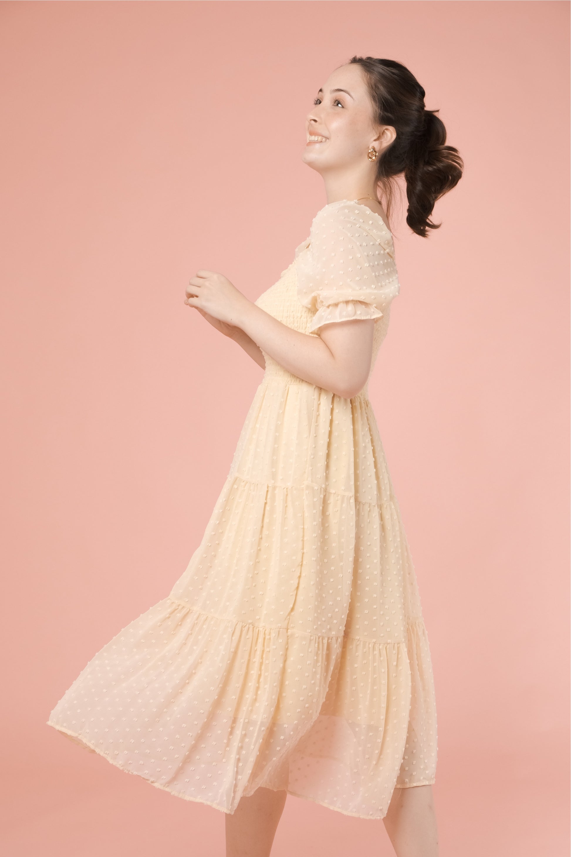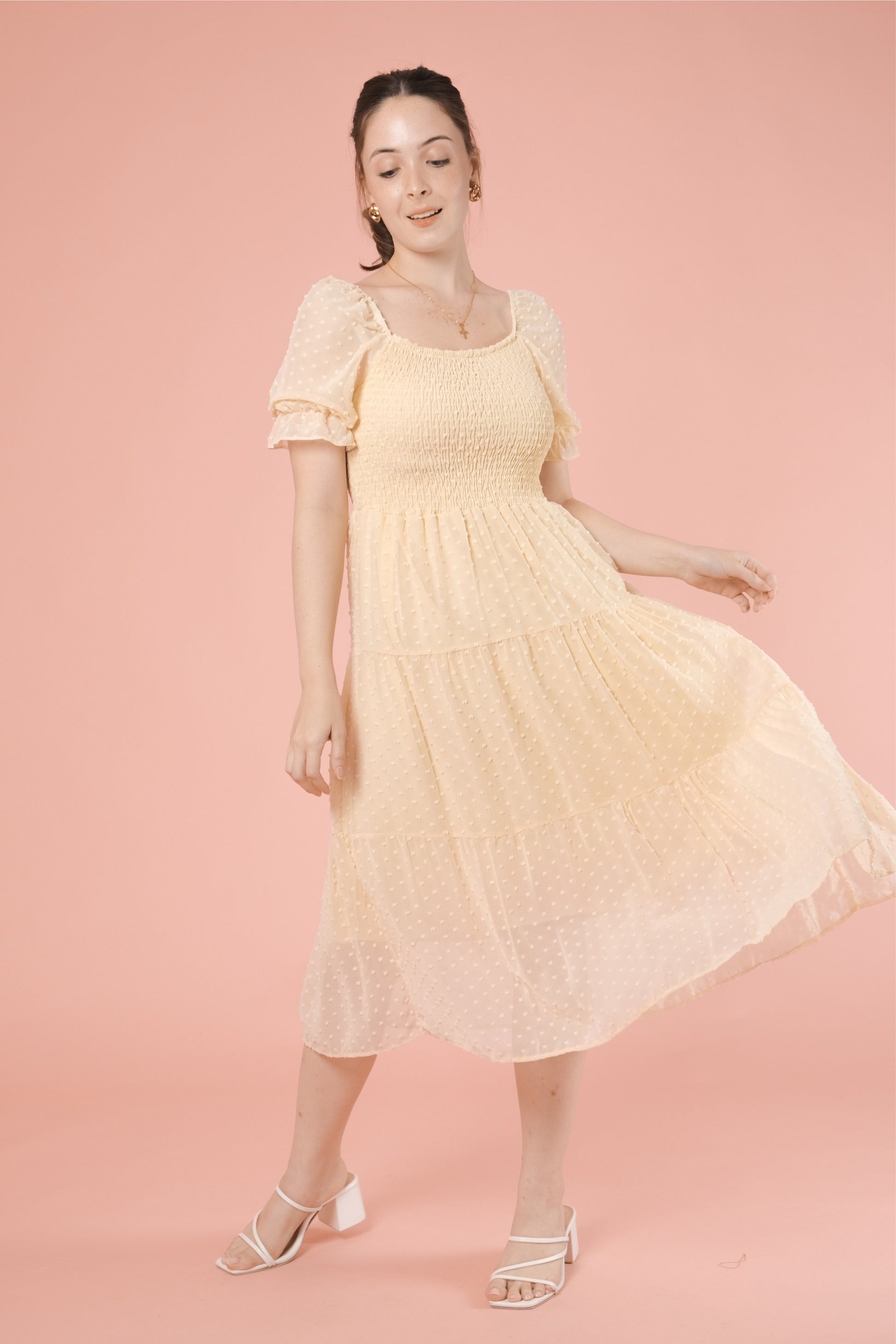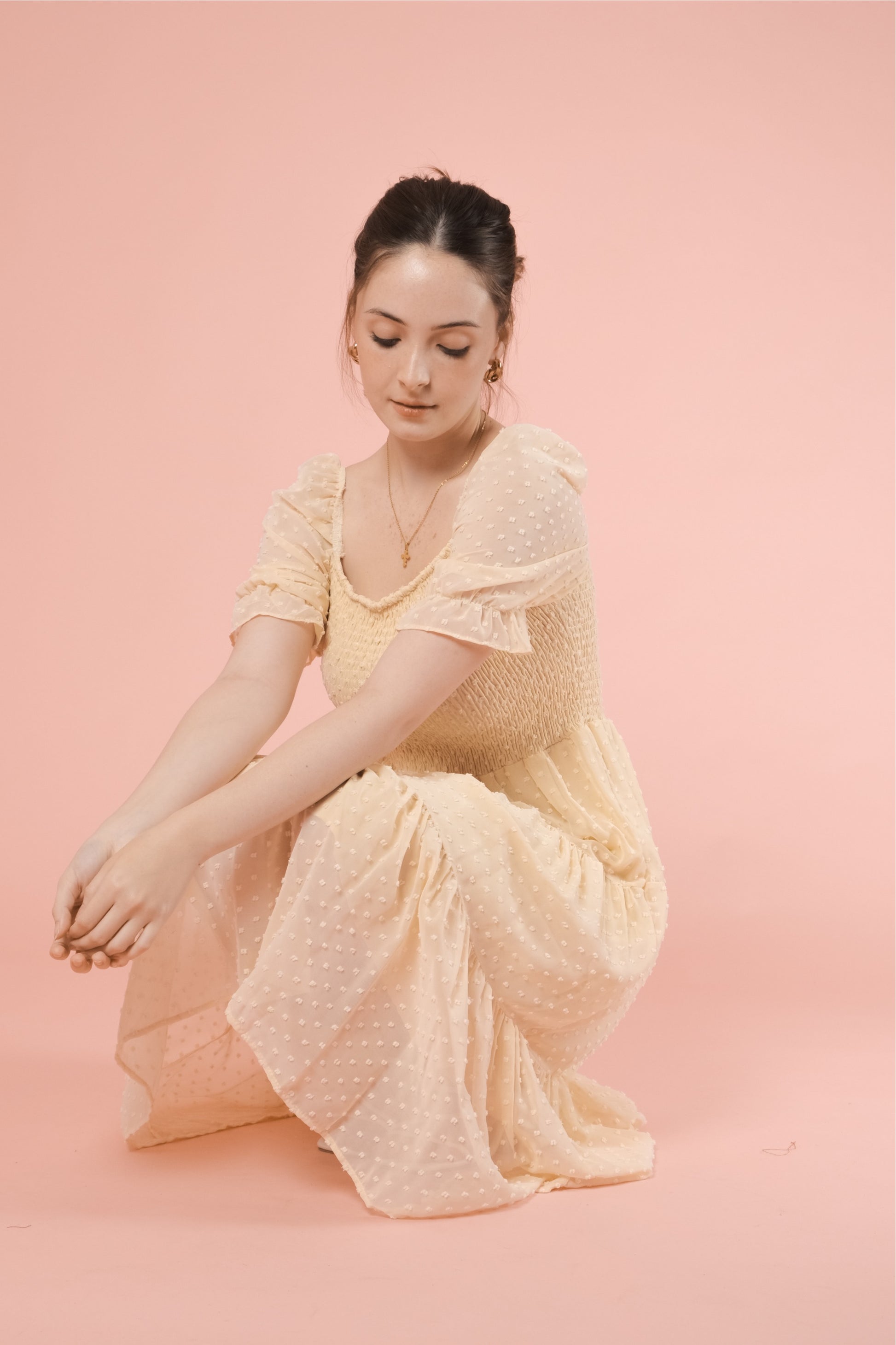 A woven dress featuring square neckline, short sheer puff sleeves, smocked bodice, fully lined (bottom), and flowy silhouette.