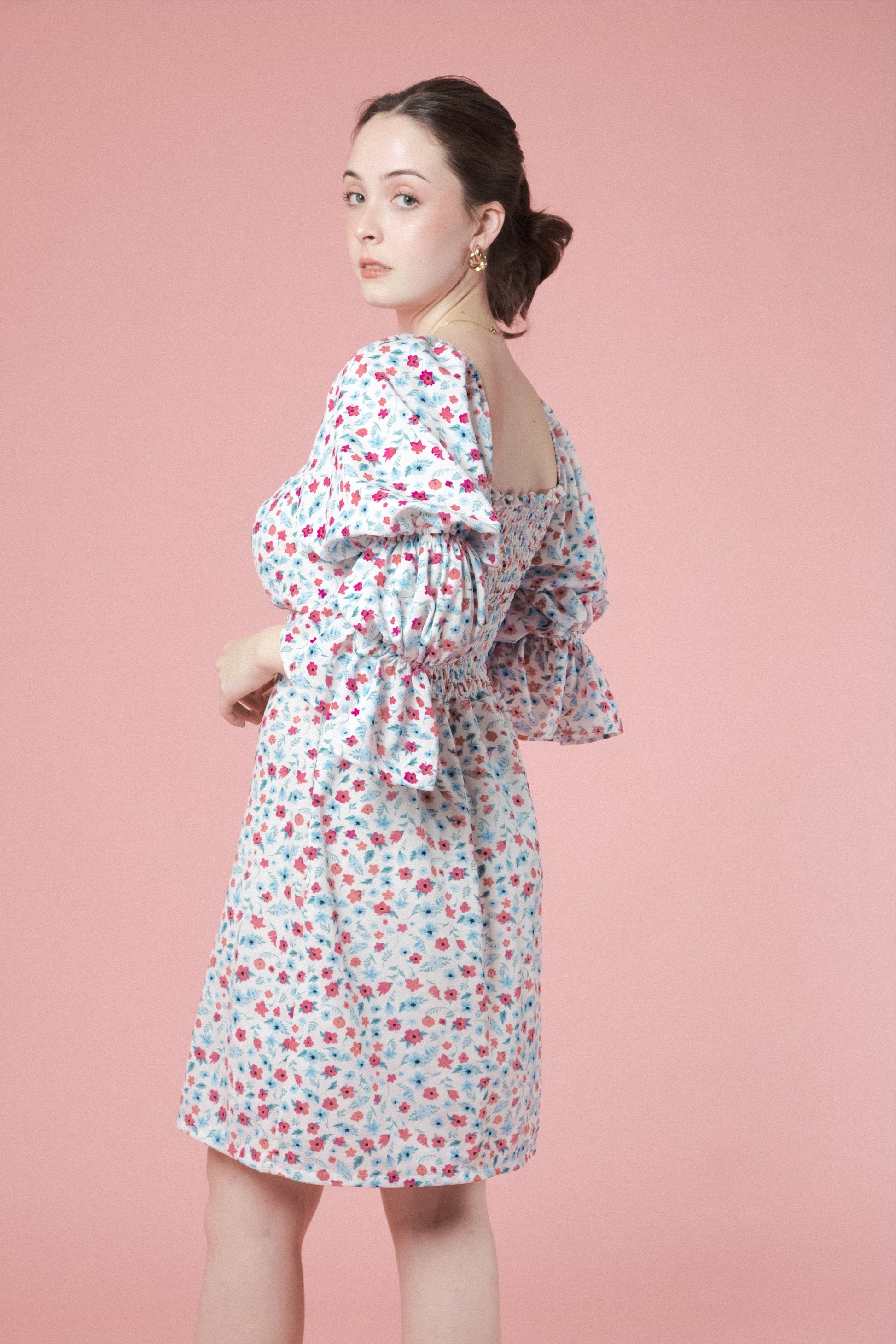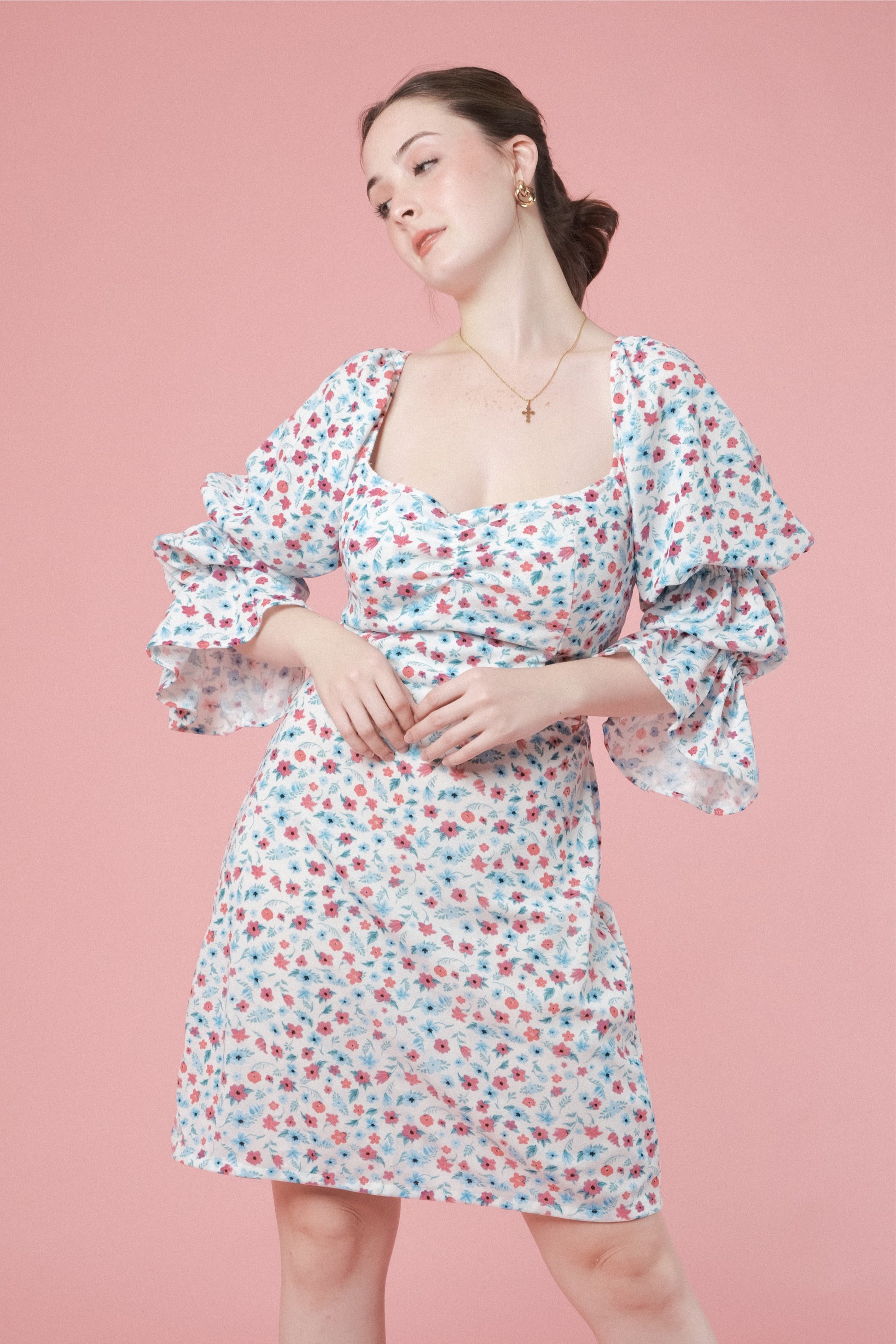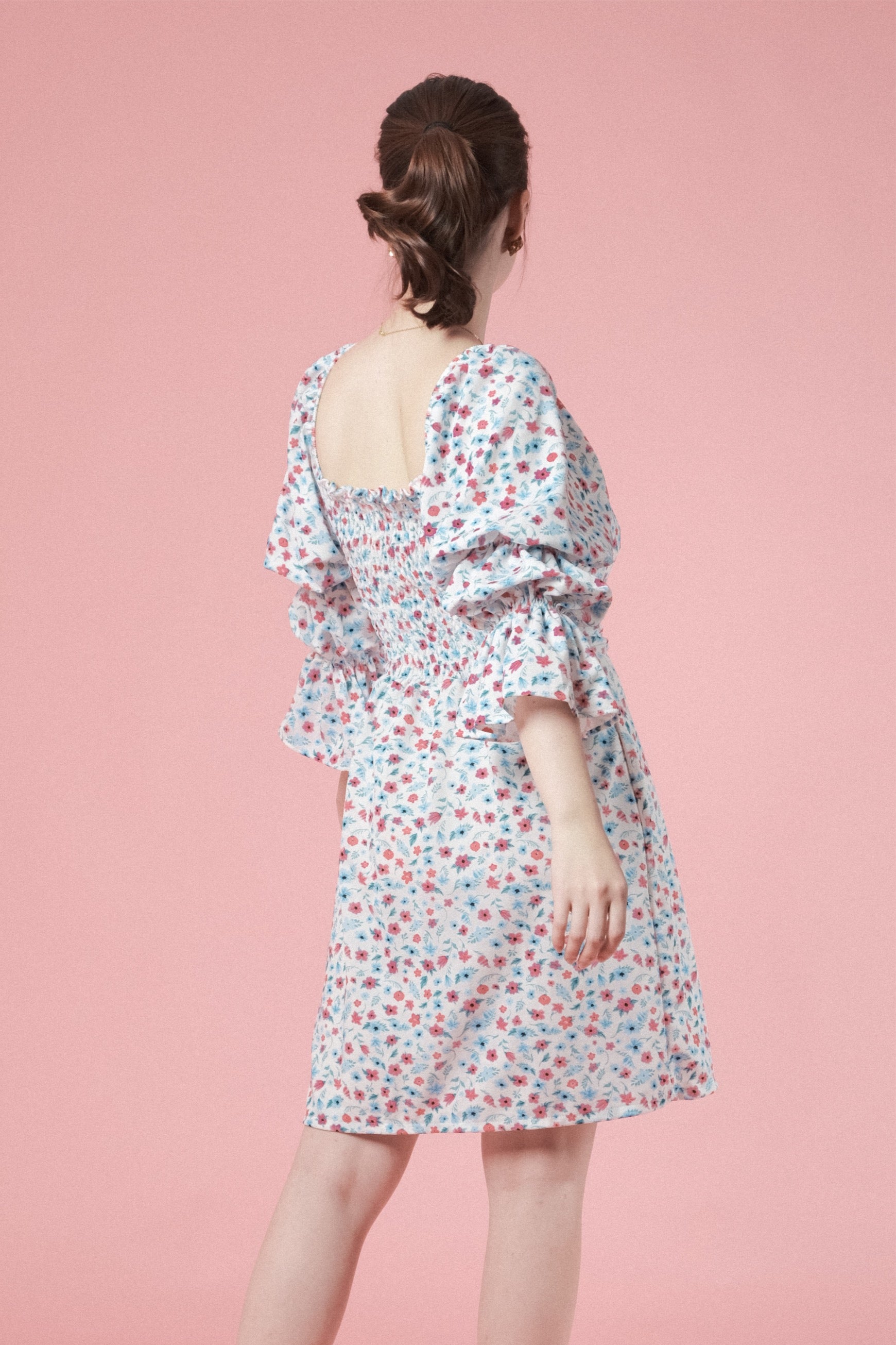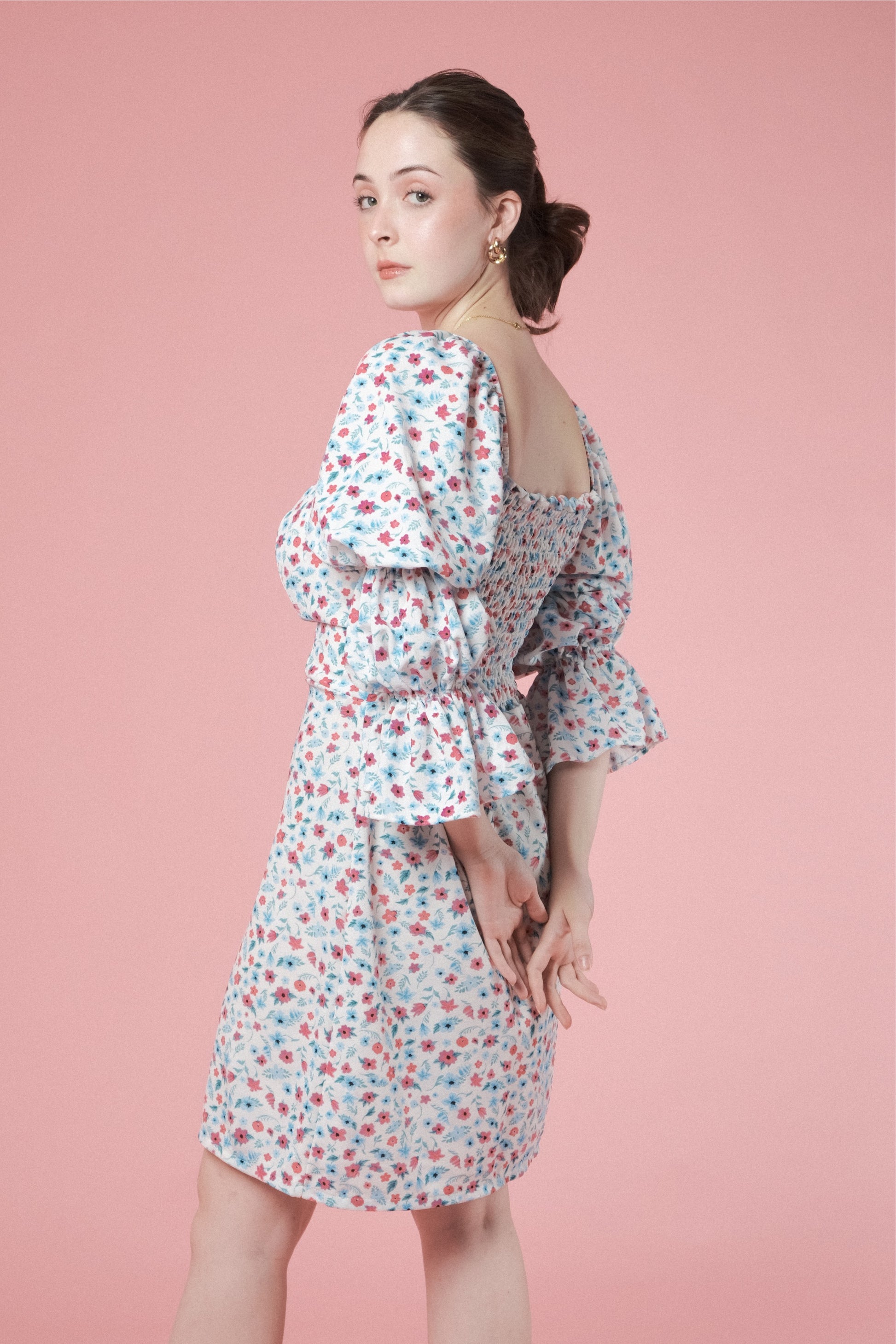 A woven dress featuring ruched sweetheart neckline, bell puff sleeves, smocked back and floral print all over.