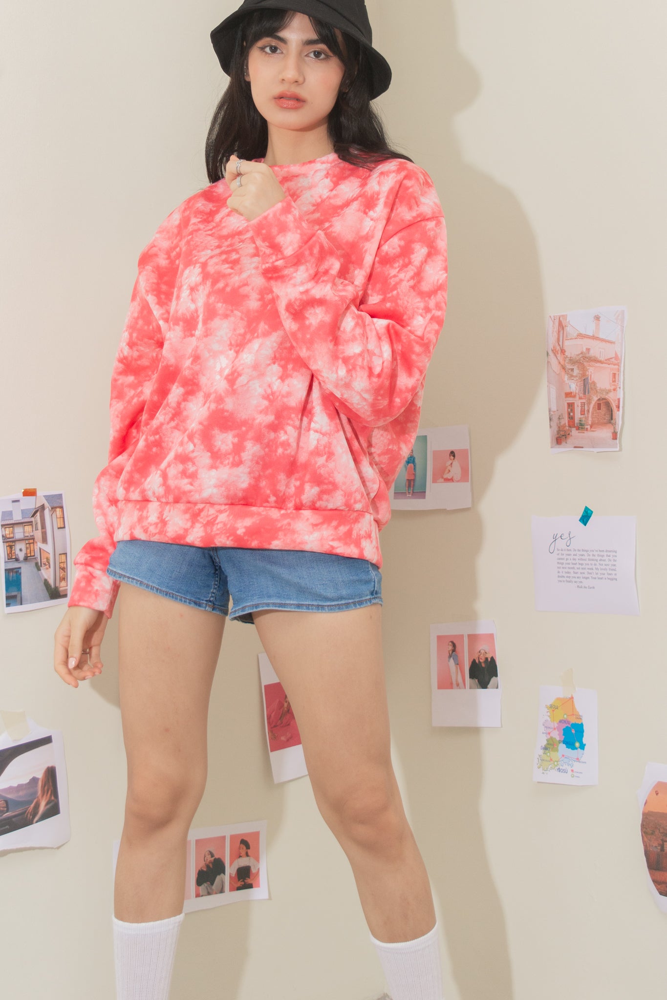 A woven tie-dye wash sweater featuring scoop neckline, dropped shoulders, and long sleeves.