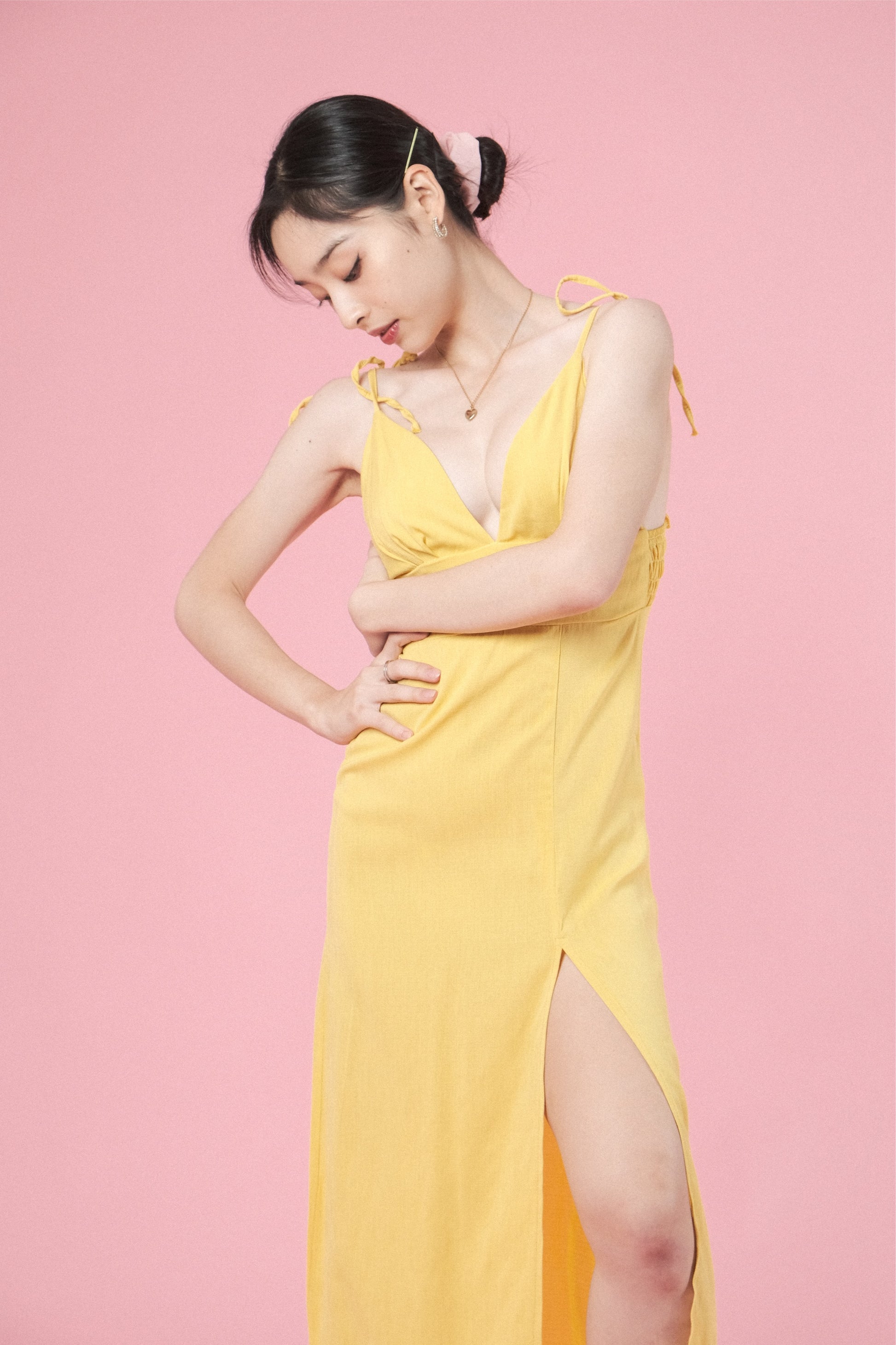A woven maxi dress featuring V neckline, self-tie cami straps, concealed back zipper, smocked back chestline, and high slit.