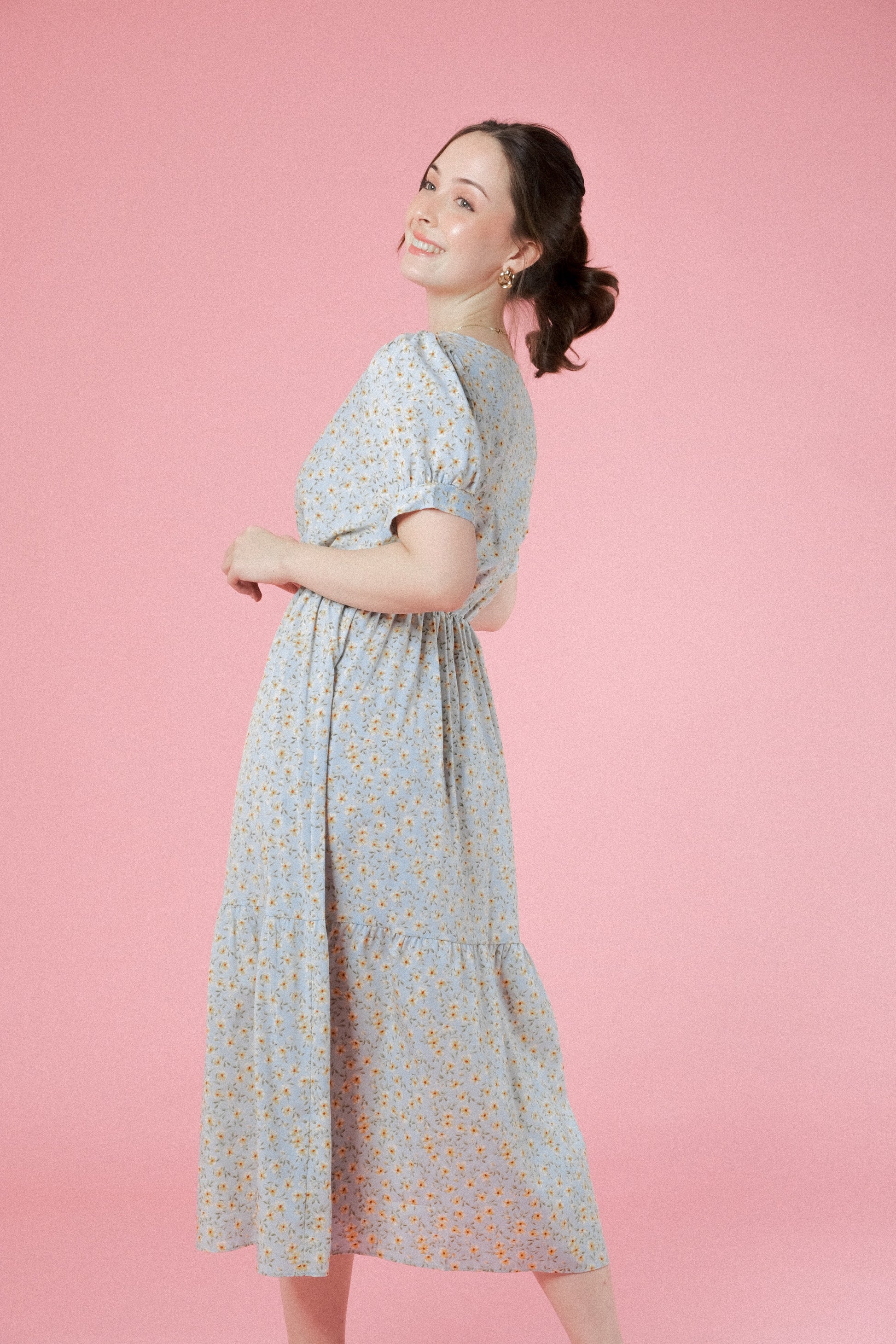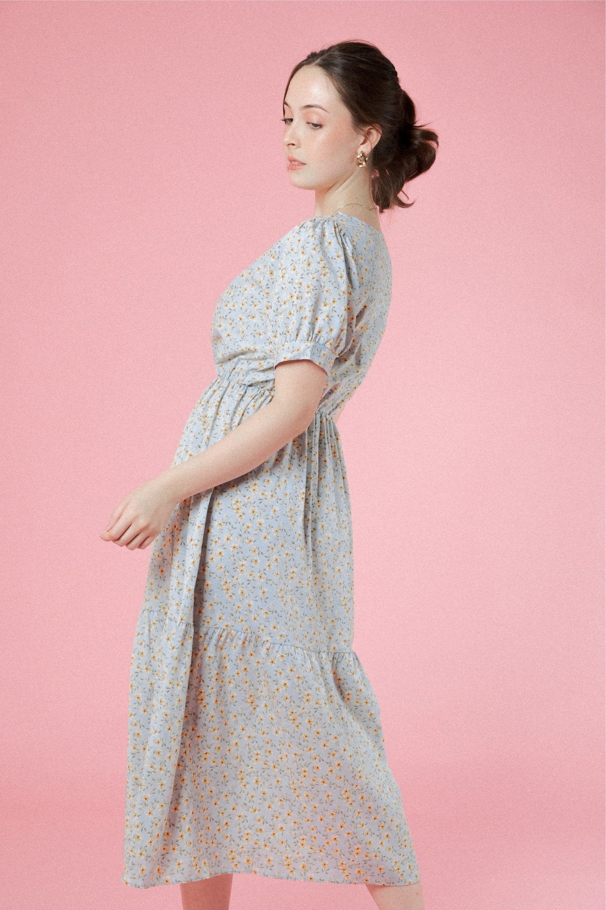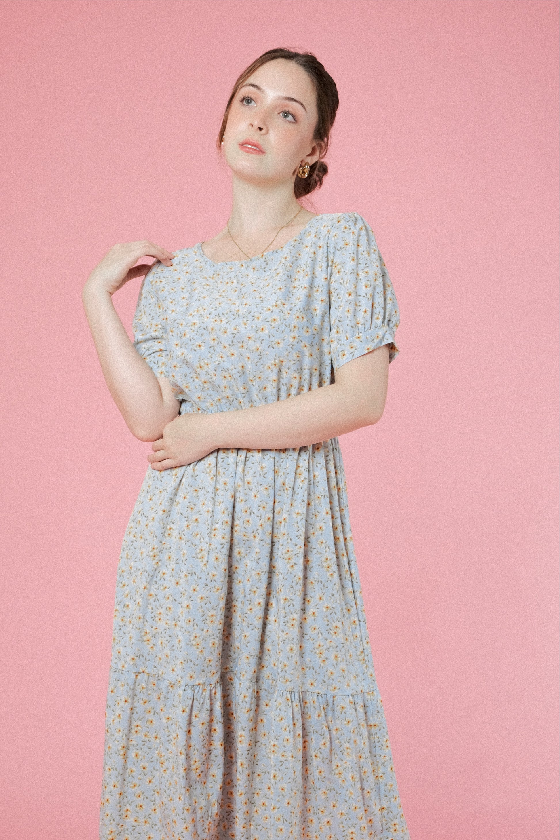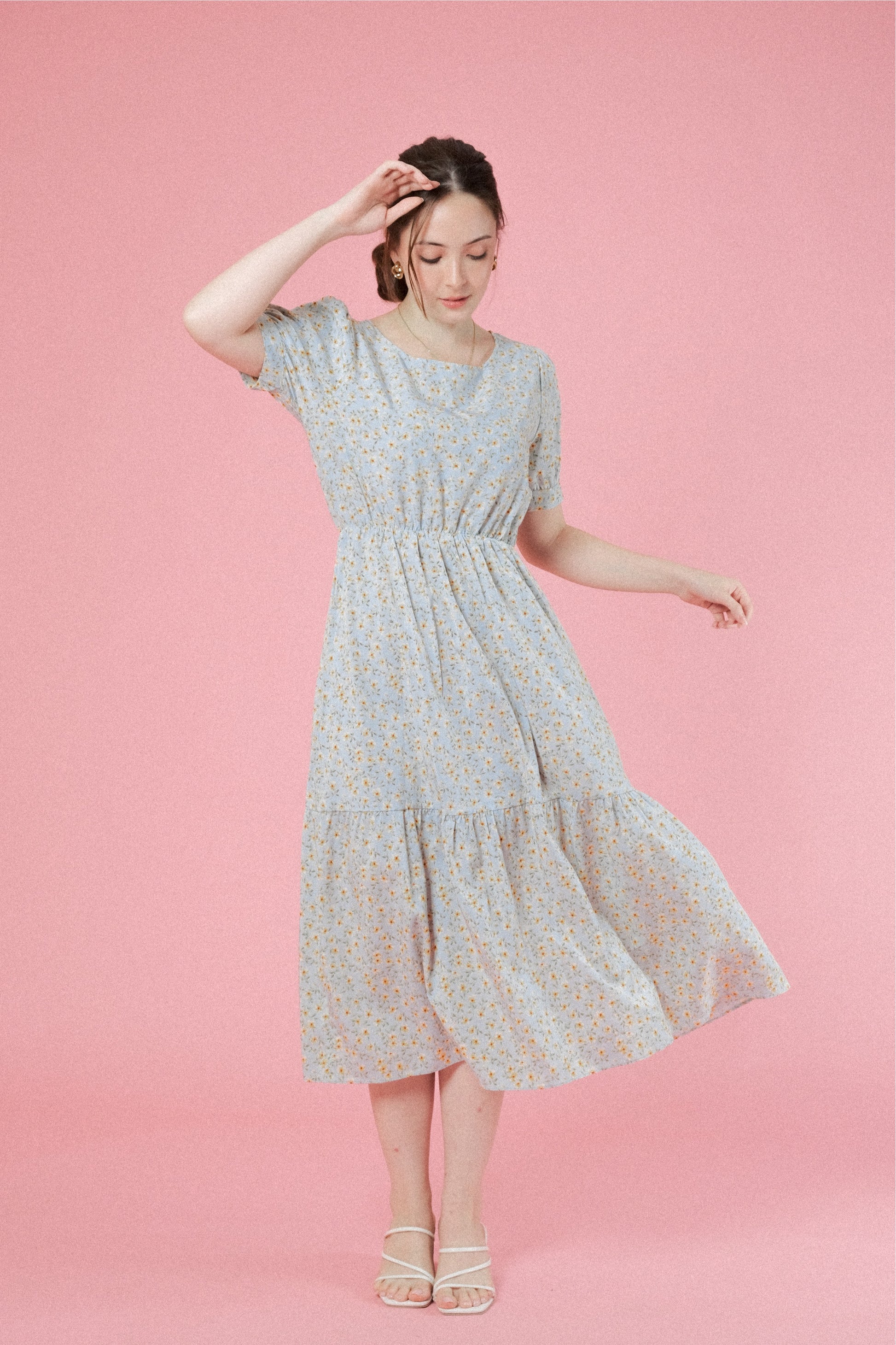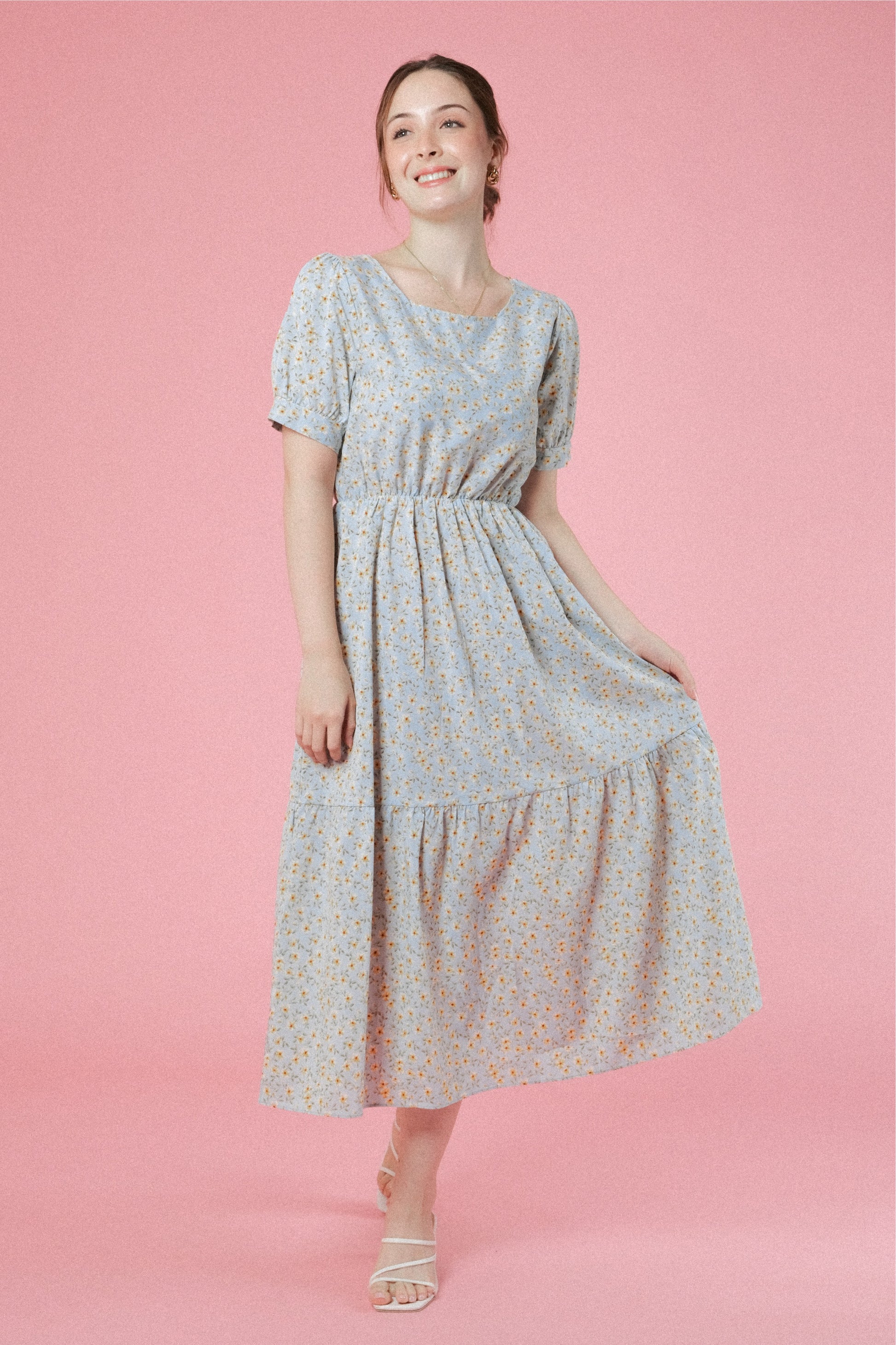 A woven dress featuring scoop neckline, short puff sleeves, elasticized waistline, layered skirt, and flowy silhouette.