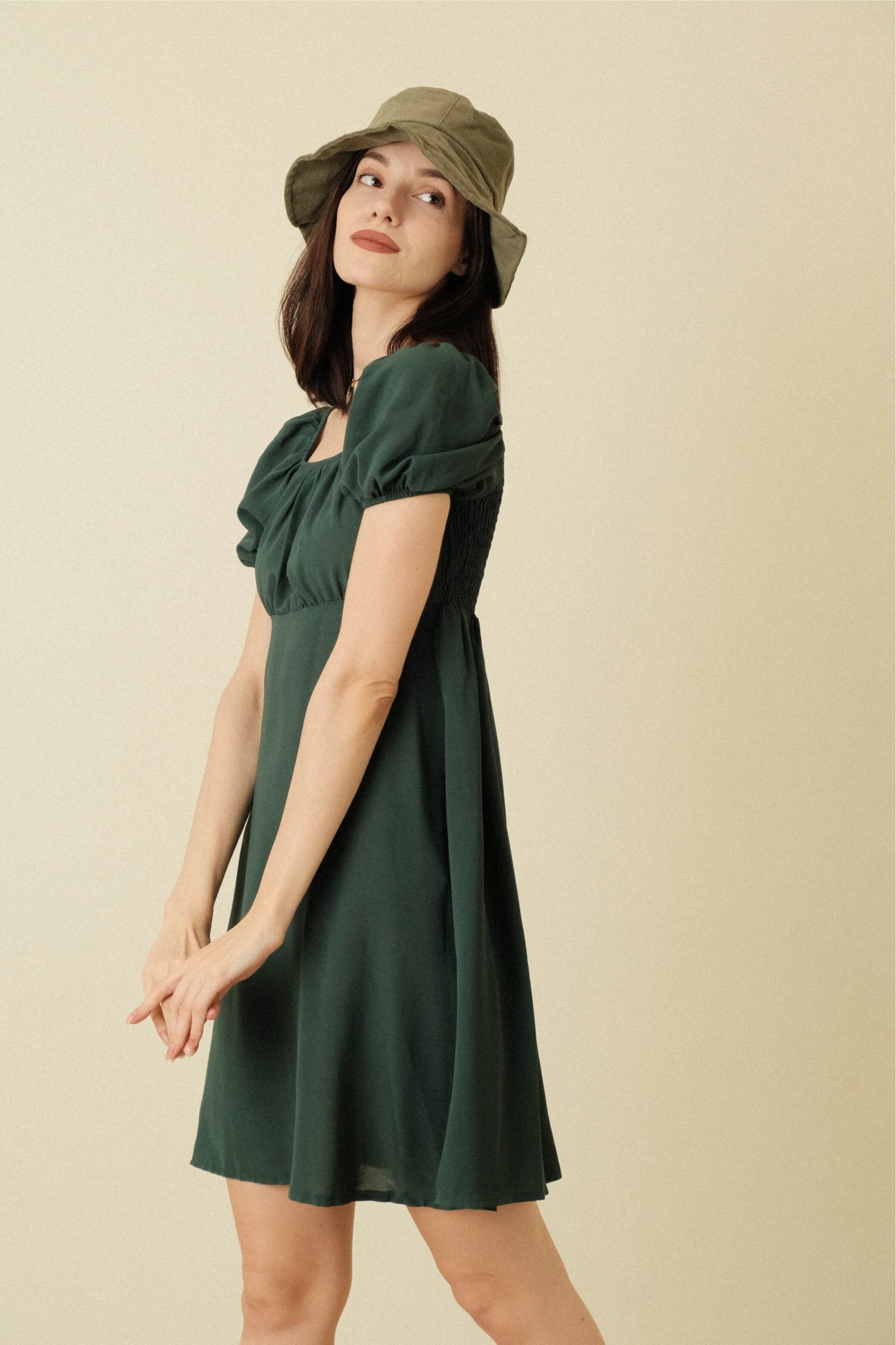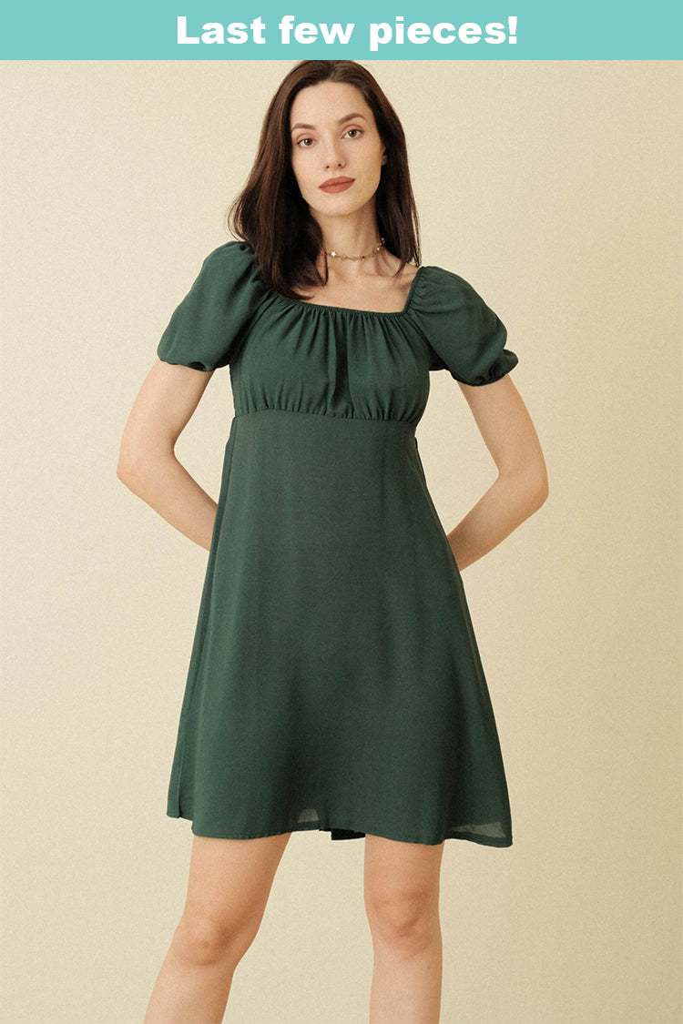 A woven dress featuring smocked bodice, short puff sleeves, lined and flowy silhouette.