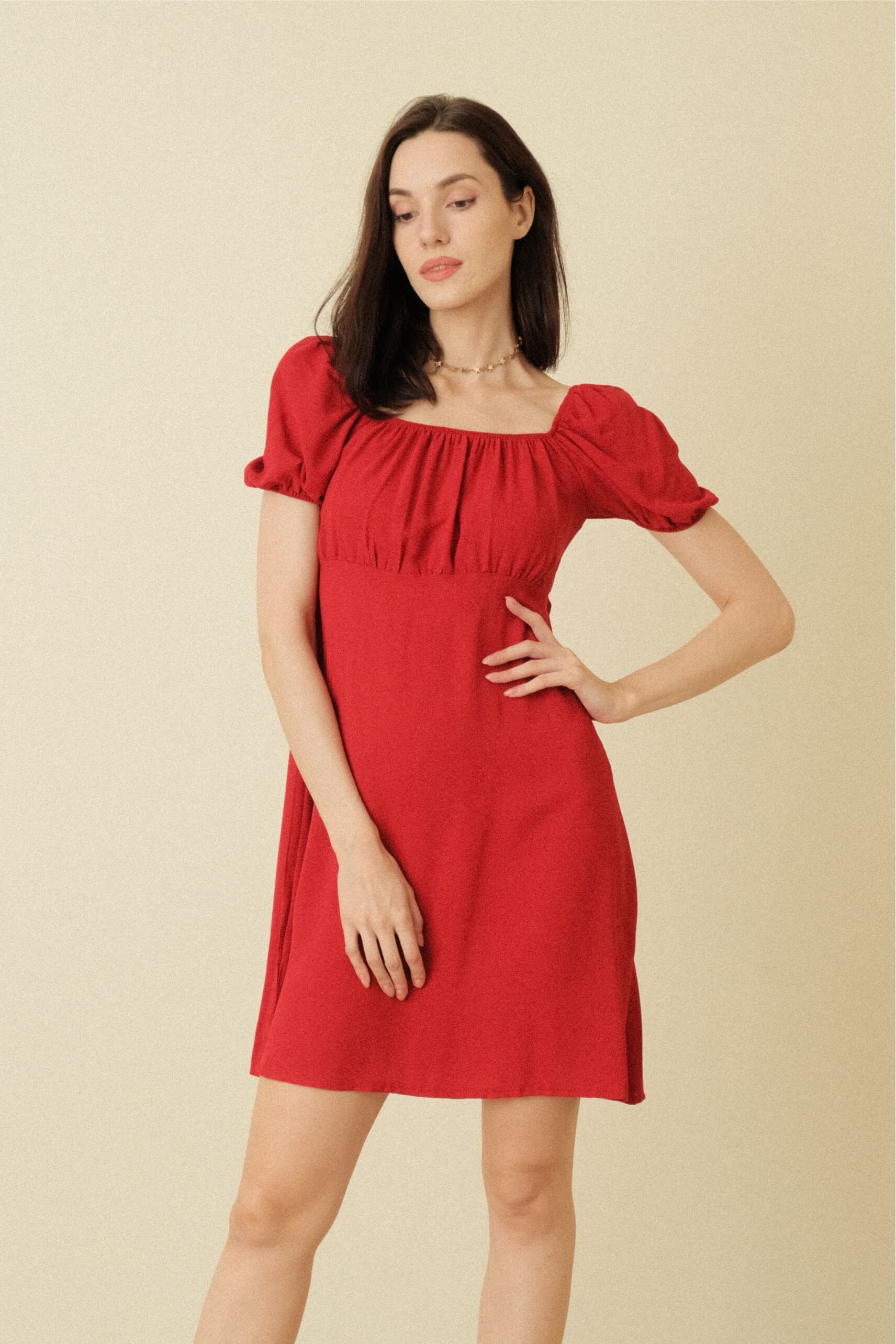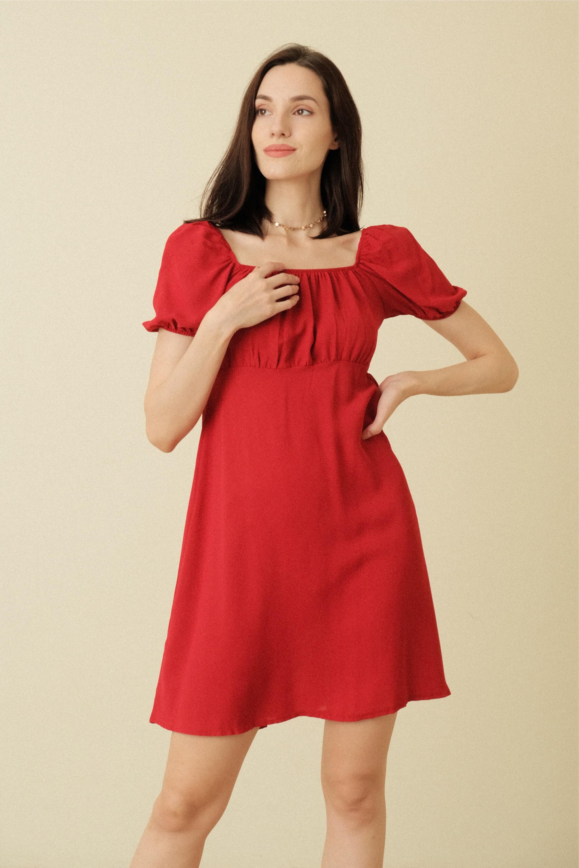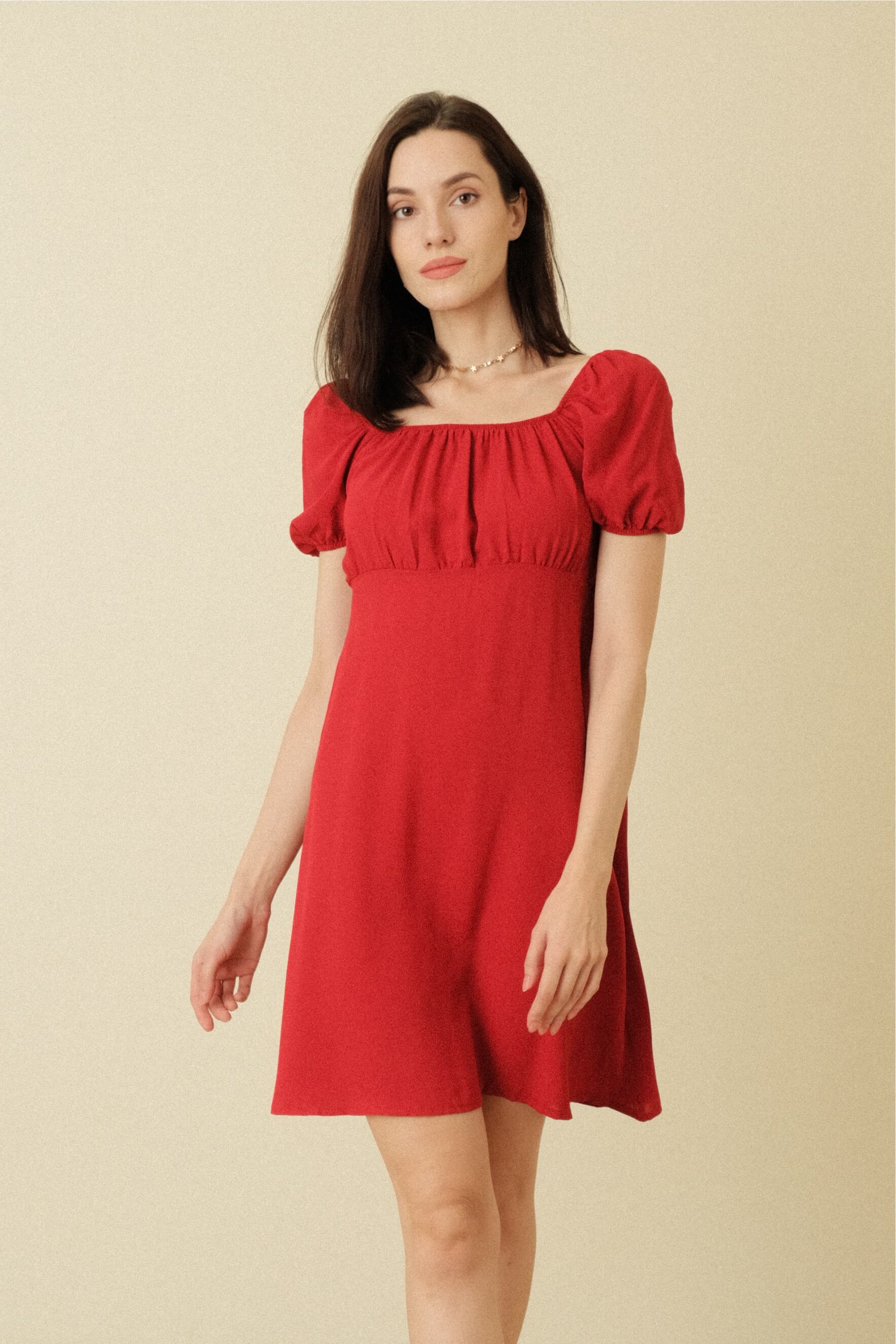 A woven dress featuring smocked bodice, short puff sleeves, lined and flowy silhouette.