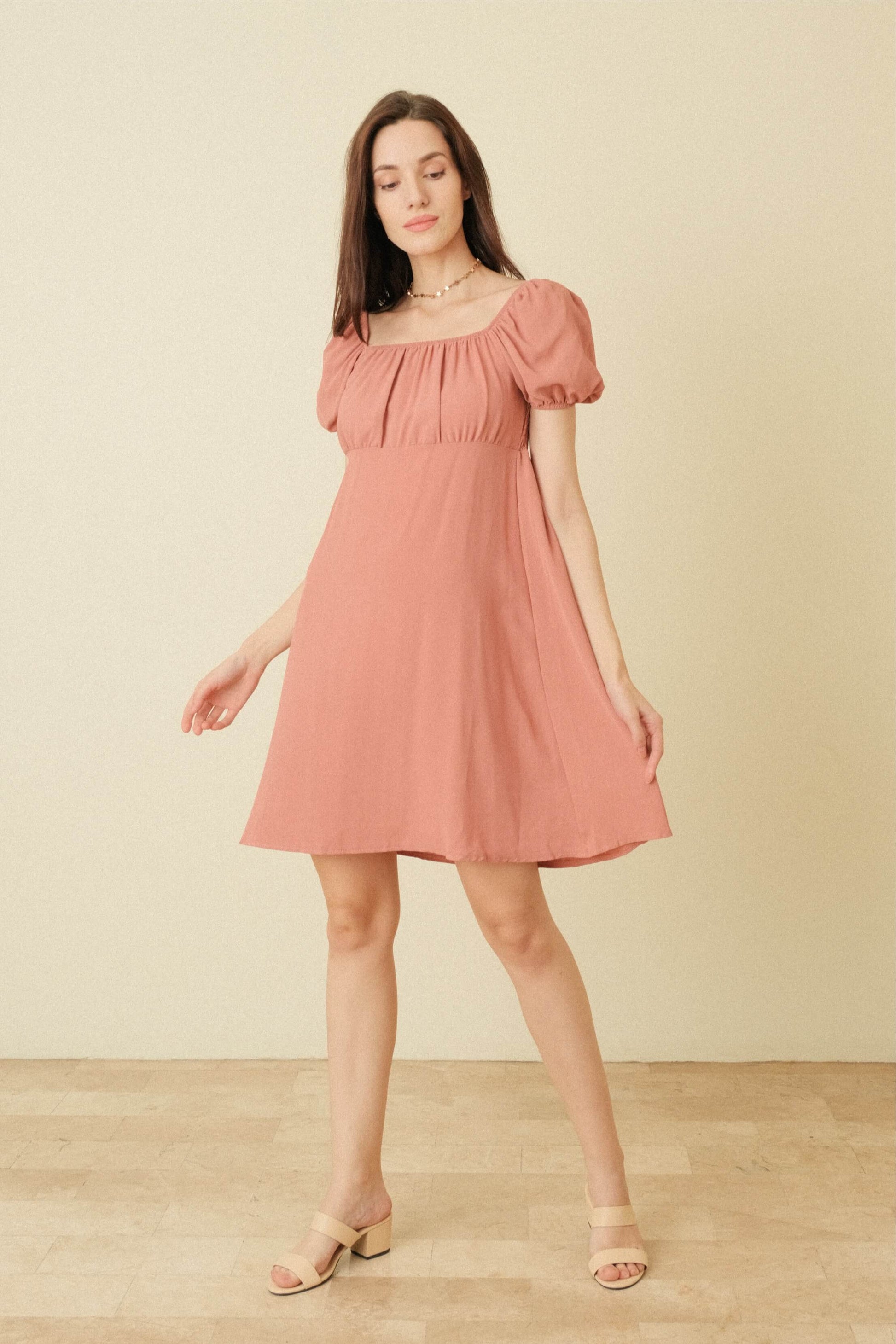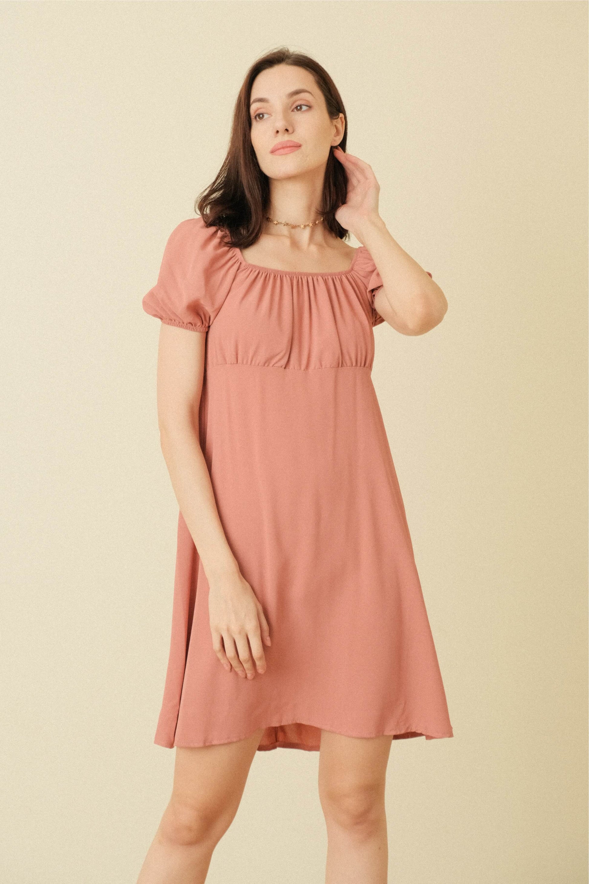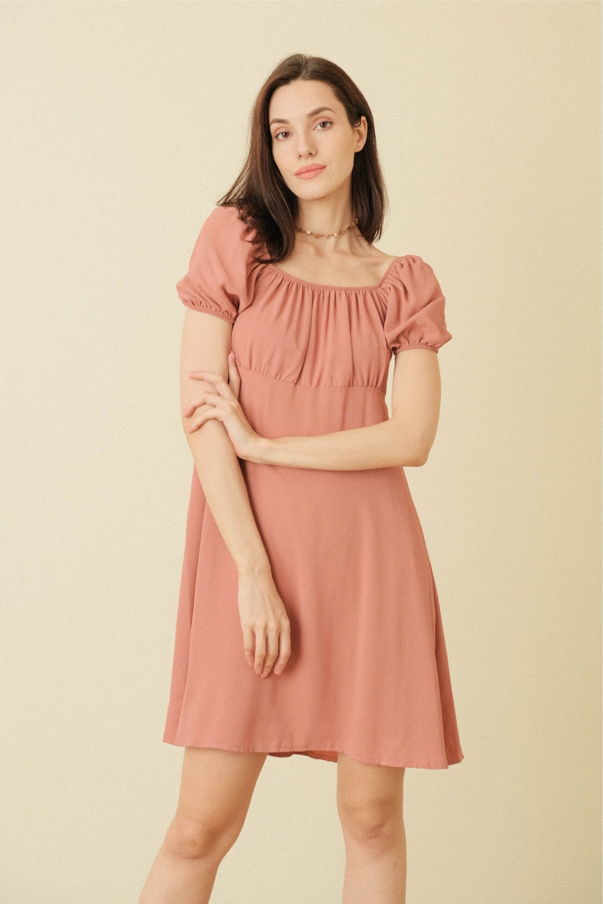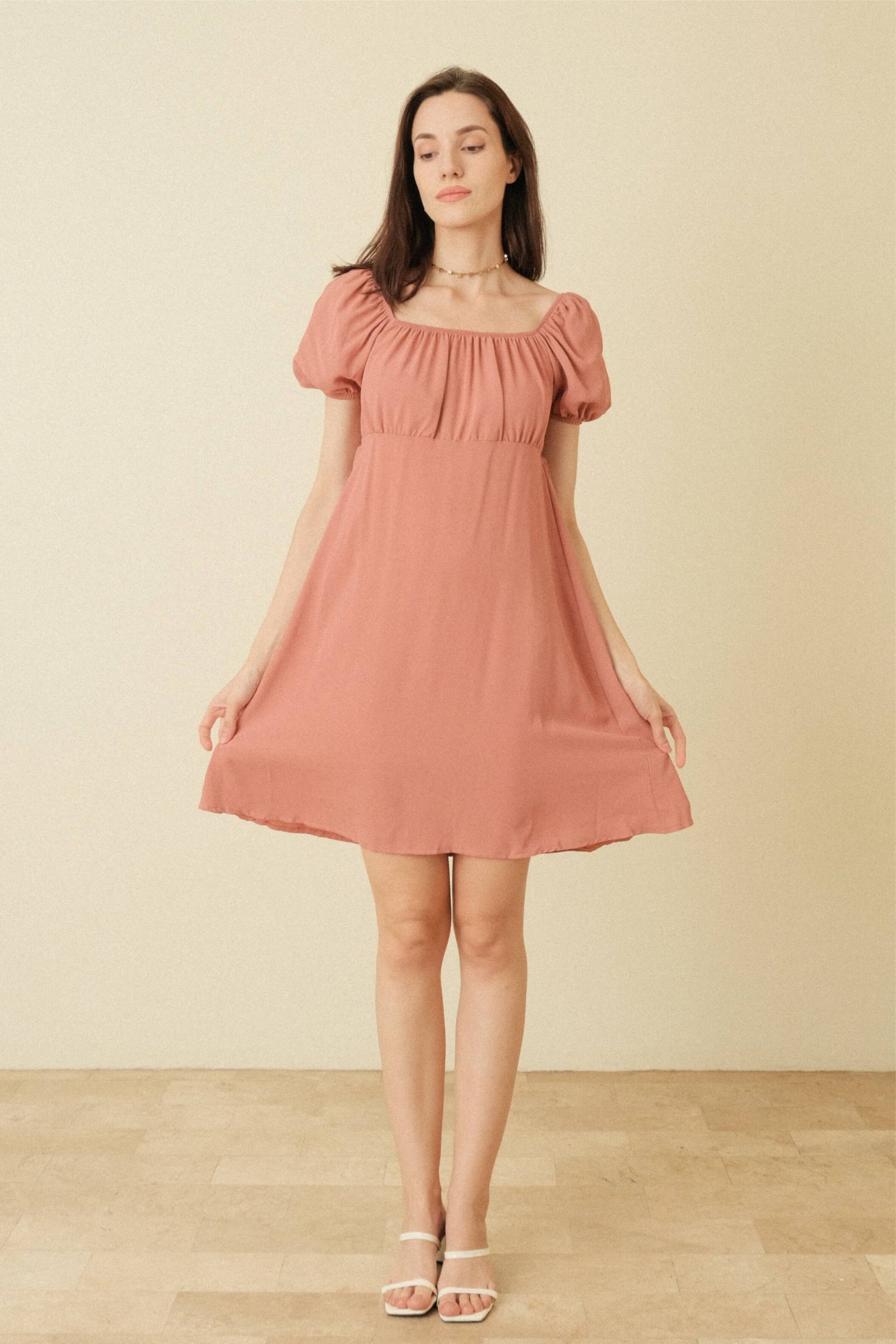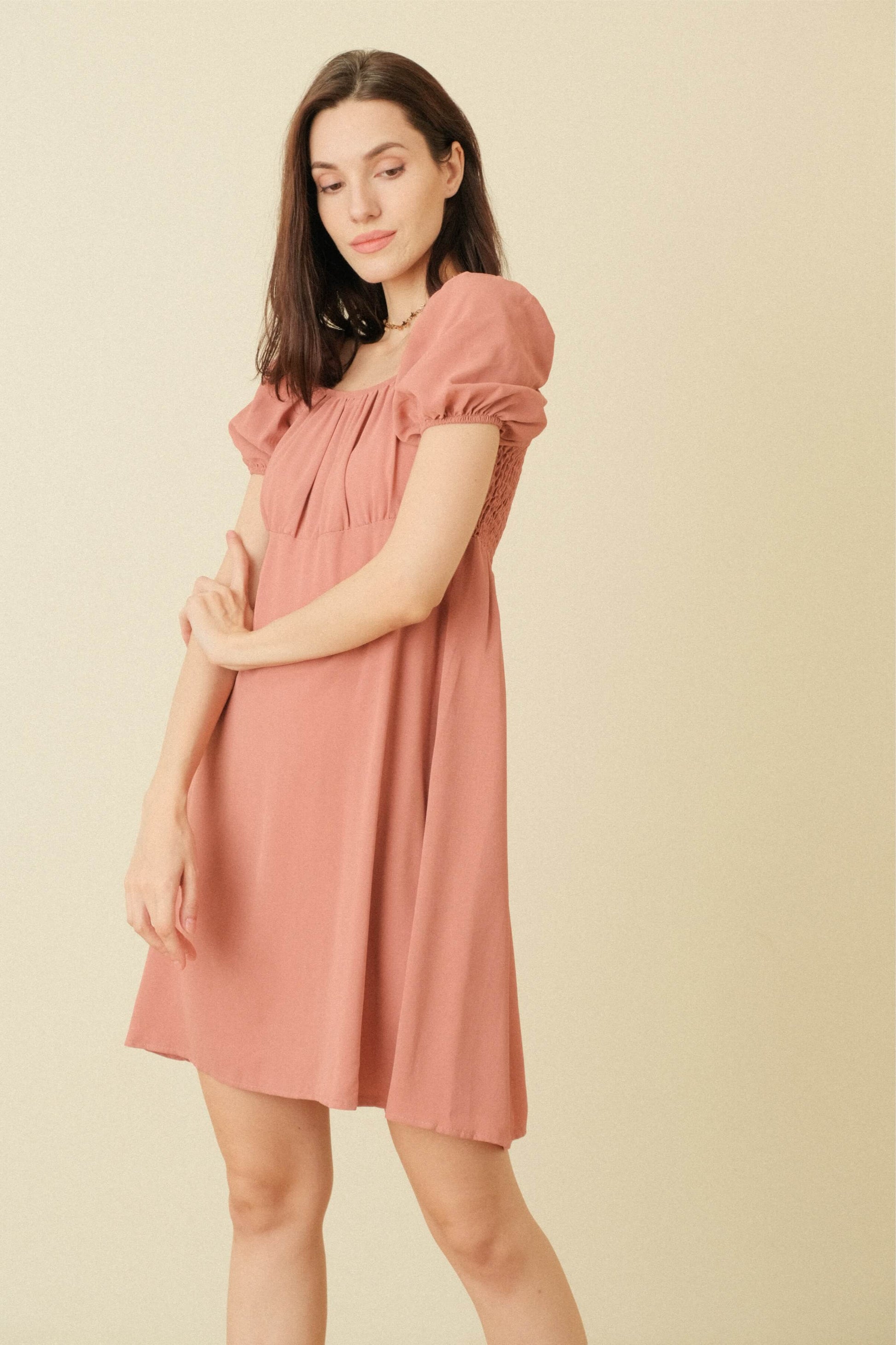 A woven dress featuring smocked bodice, short puff sleeves, lined and flowy silhouette.