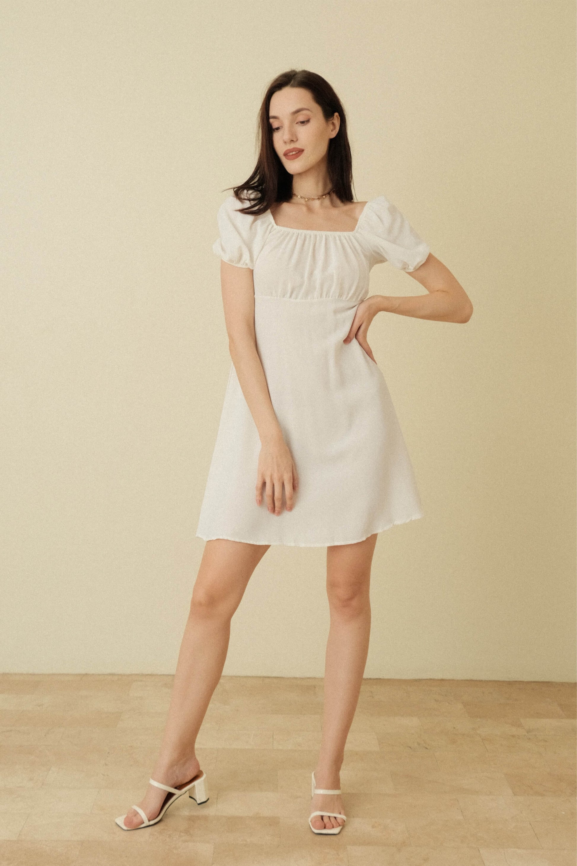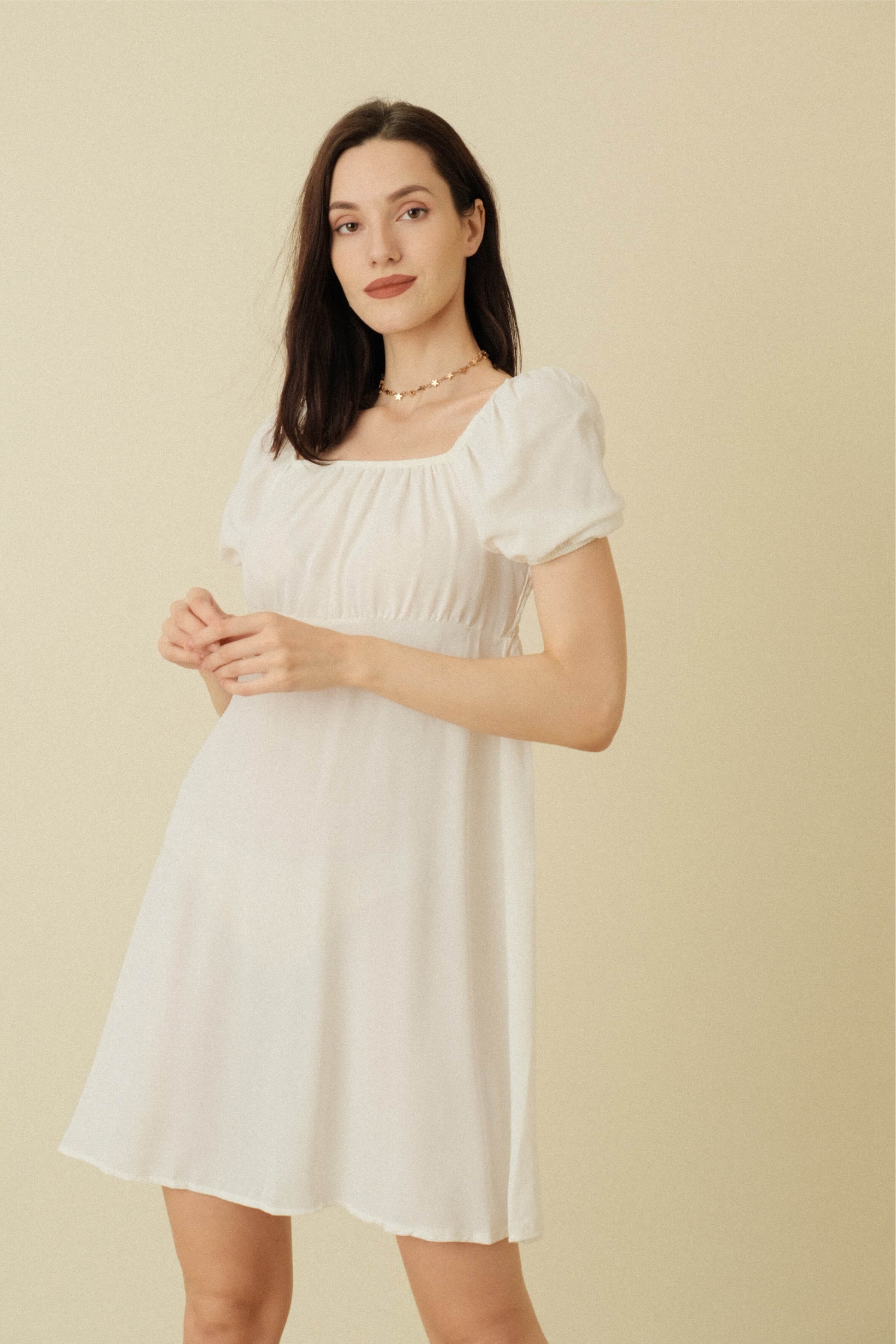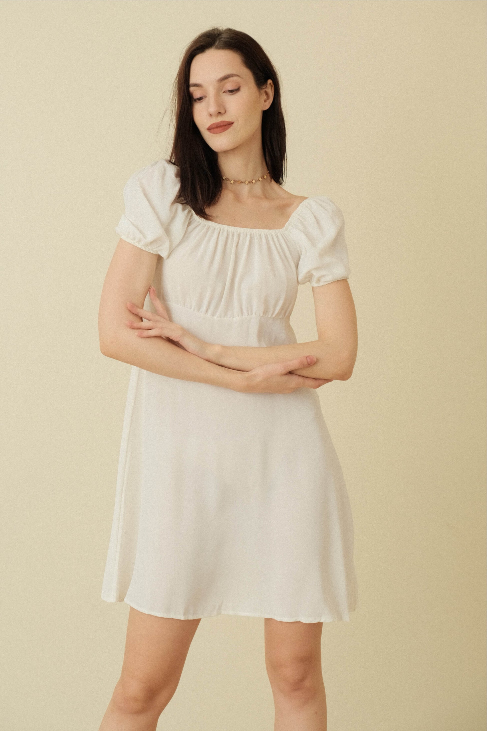 A woven dress featuring smocked bodice, short puff sleeves, lined and flowy silhouette.
