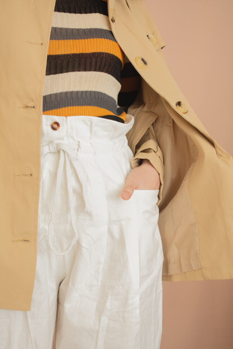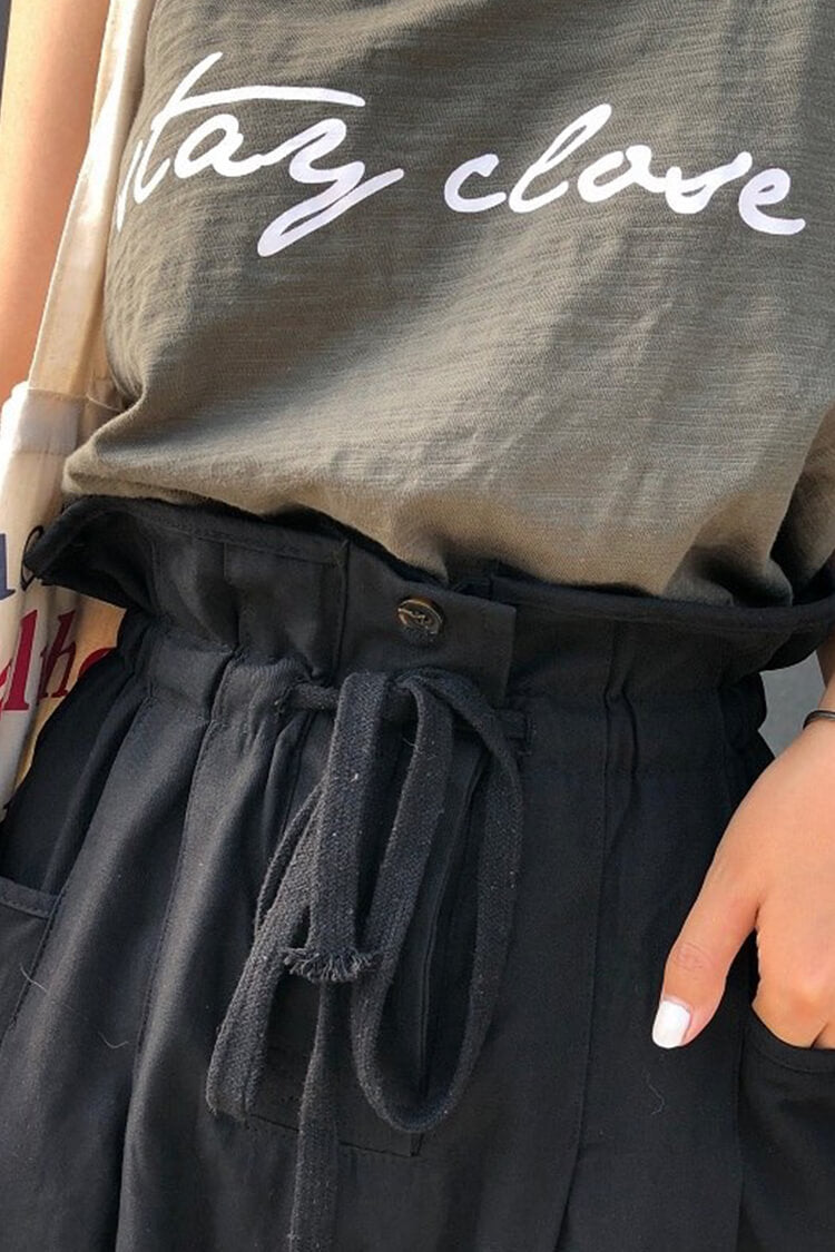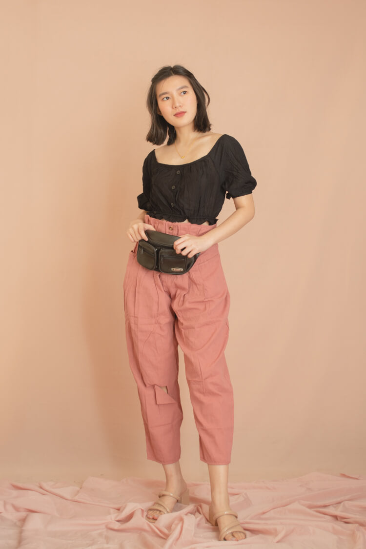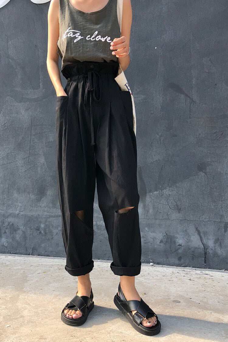 A pair of woven high-waist pants featuring a ruffled paperbag waist with button closure and self-tie fastening, elasticized waist, ripped design and front pockets.