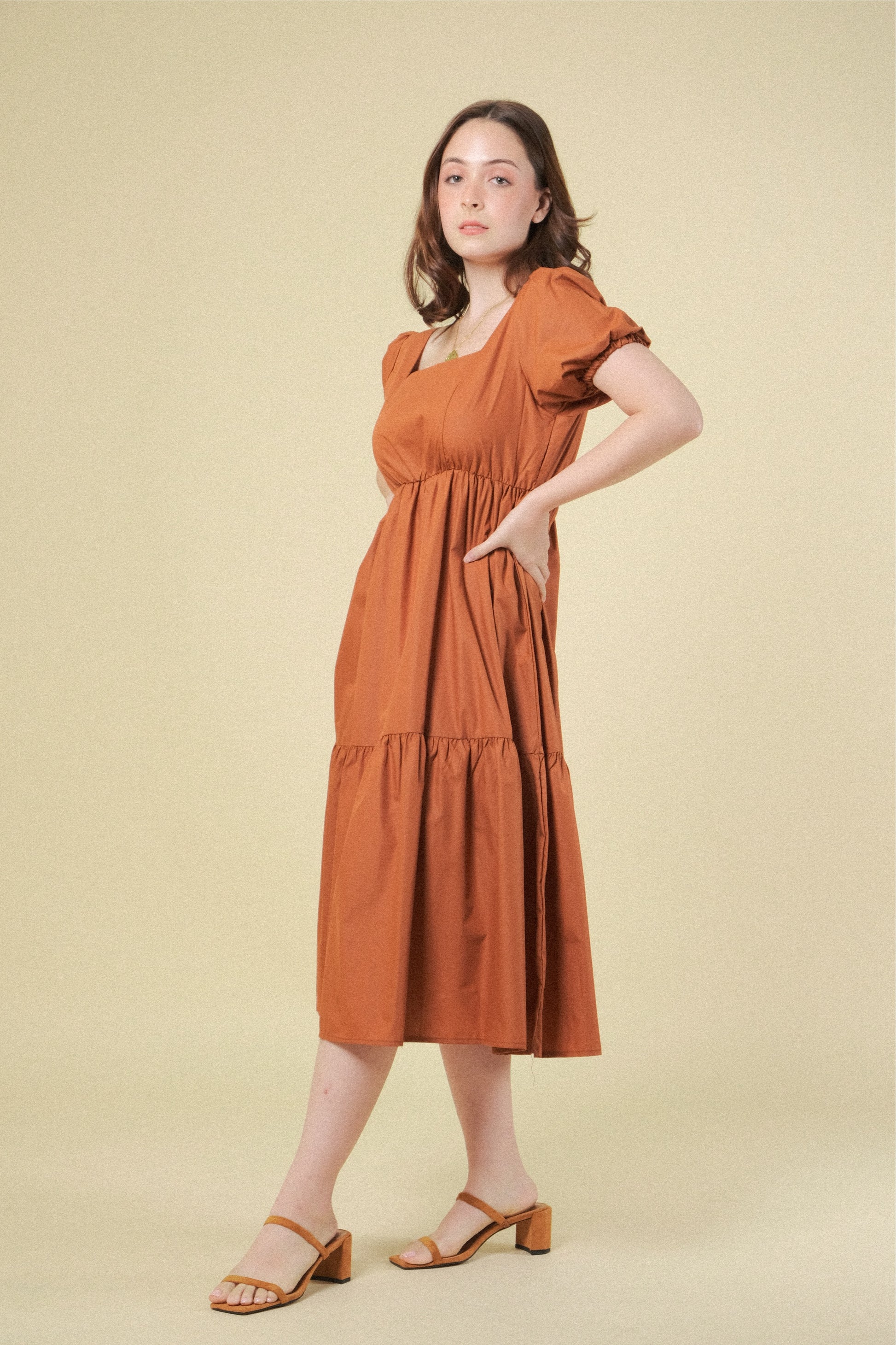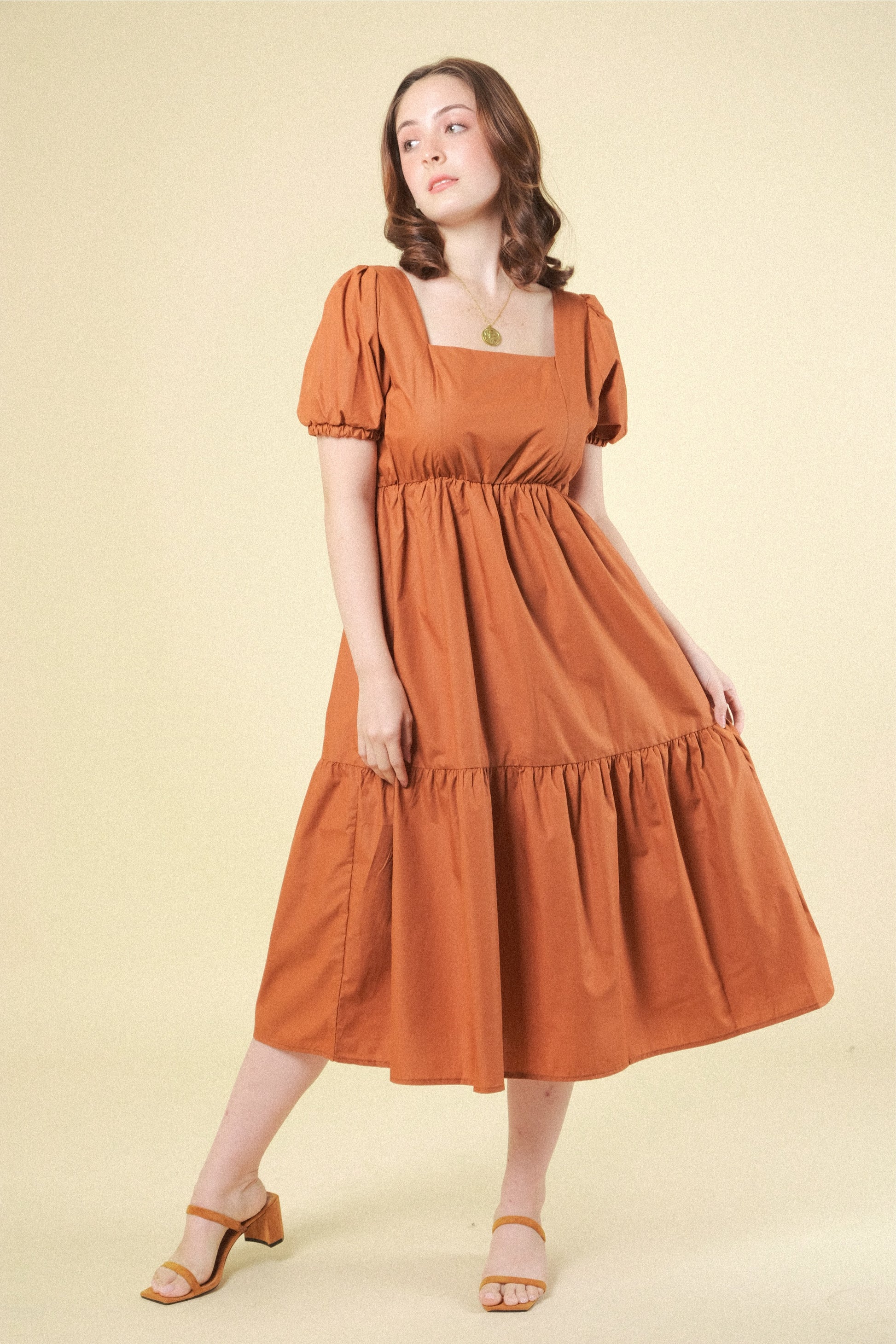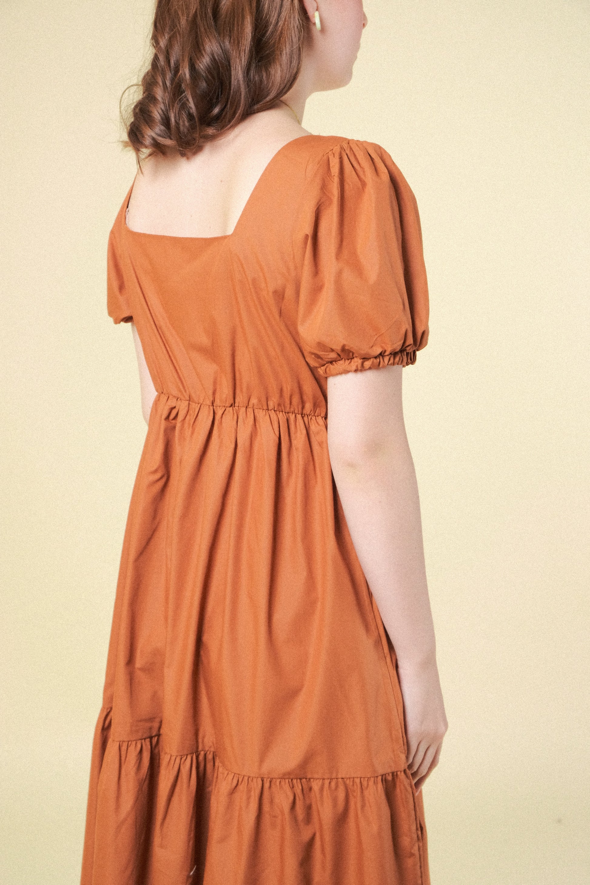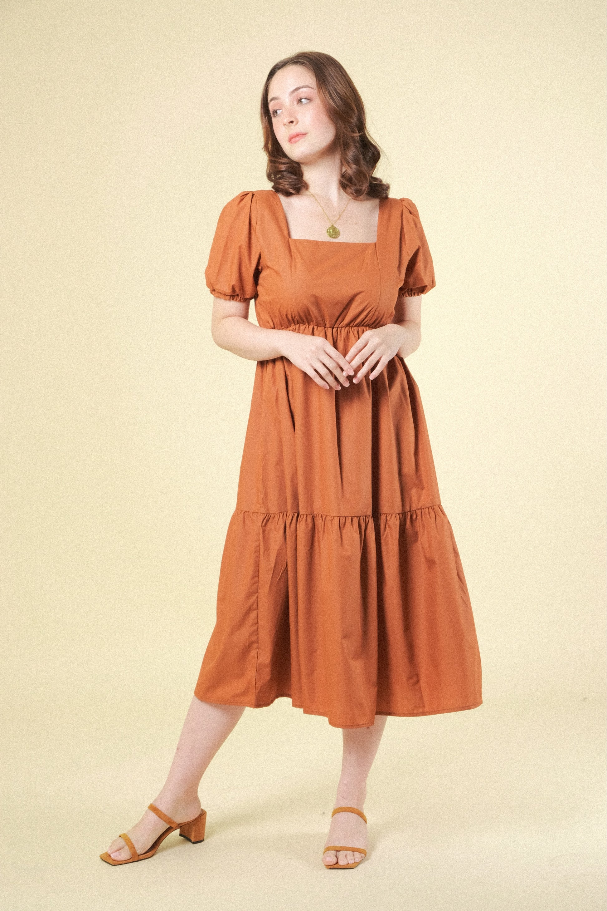 A woven dress featuring square neckline, short puff sleeves and tiered skirt.