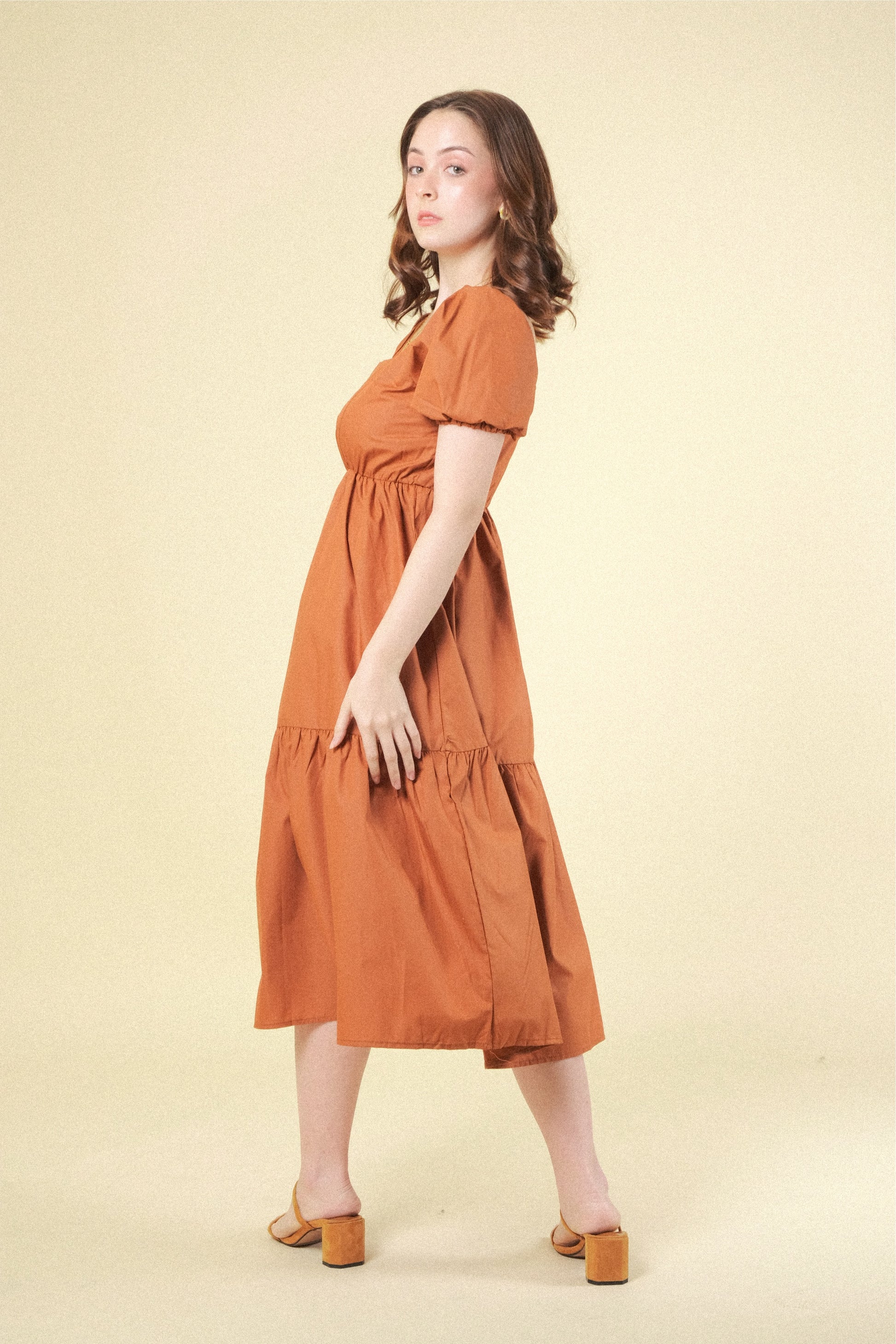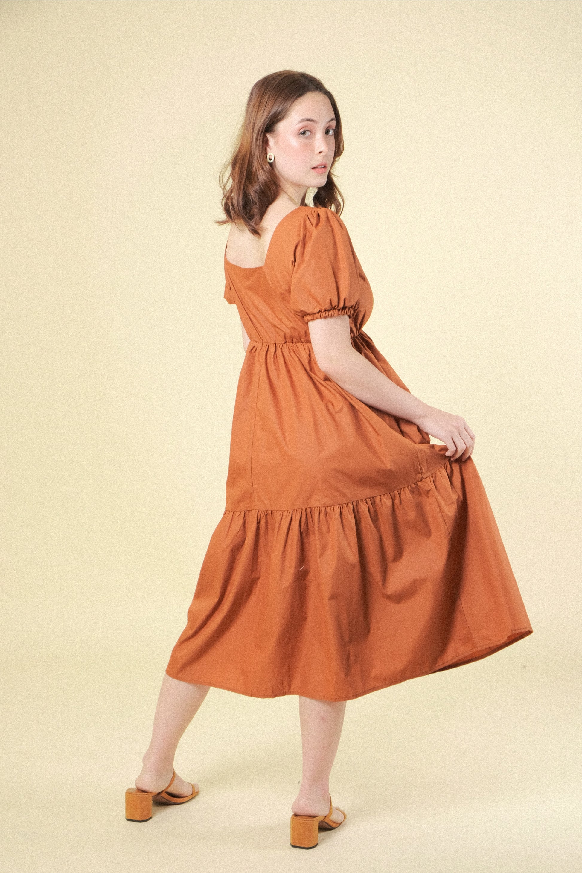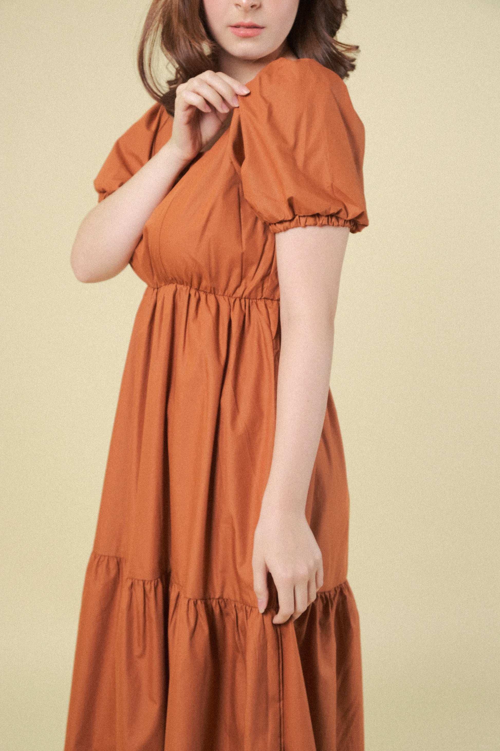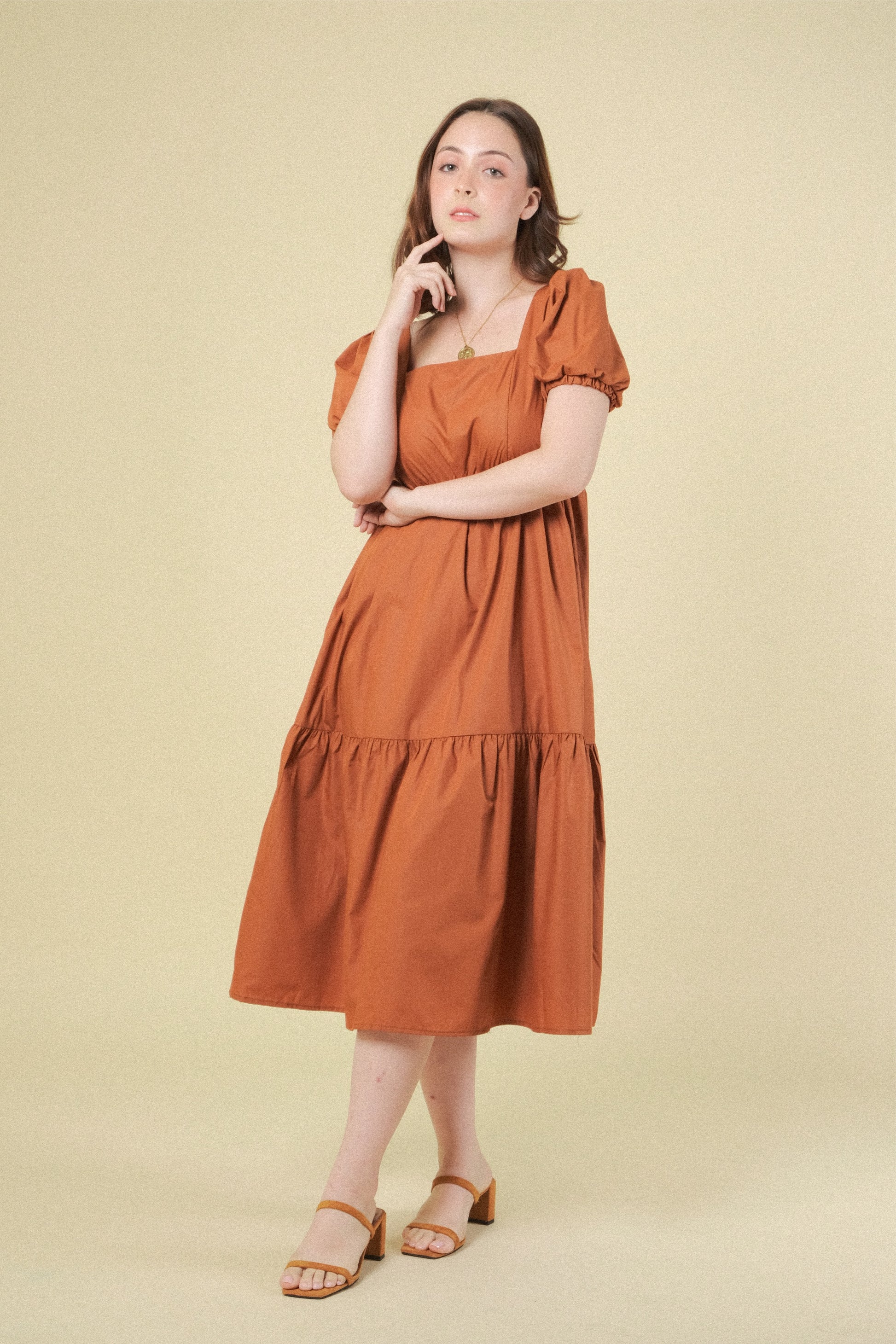 A woven dress featuring square neckline, short puff sleeves and tiered skirt.