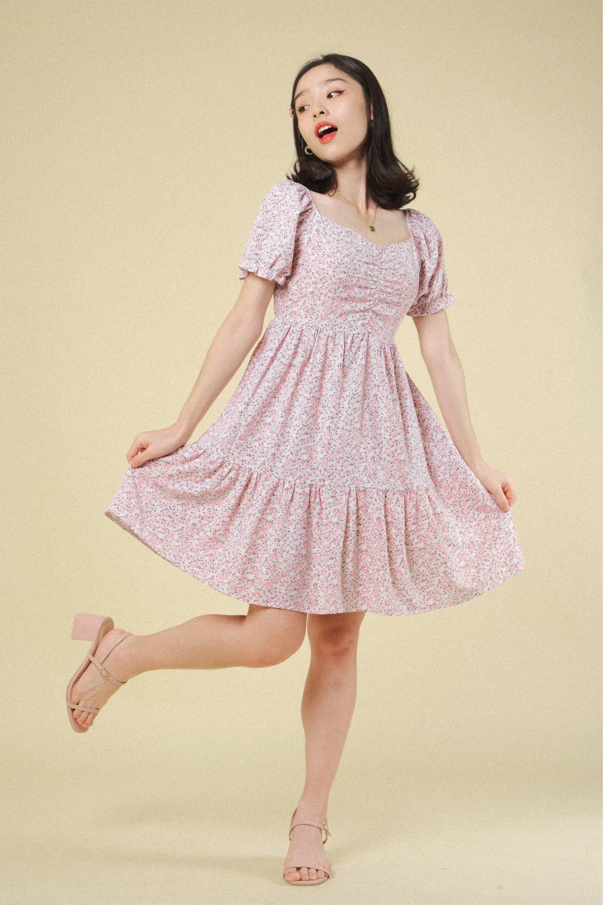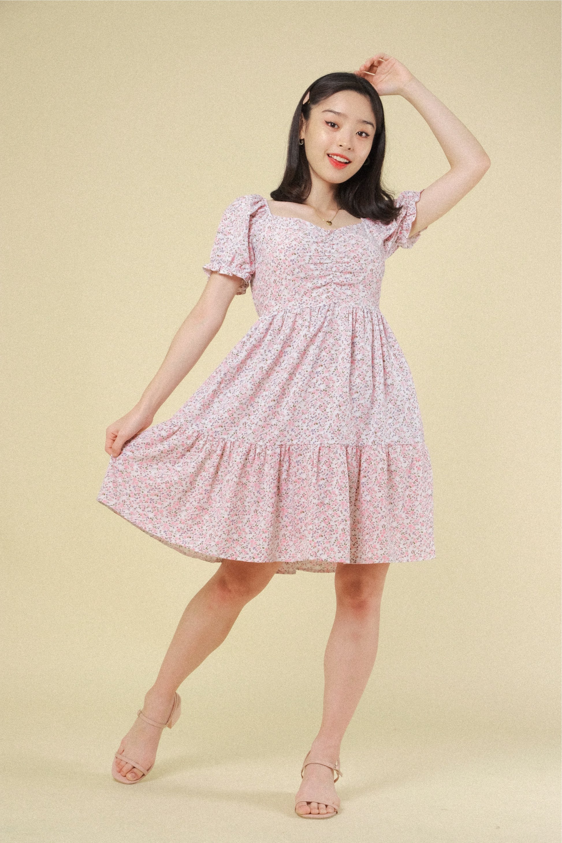 A woven dress featuring ruched sweetheart neckline, short puff sleeves, smocked back and flowy silhouette.