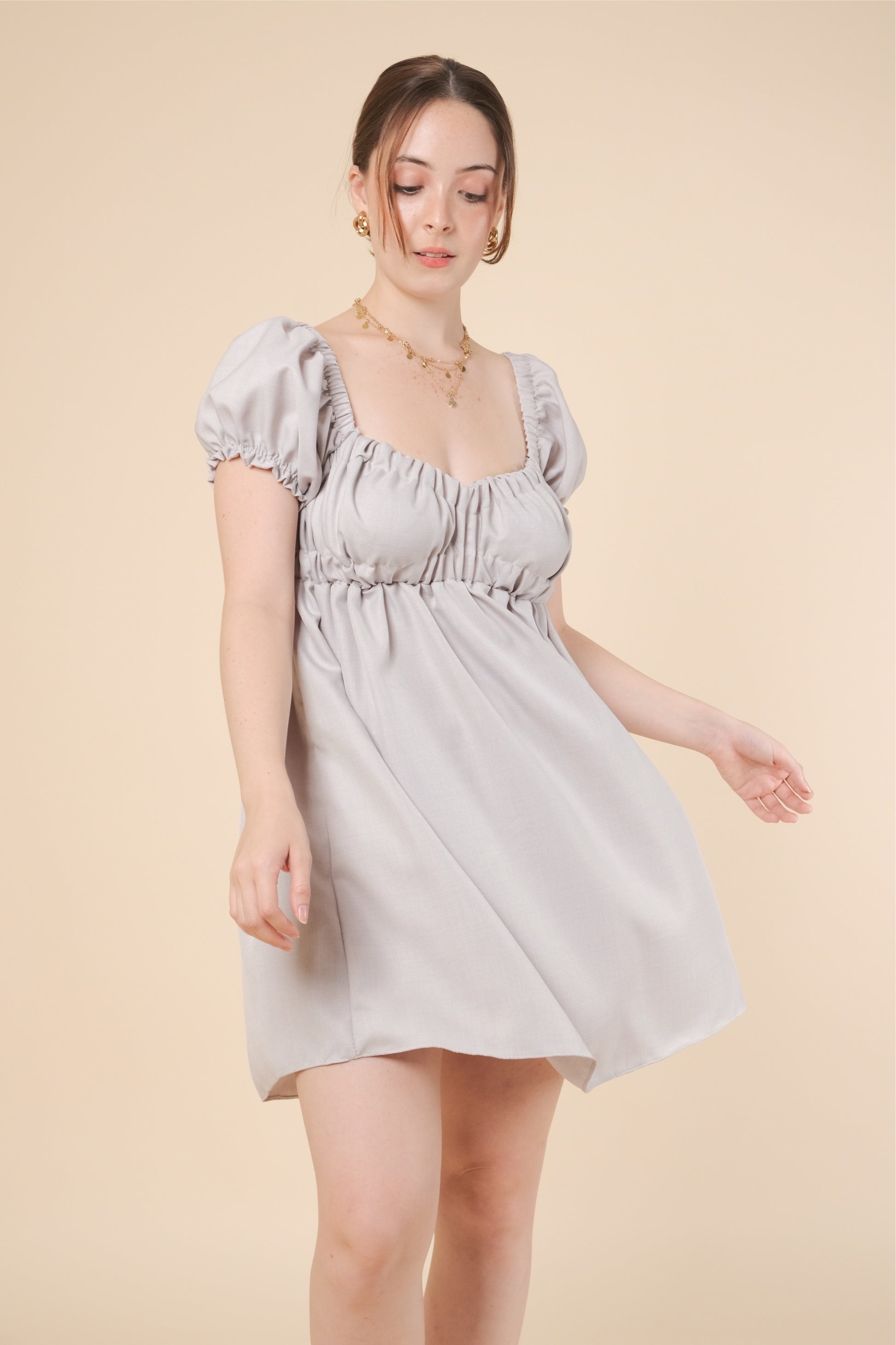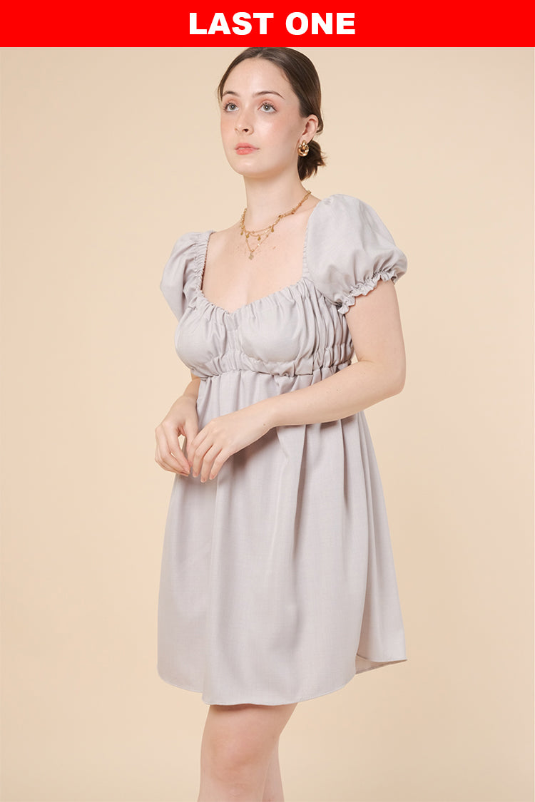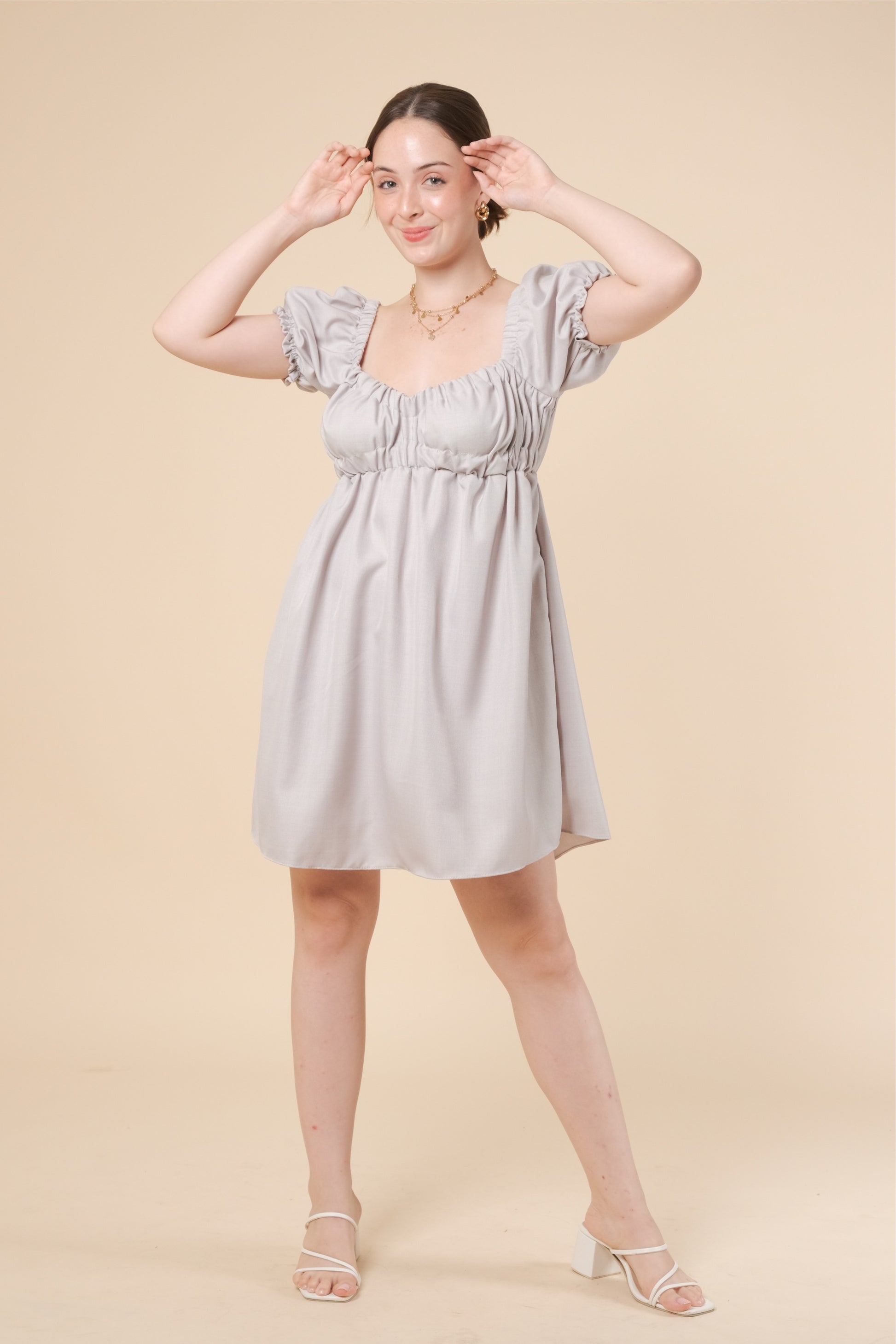 A woven dress featuring elasticized sweetheart neckline, elasticized short puff sleeves and waistline, and a flowy silhouette.