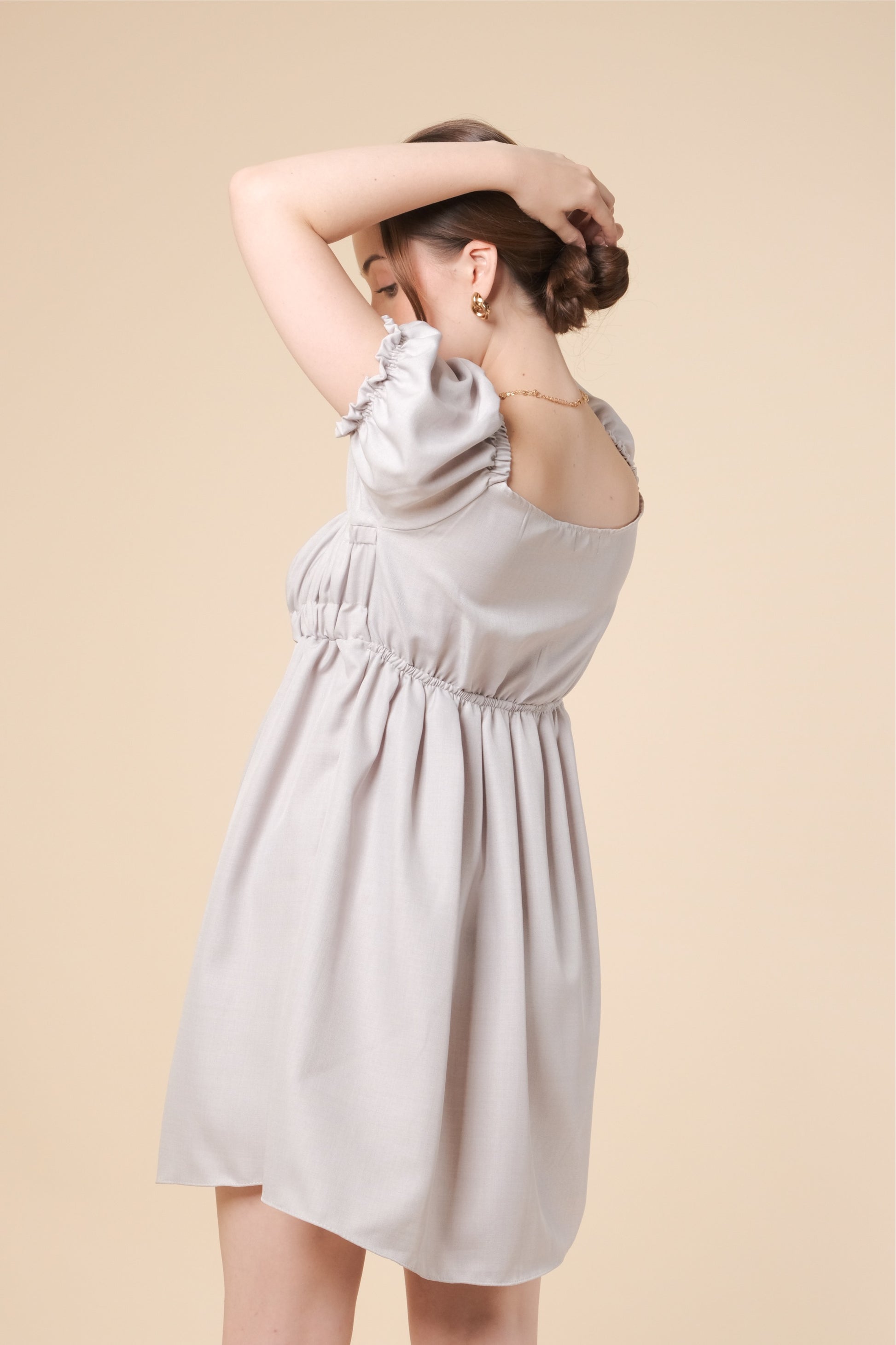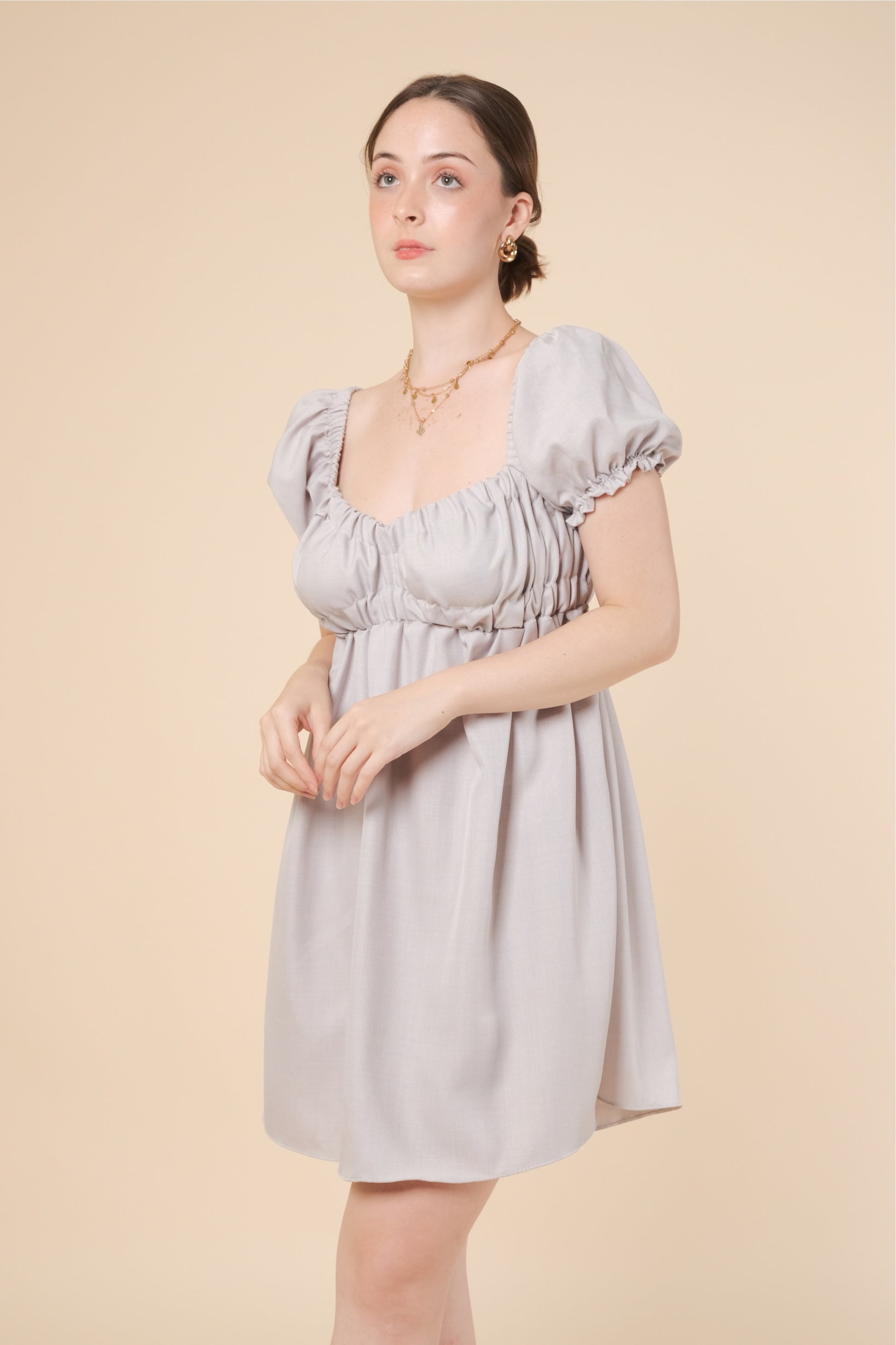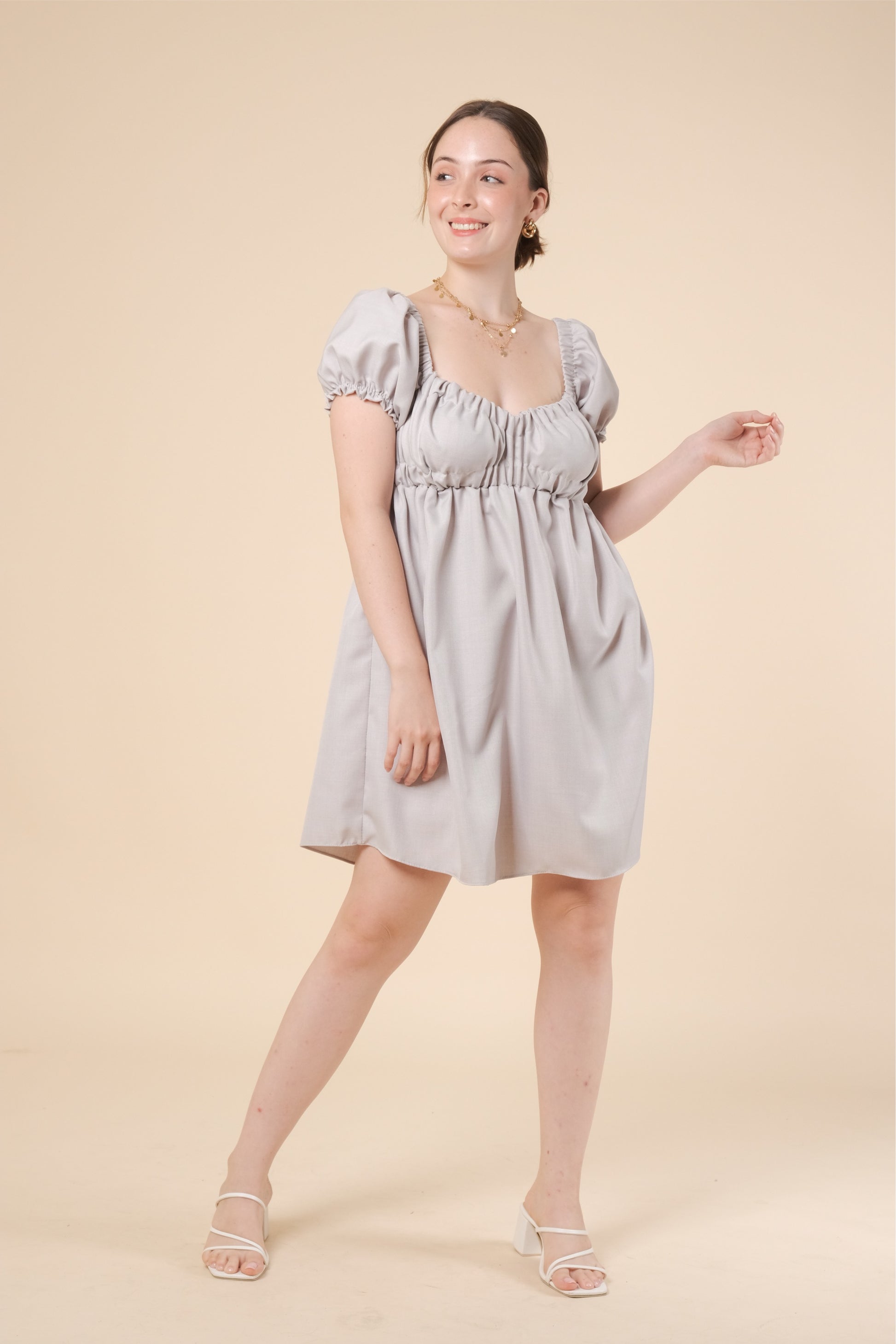 A woven dress featuring elasticized sweetheart neckline, elasticized short puff sleeves and waistline, and a flowy silhouette.