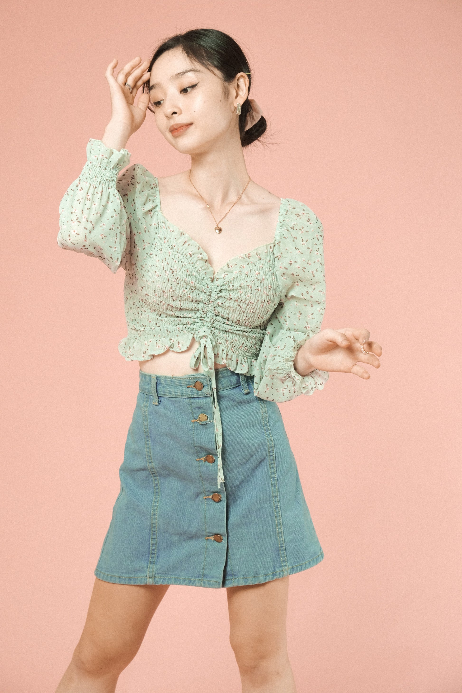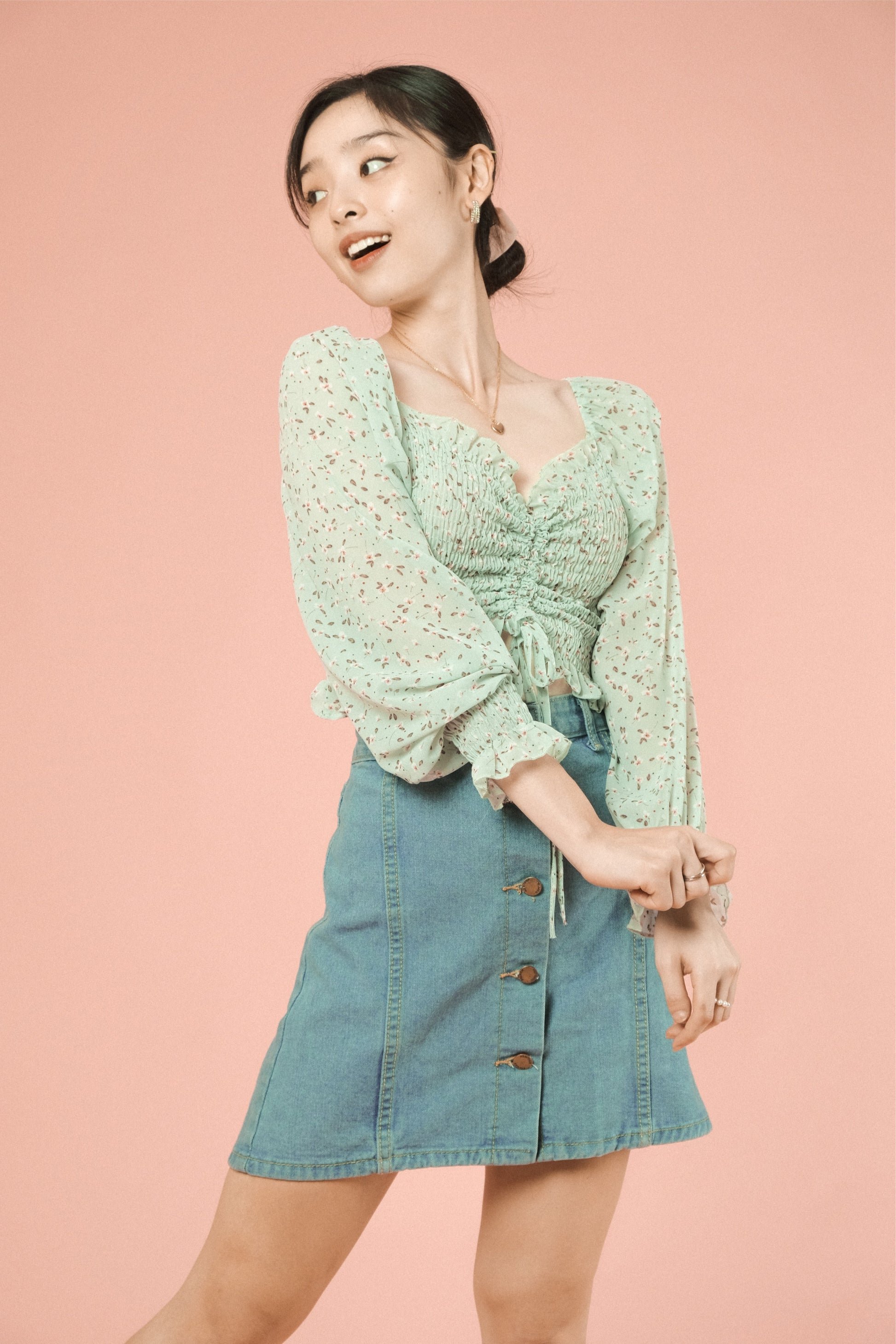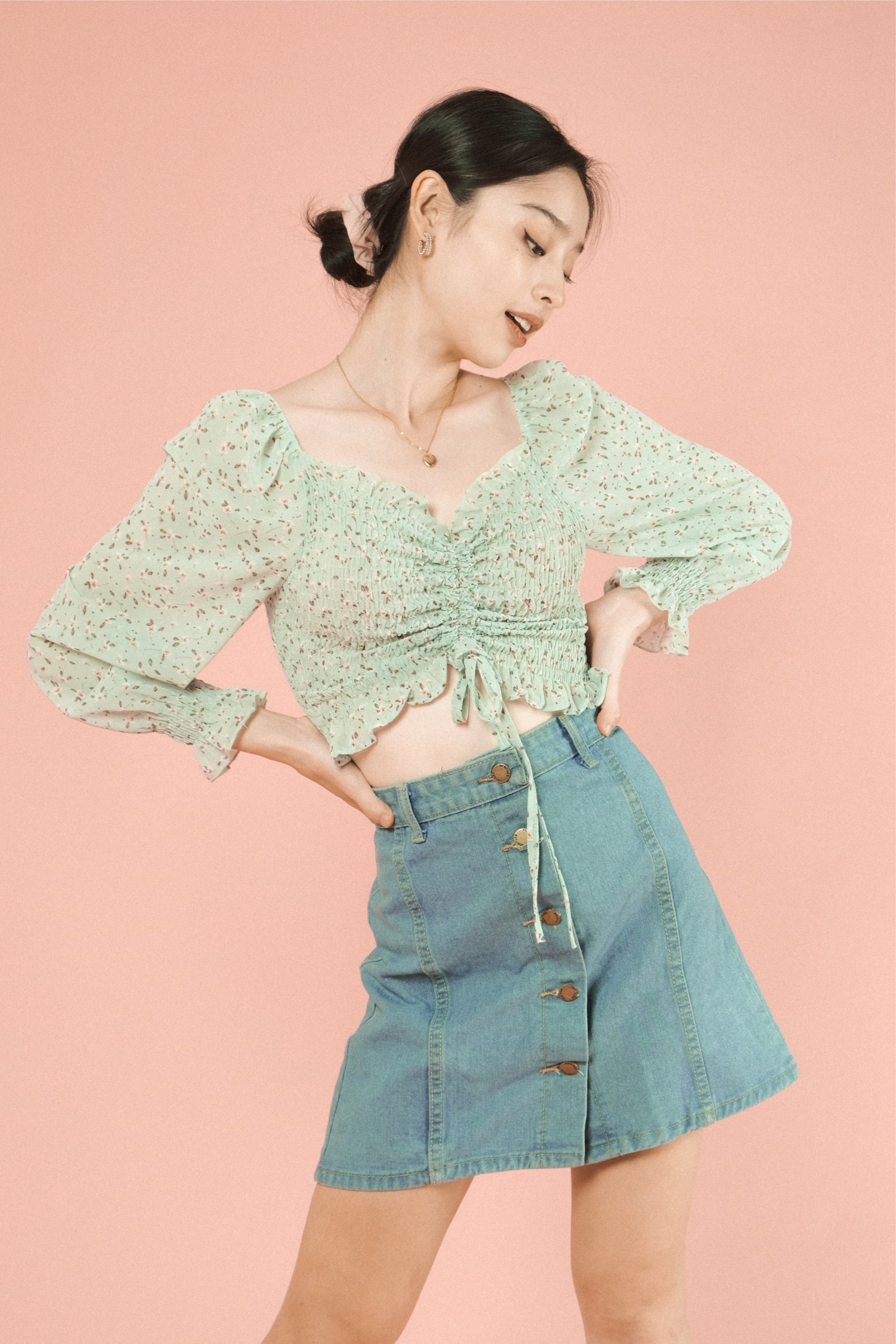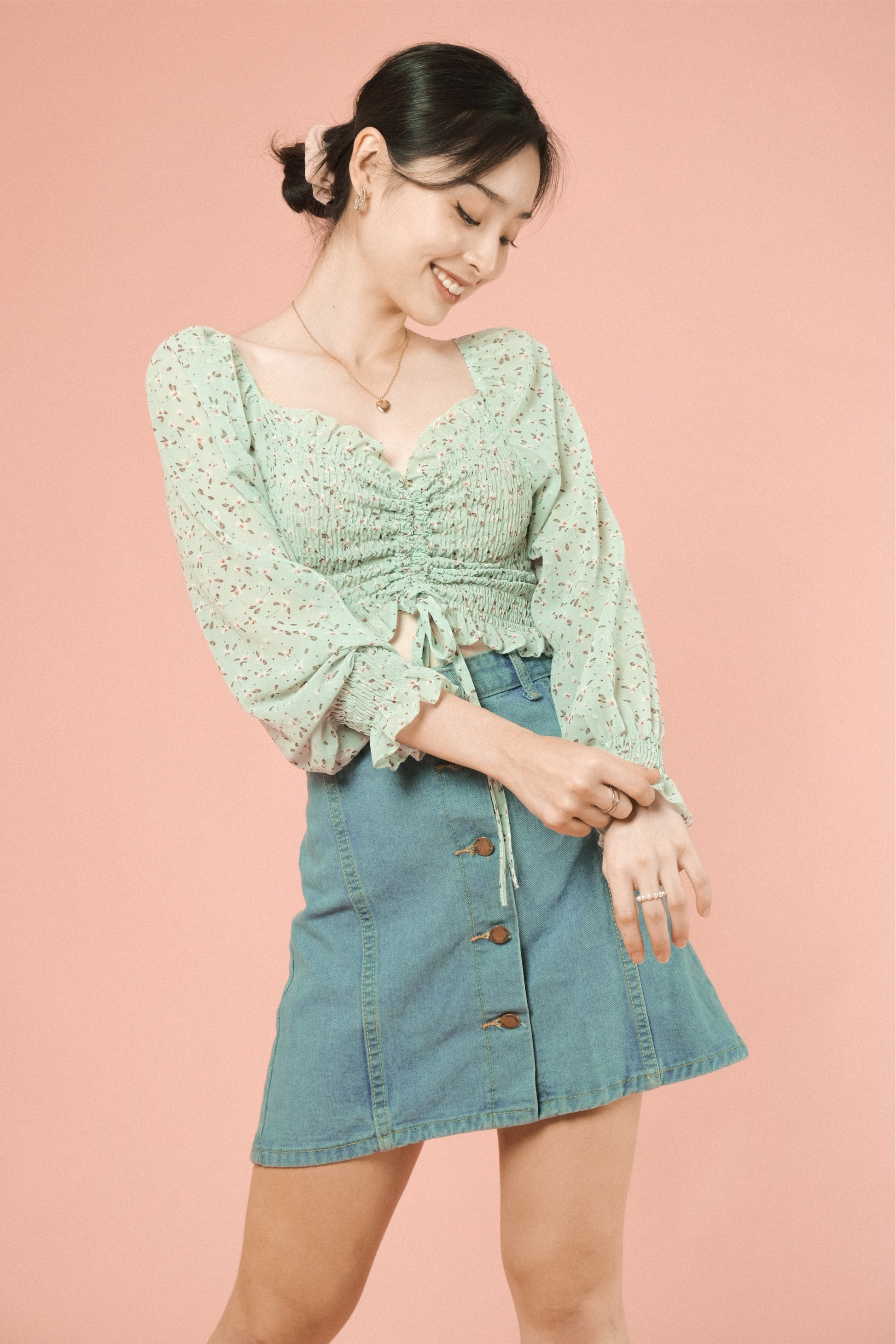 A woven top featuring sweetheart neckline, ruched drawstring with fastening, smocked bodice and long sleeves.