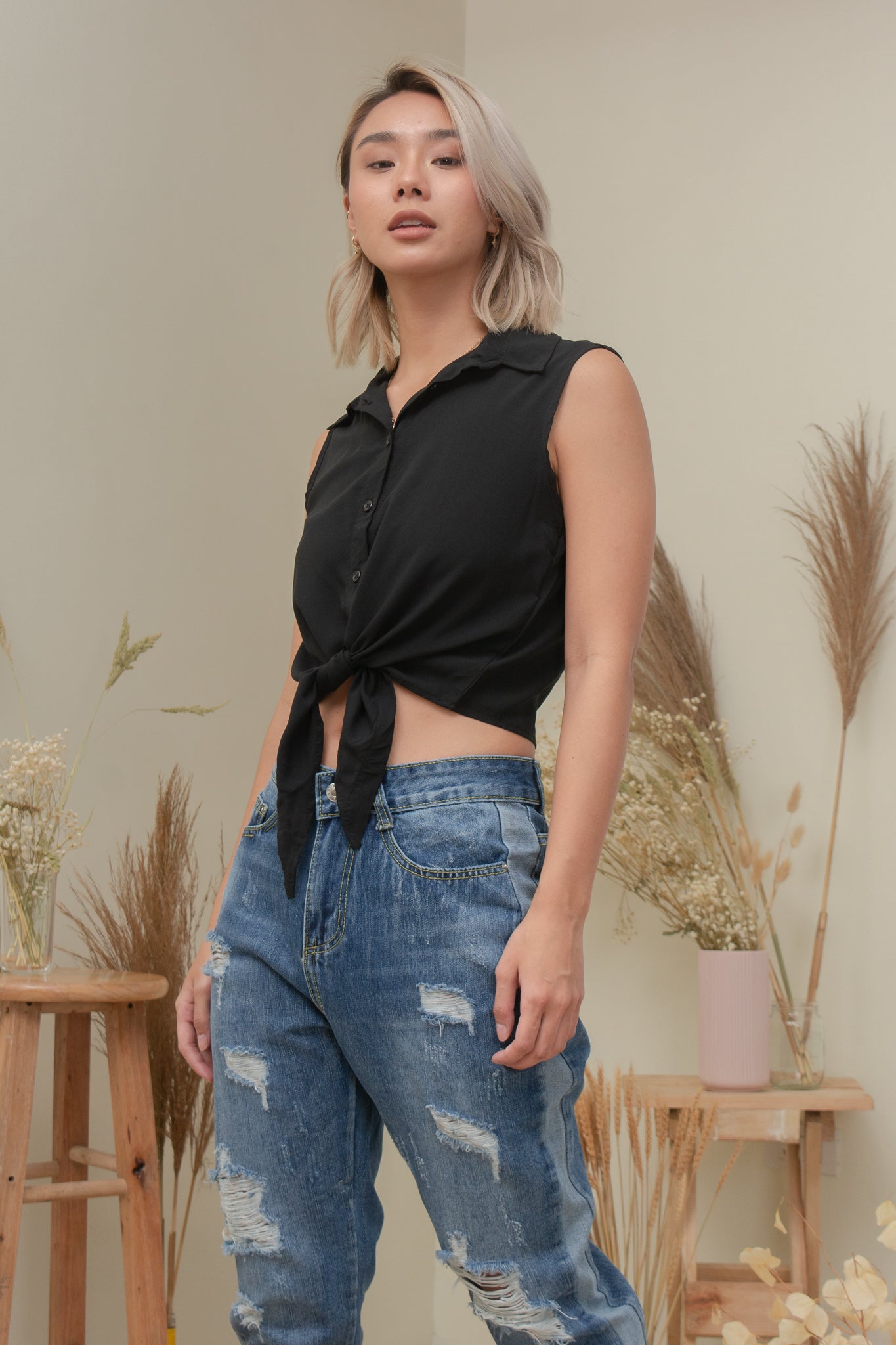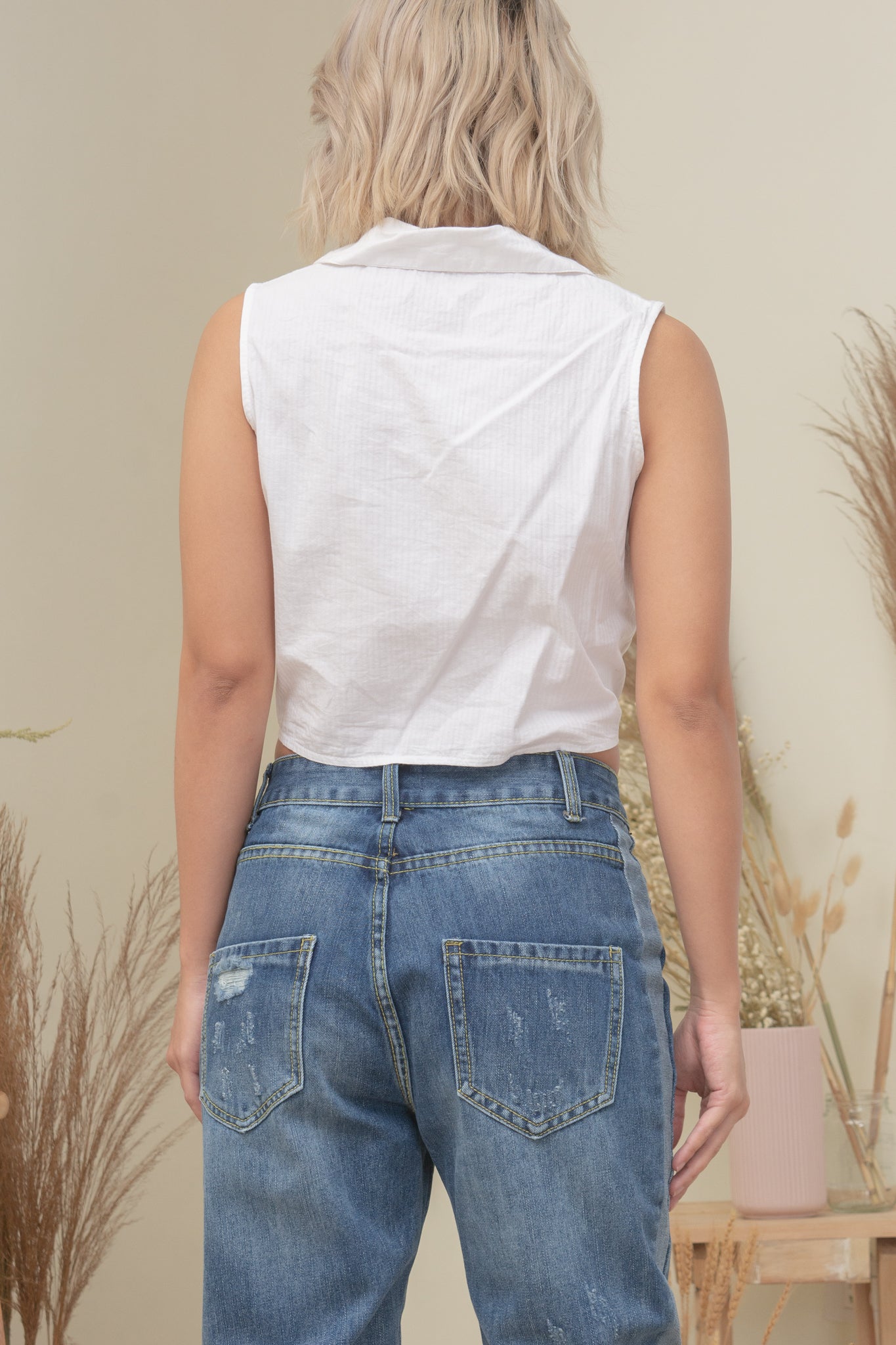 A pair of cropped distressed denim featuring a button fly, belt loops, high-rise, pockets, and a skinny leg with cuffed hem.