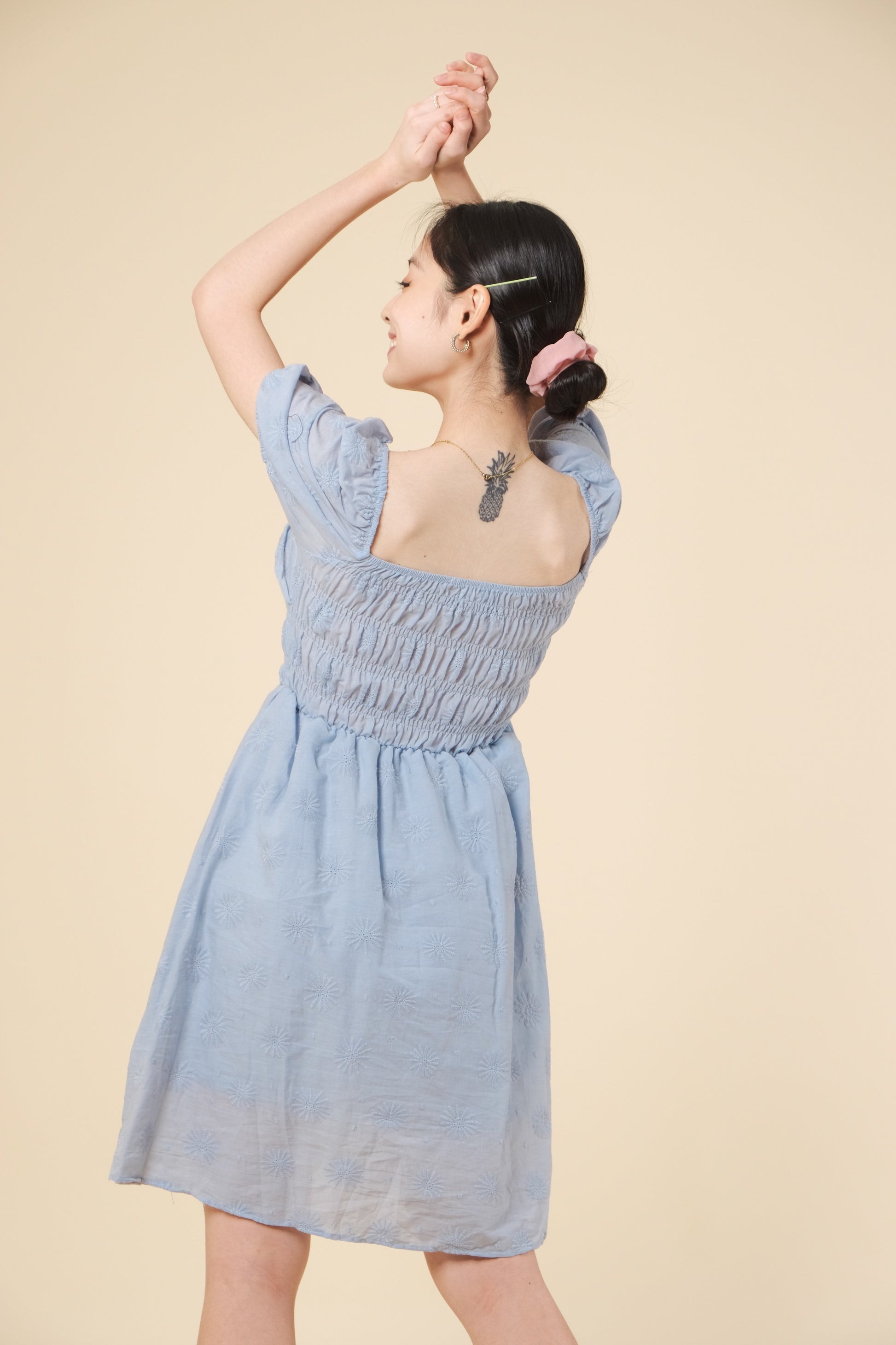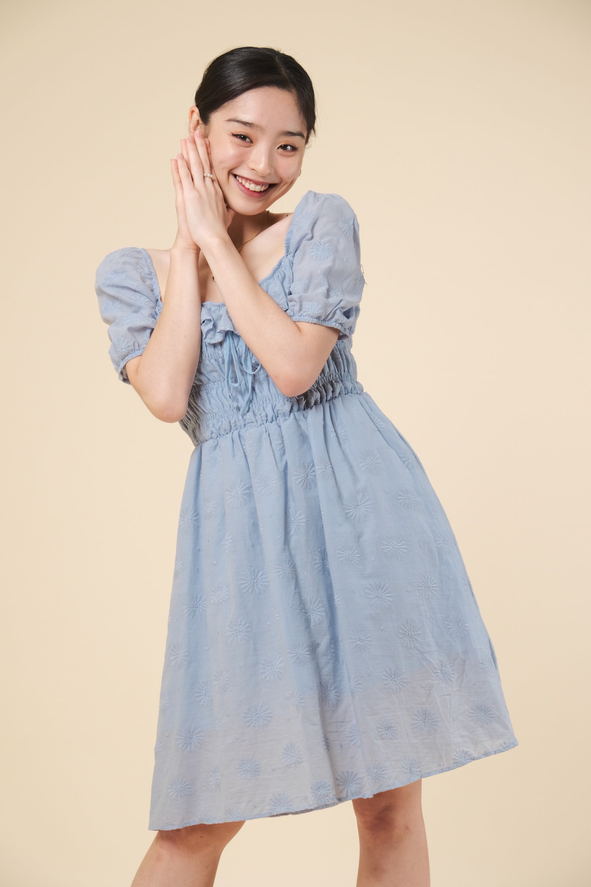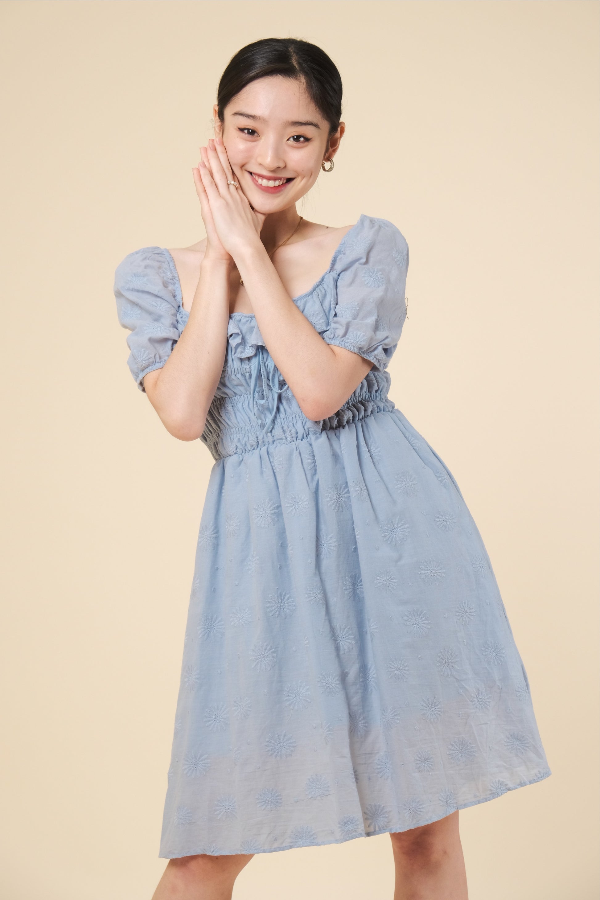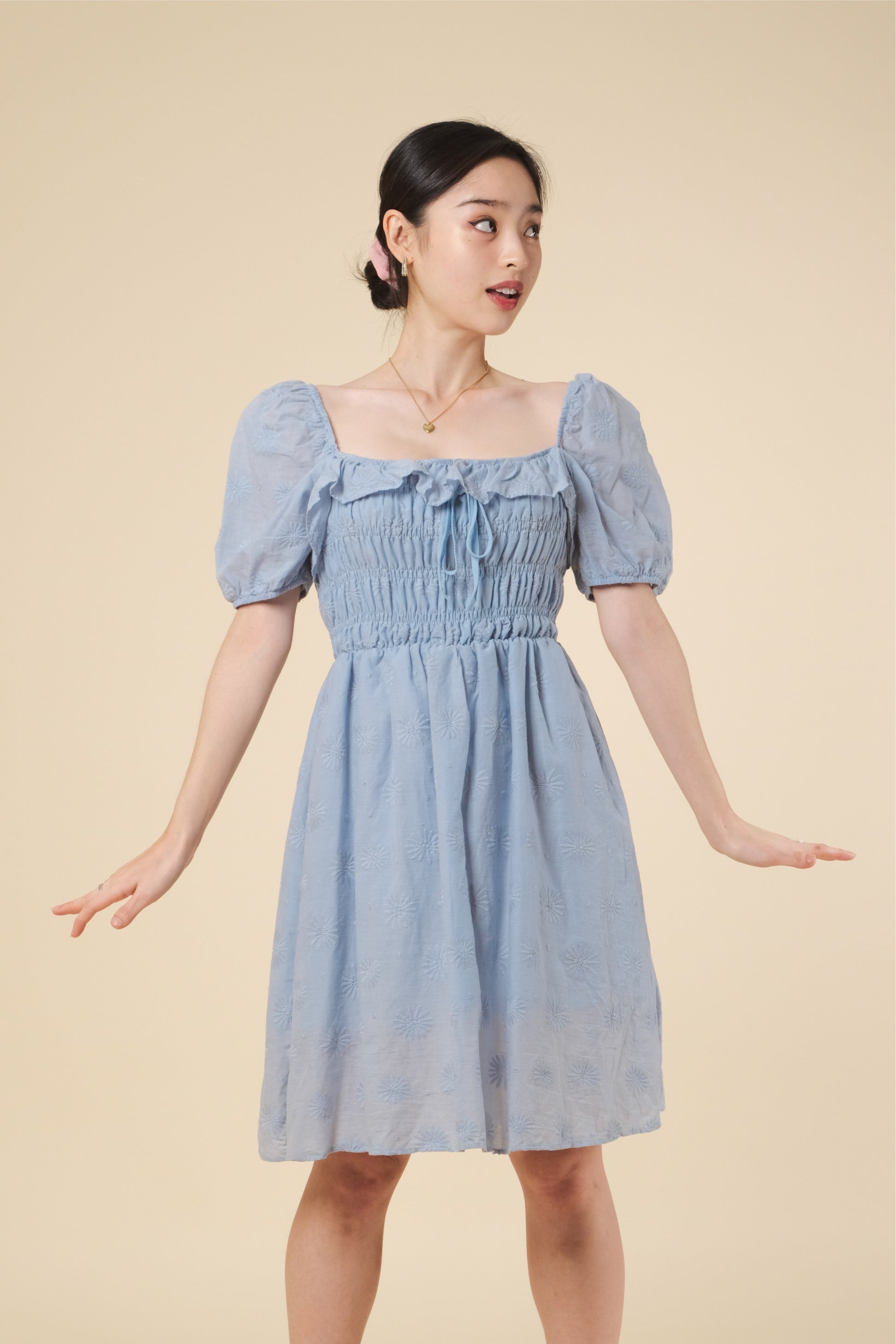 A woven eyelet dress featuring square neckline, smocked bodice, short puff sleeves , with lining and flowy silhouette.