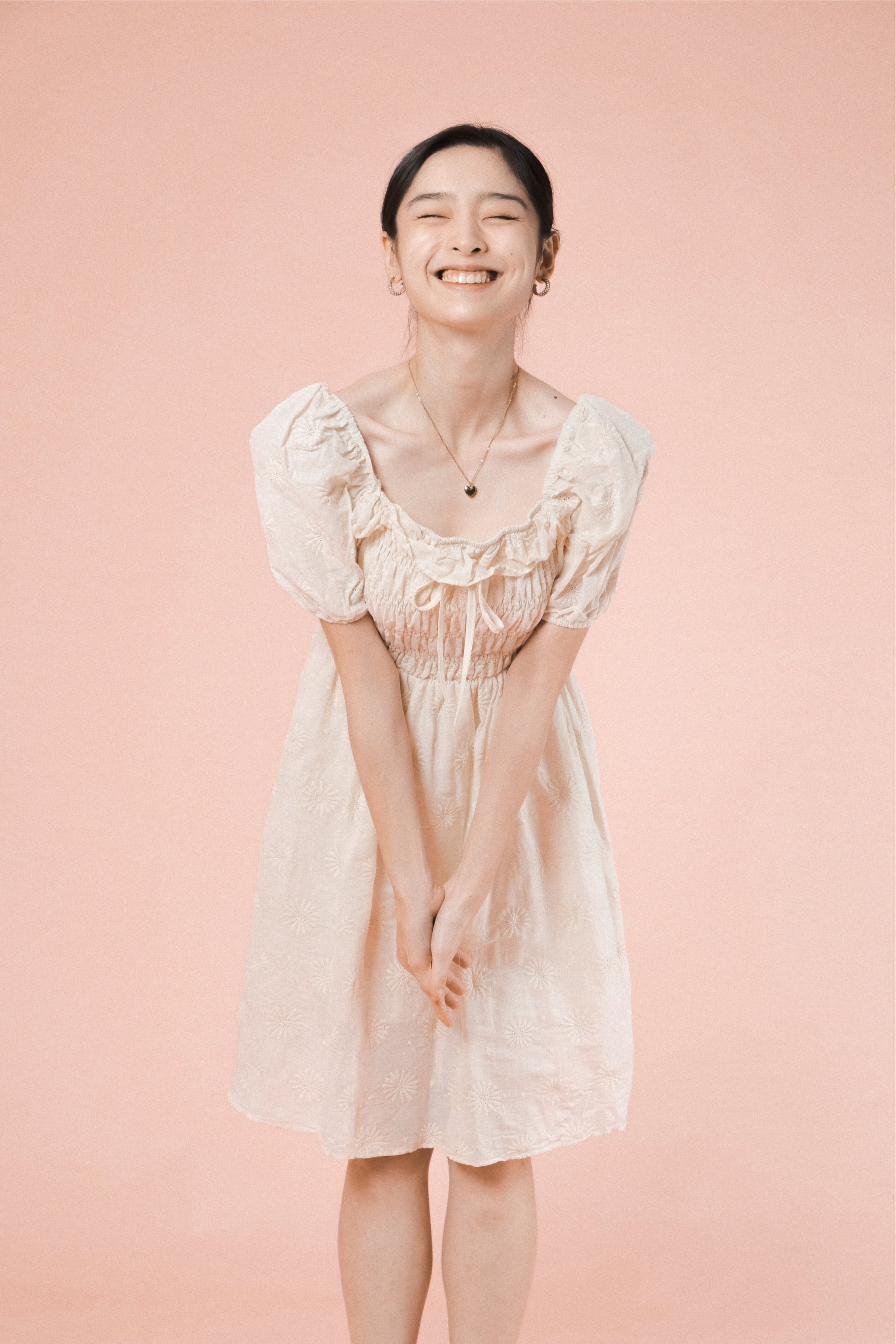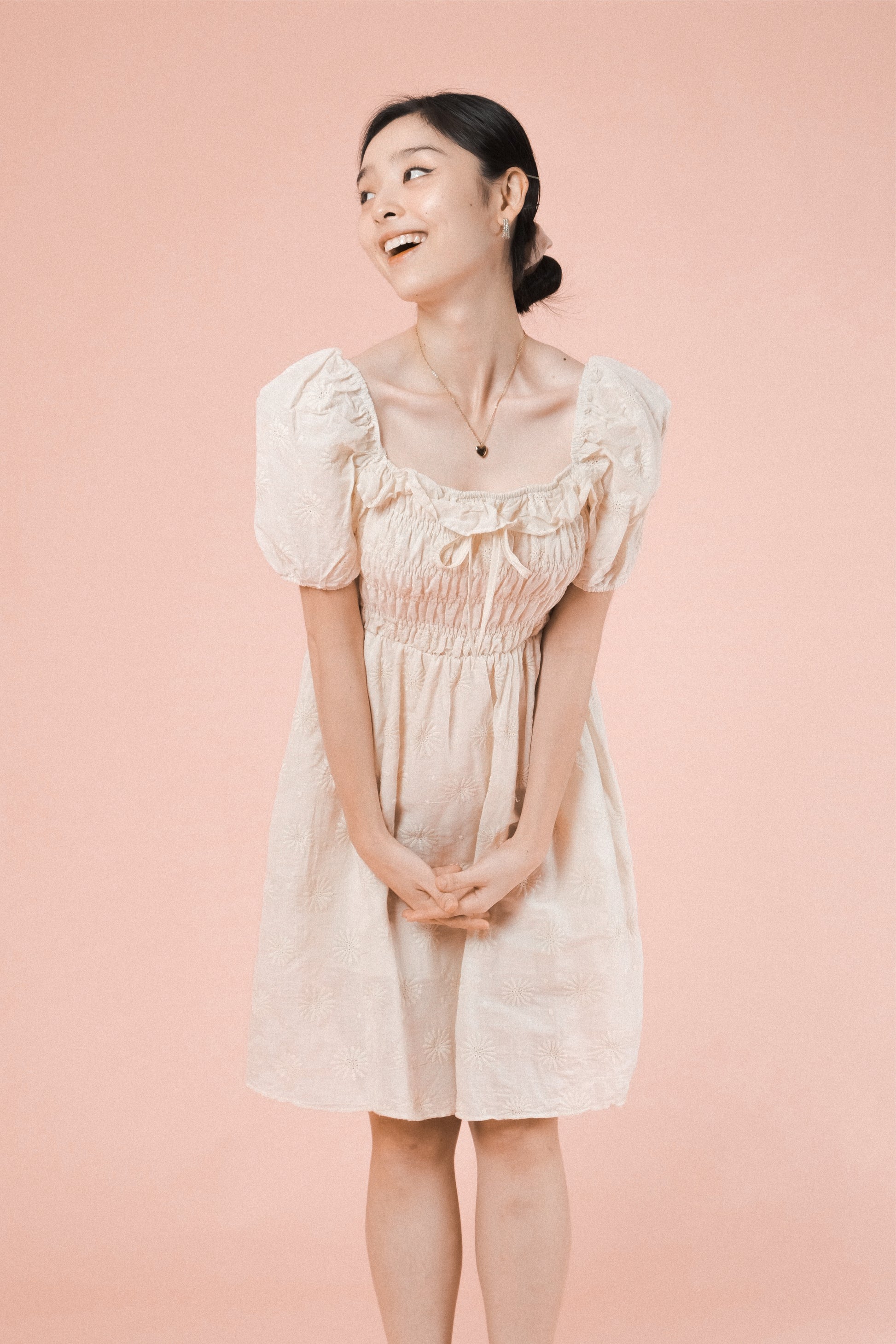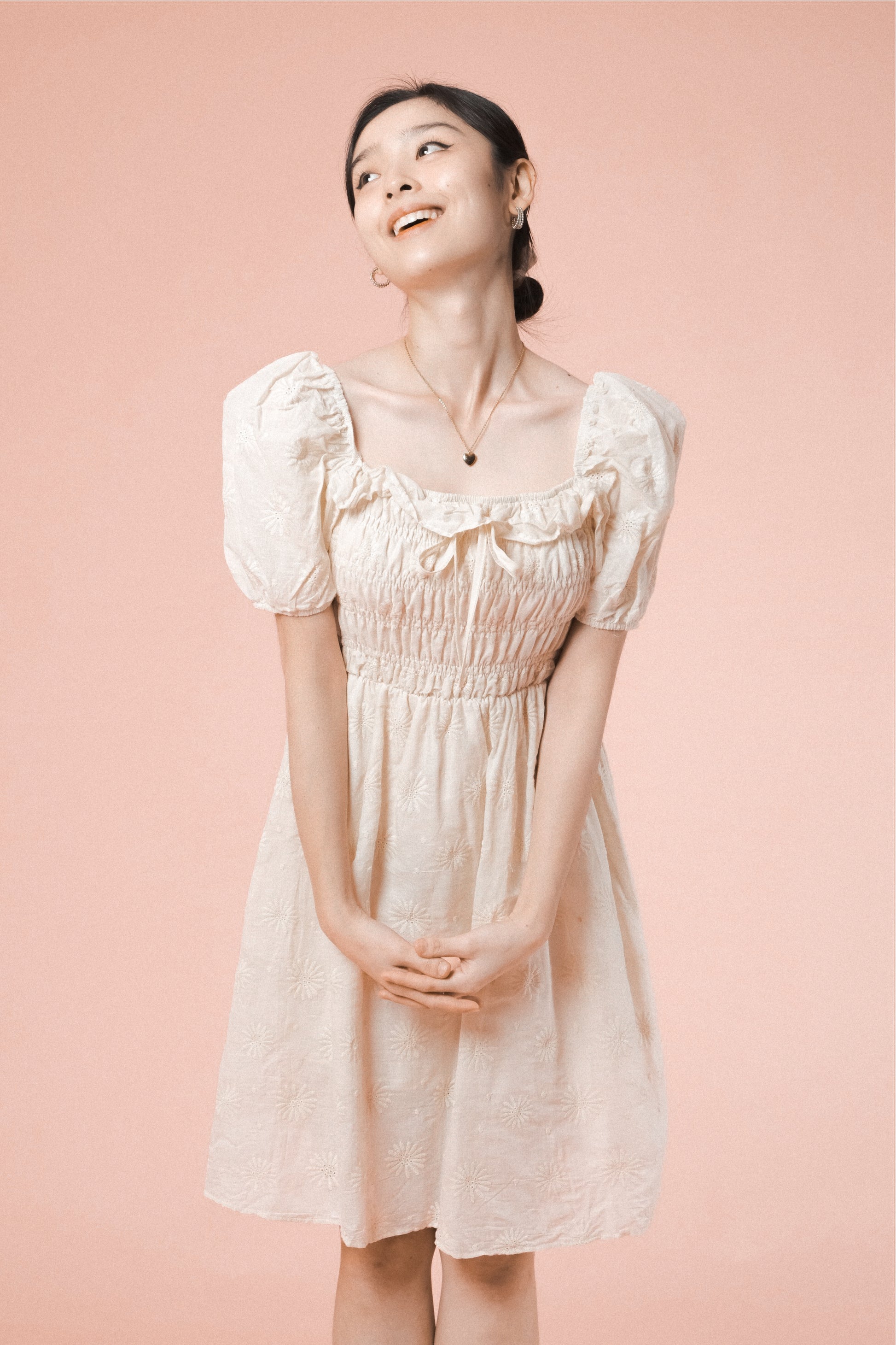 A woven eyelet dress featuring square neckline, smocked bodice, short puff sleeves , with lining and flowy silhouette.