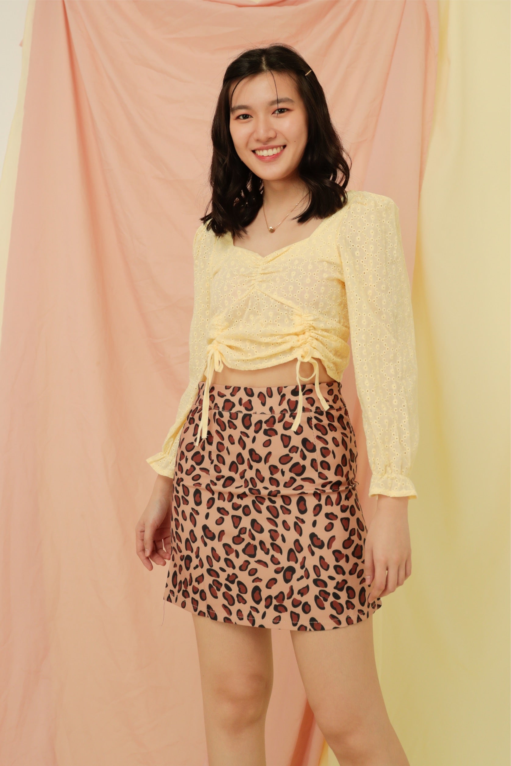 A woven mini skirt featuring an all-over cheetah print, high-rise waist, concealed back zip closure, lined, and a bodycon silhouette.