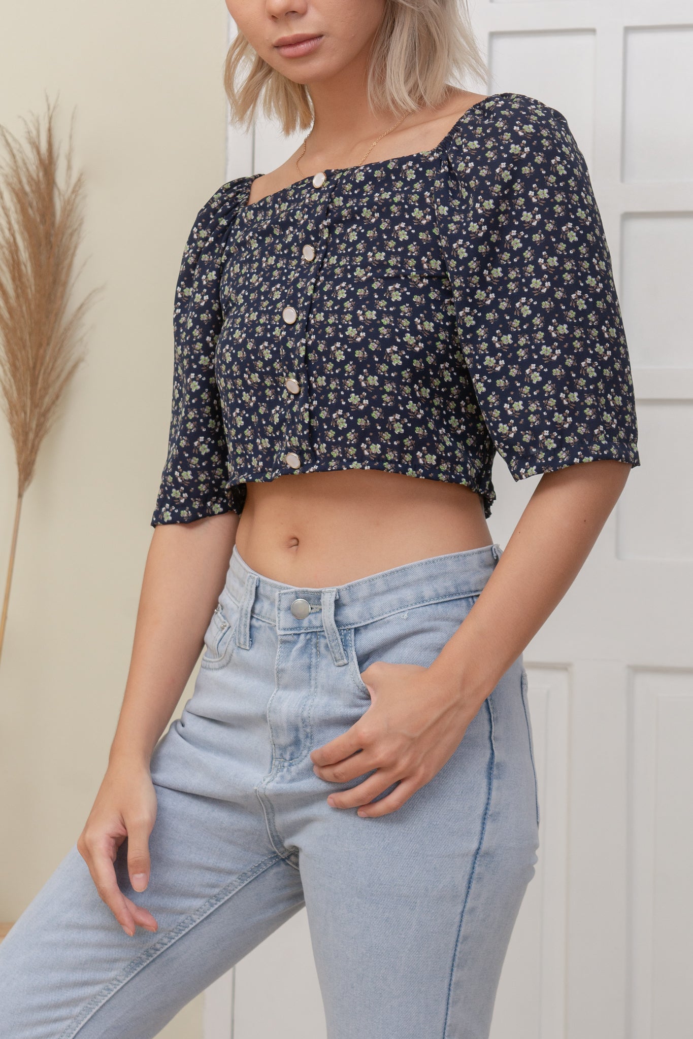A woven top featuring square neckline, elasticized 3/4 puff sleeves, mock buttons (non-functional), smocked back and flowy silhouette.