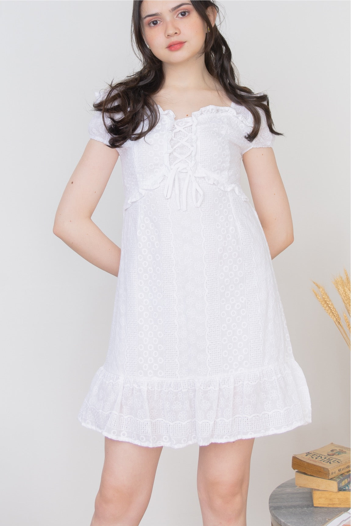 A woven mini dress featuring allover eyelets, sweetheart neckline and front self-tie fastening, elasticized short puff sleeves, smocked back bodice, concealed back zip, and a scalloped hem.