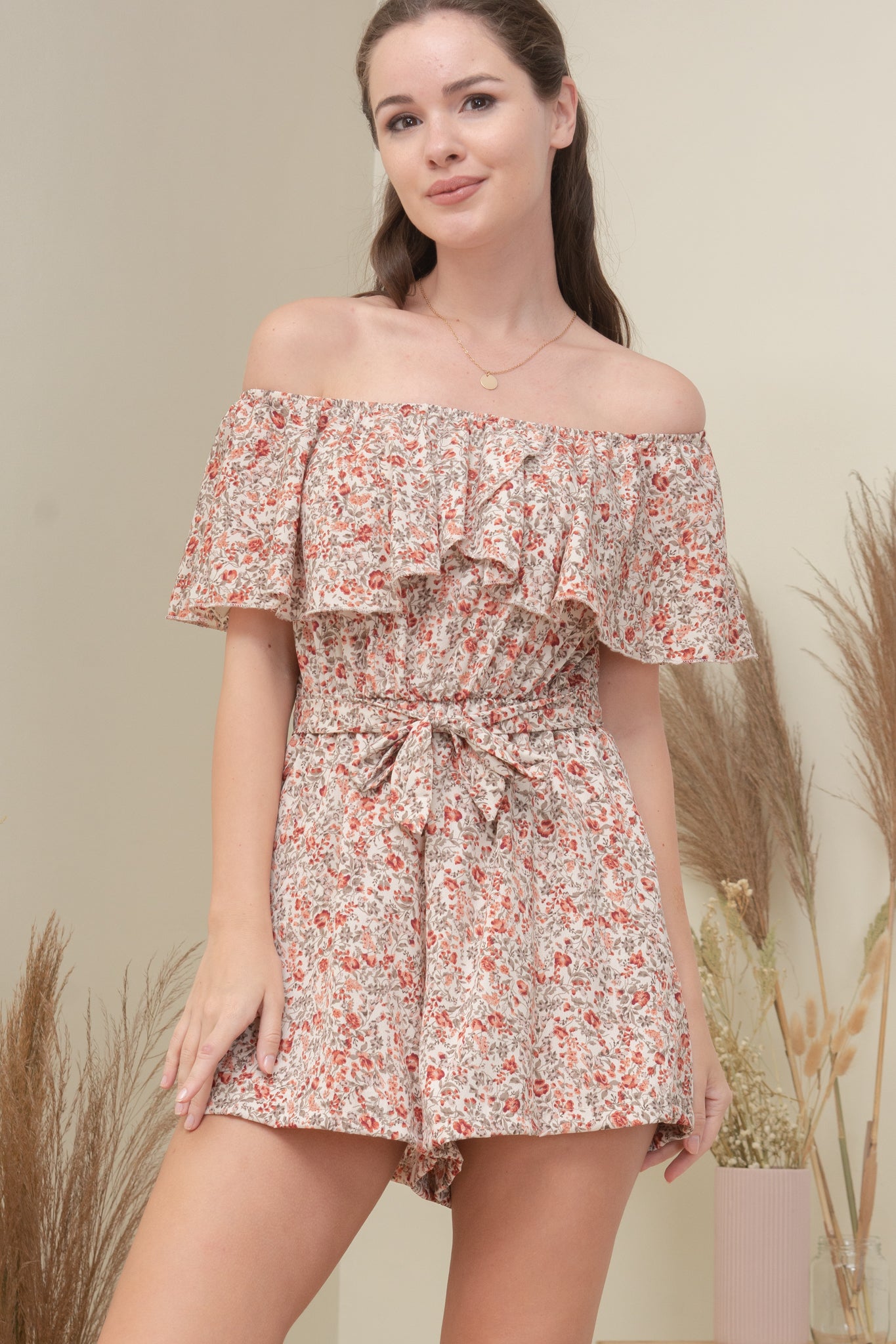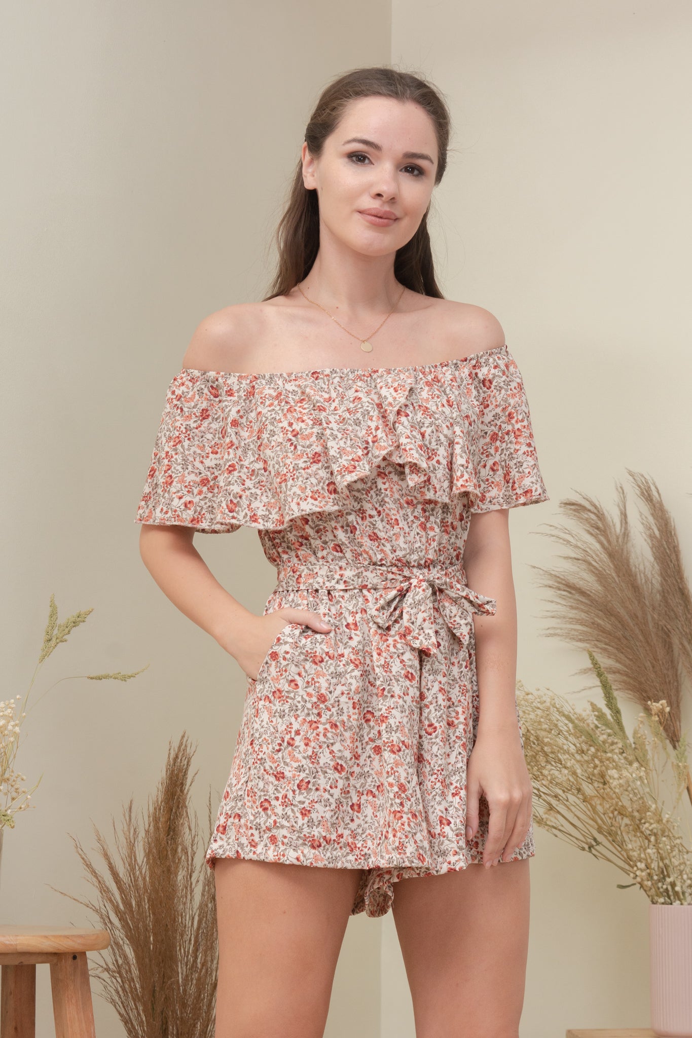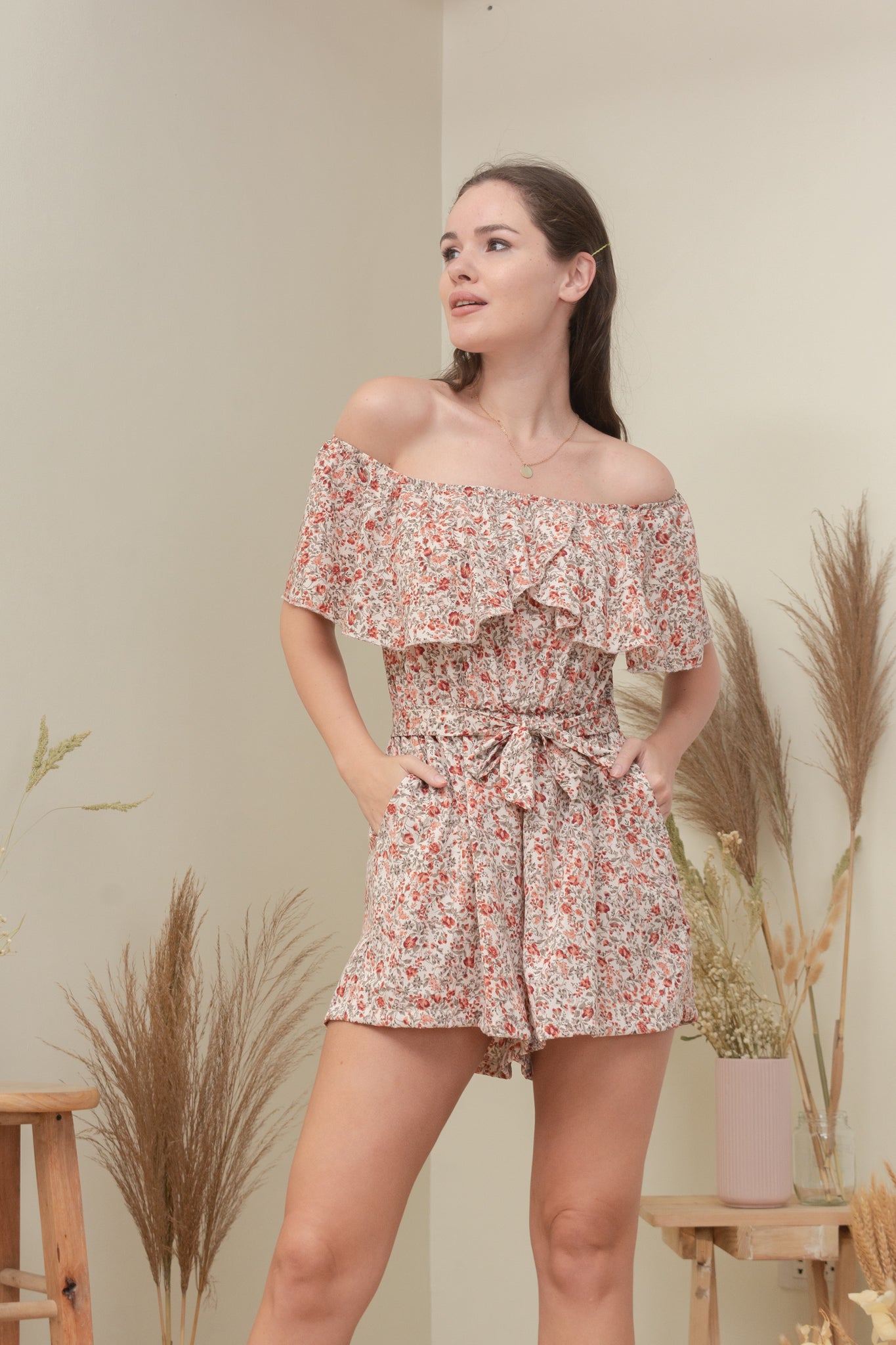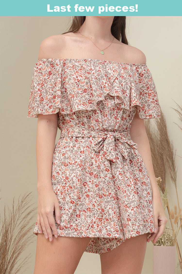 A woven romper featuring elasticized off the shoulder neckline, detachable self-tie fastening details, elasticized waist, and dual side pockets.