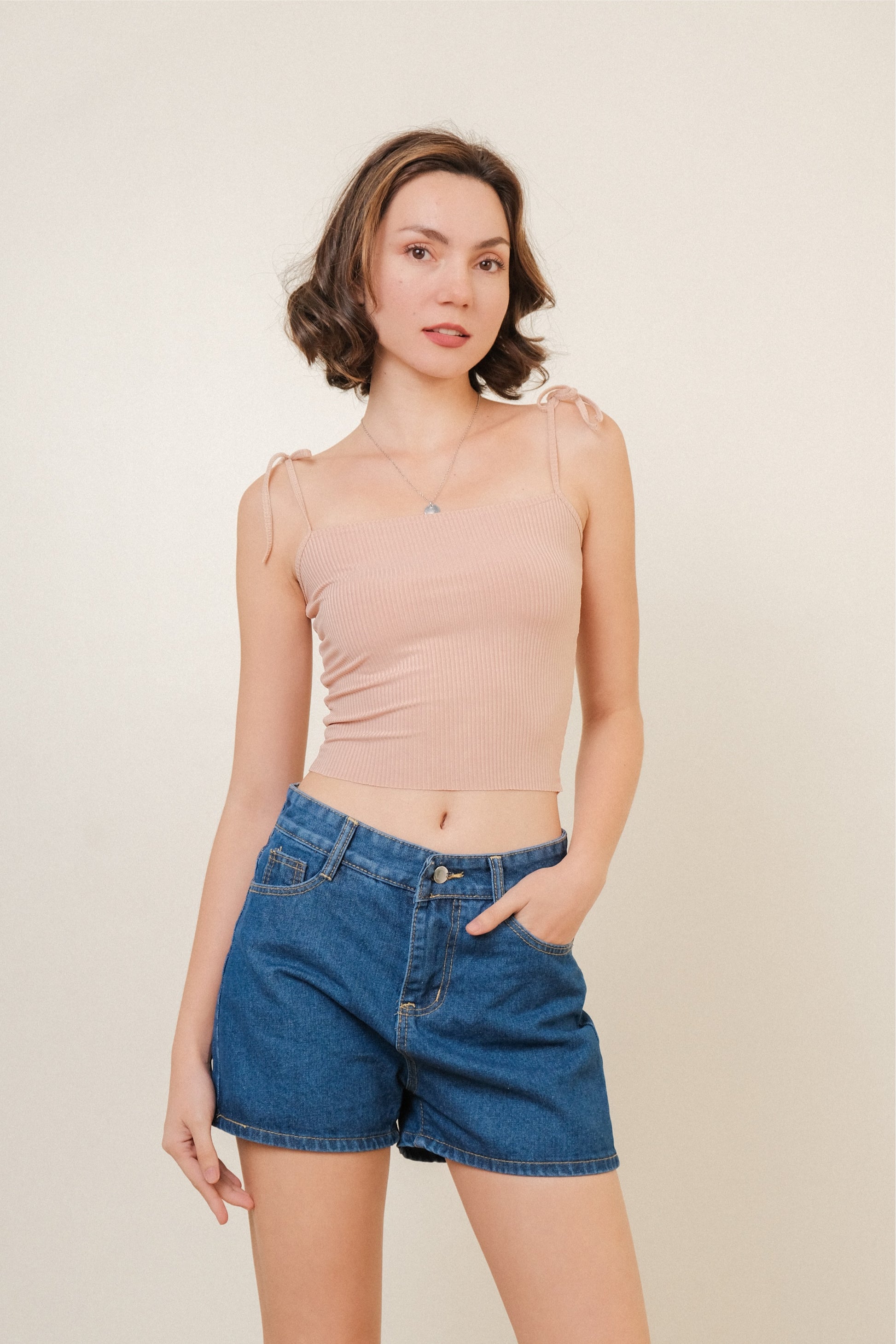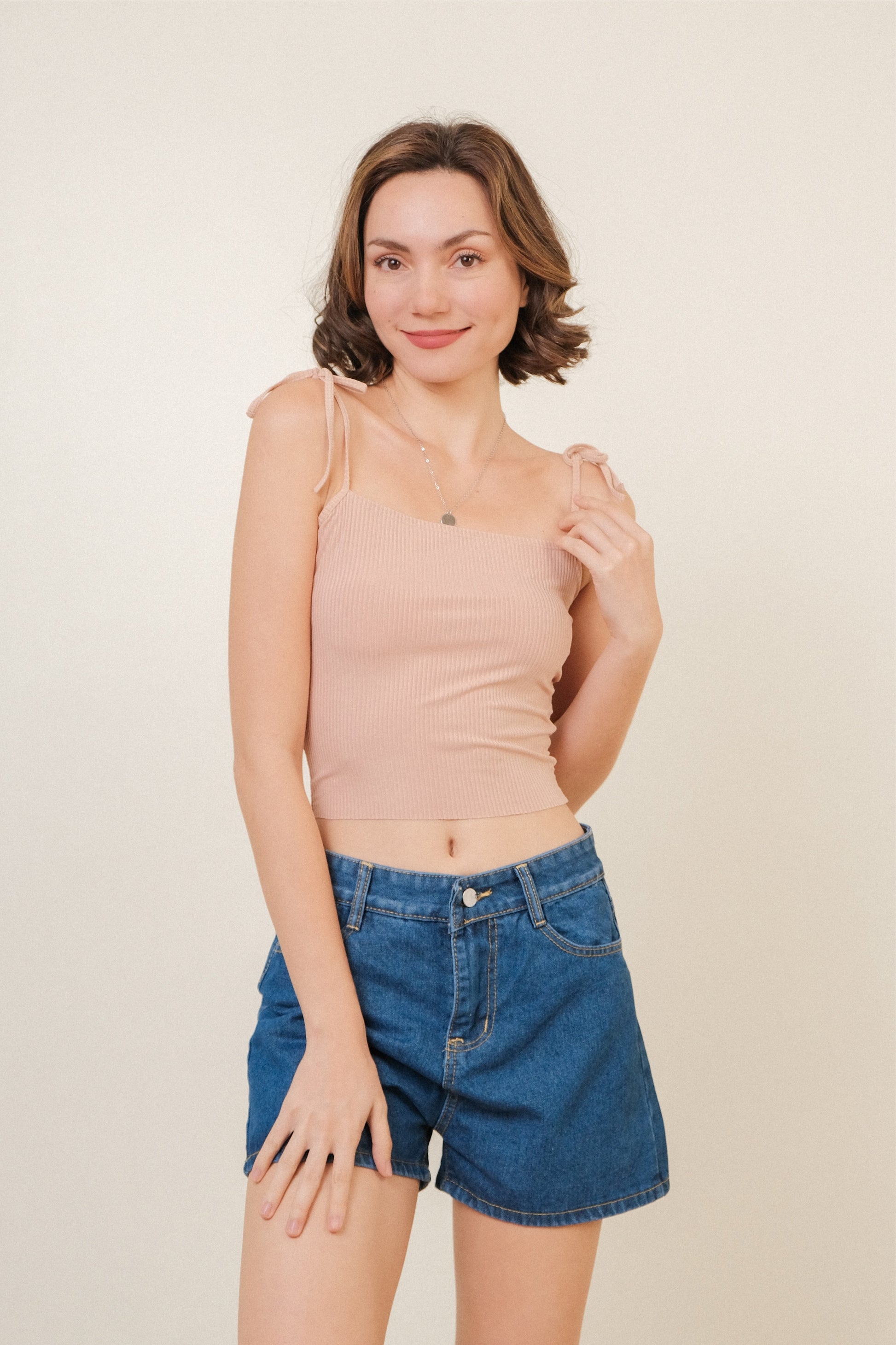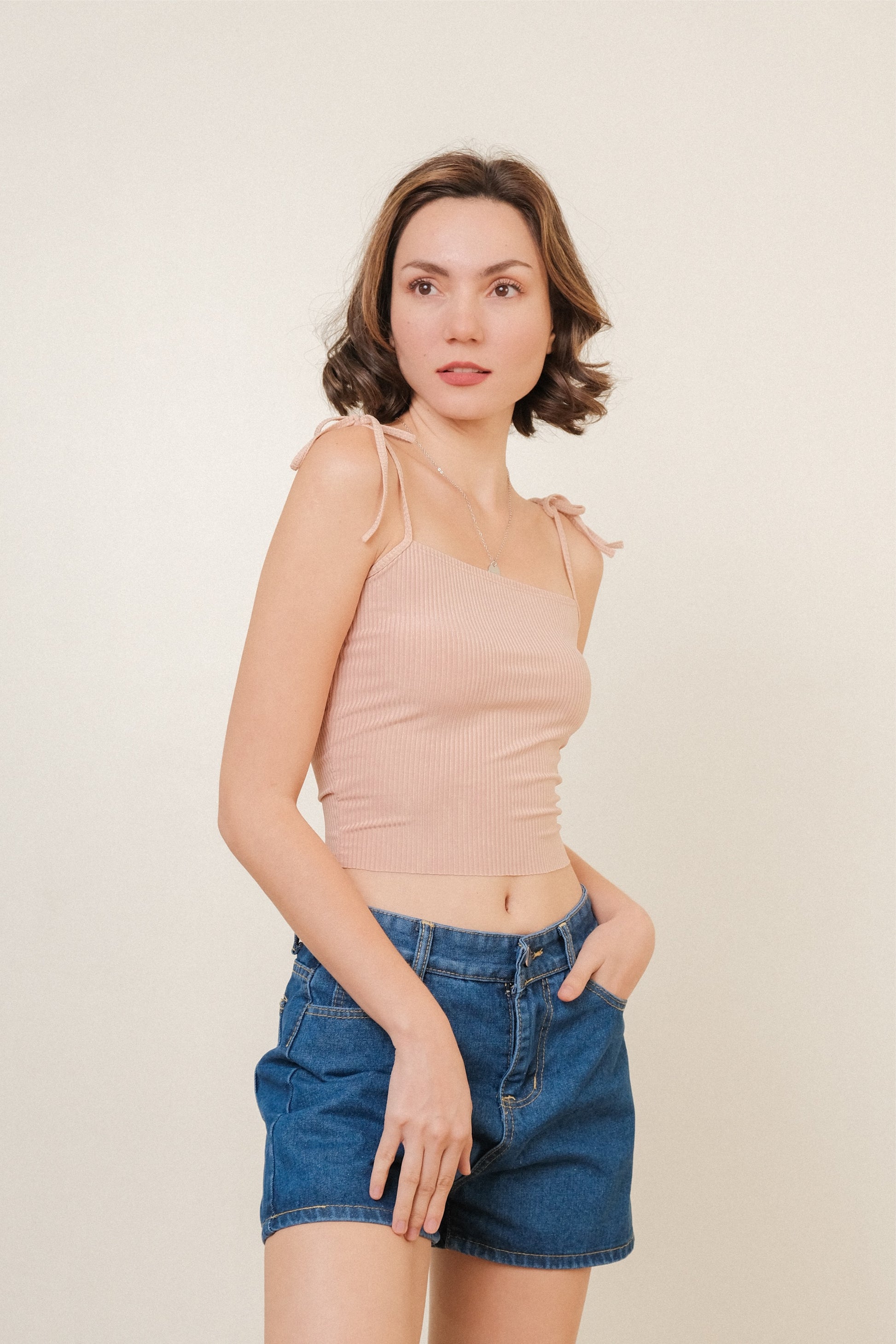 A stretchy ribbed cami top featuring self-tie straps and form fitting silhouette.