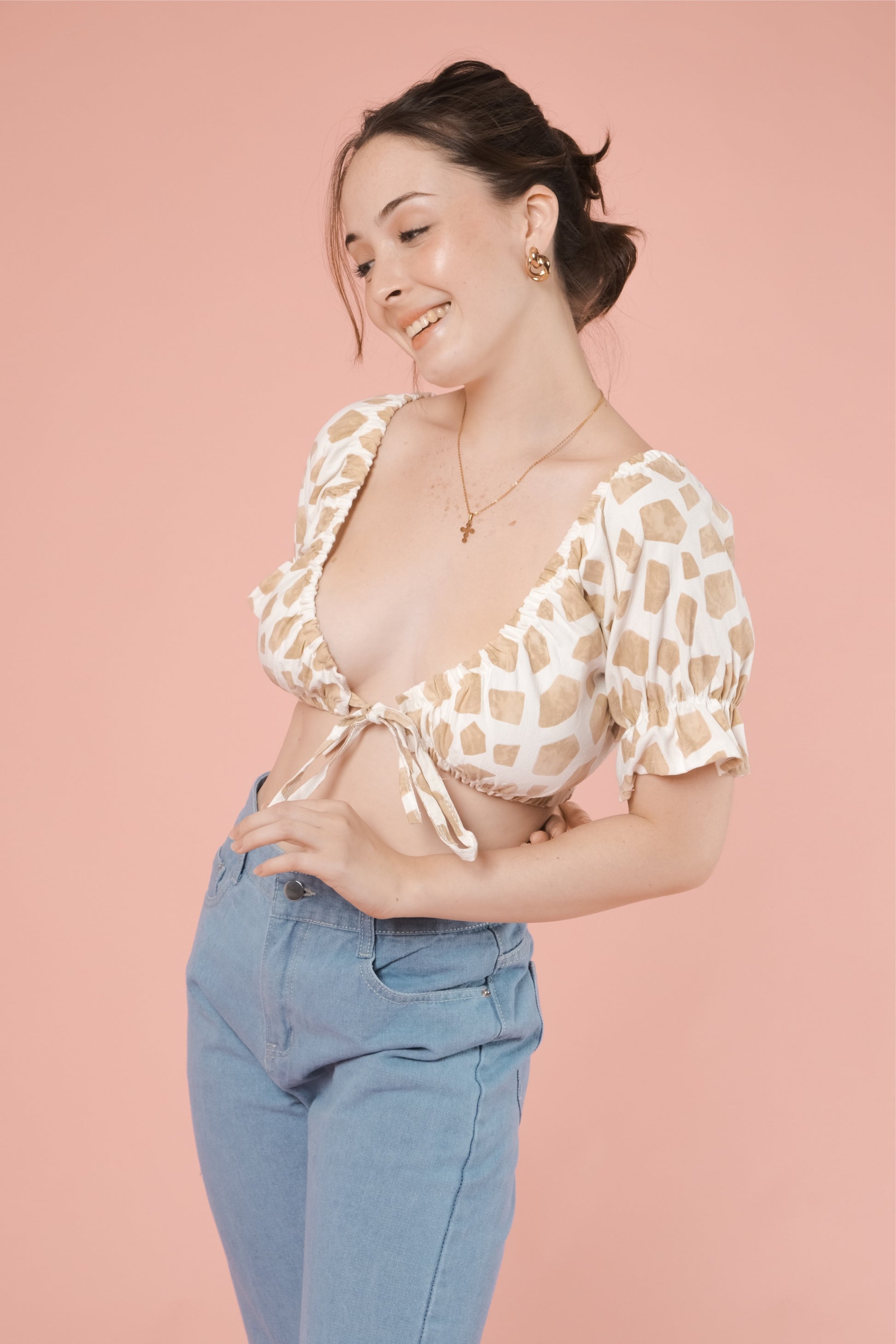 A woven top featuring V neckline with self-tie chest fastening, elasticized puff sleeves, and elasticized waist.