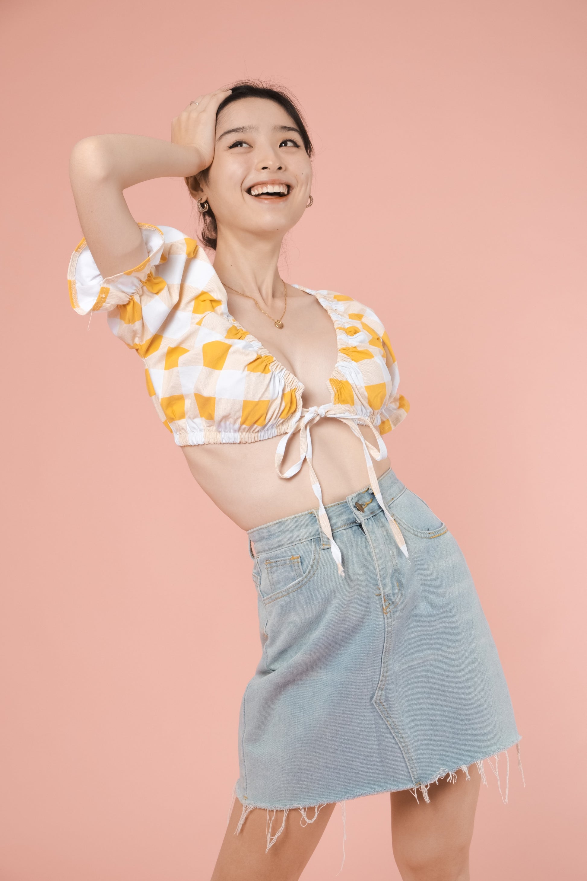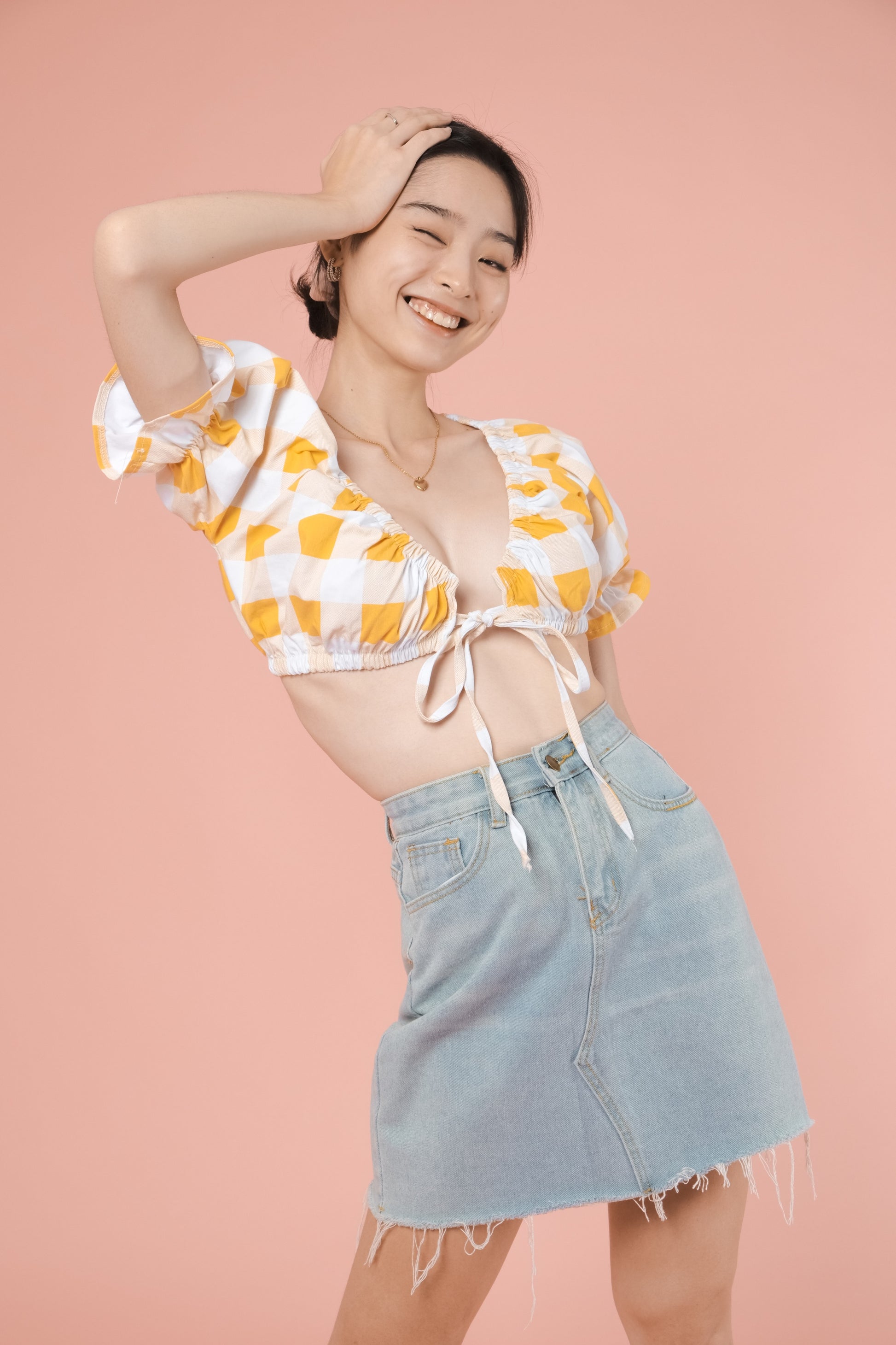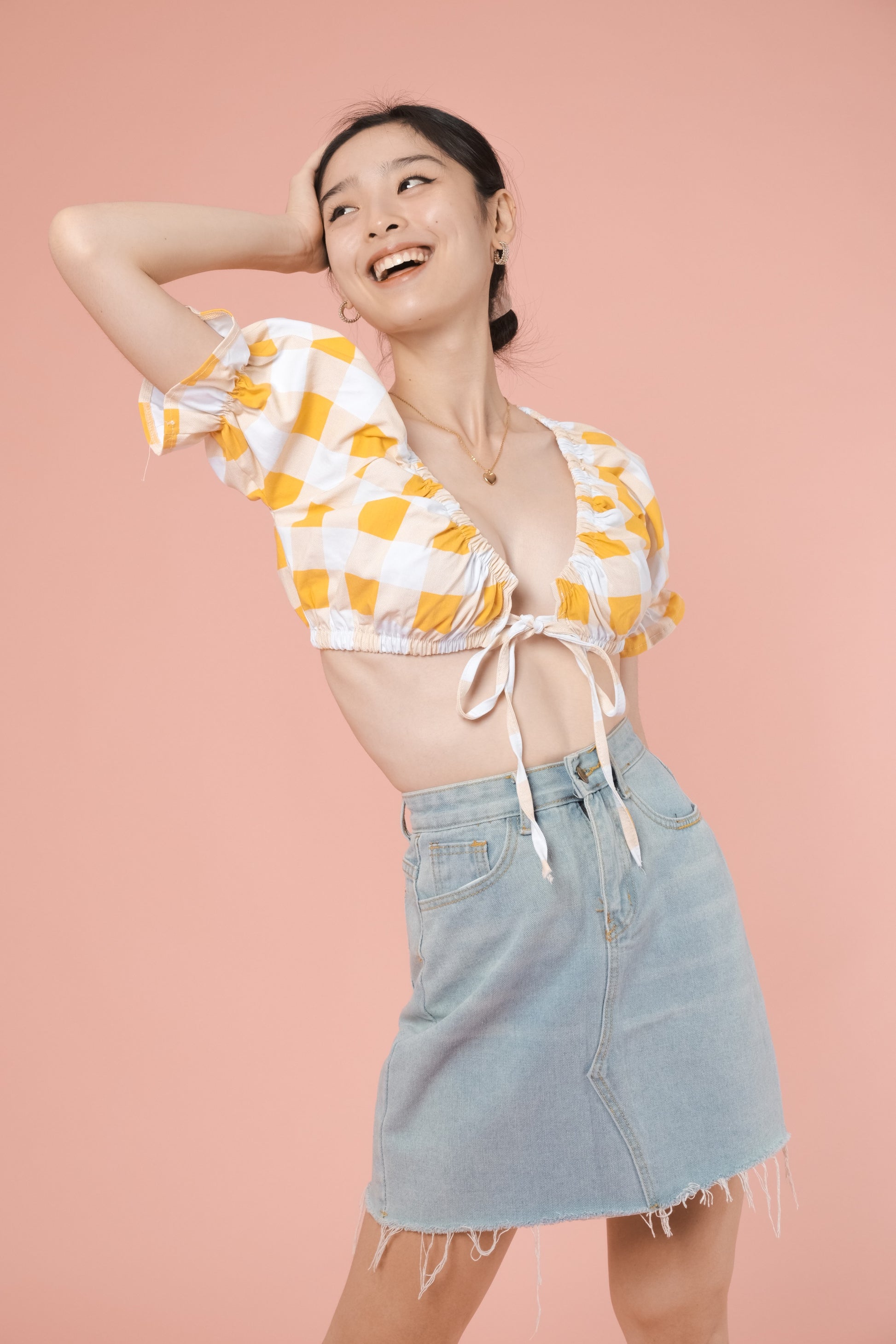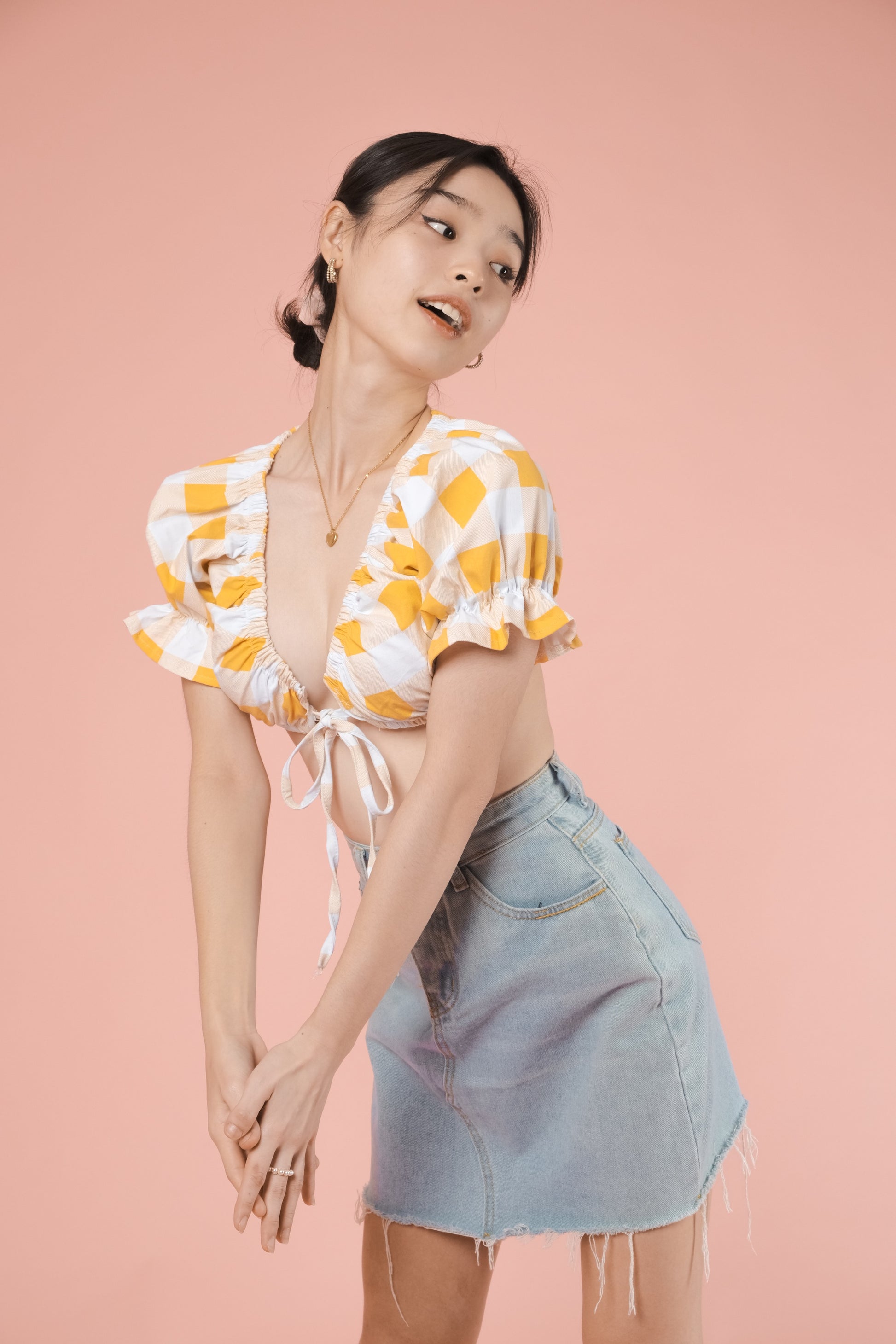 A woven top featuring V neckline with self-tie chest fastening, elasticized puff sleeves, and elasticized waist.