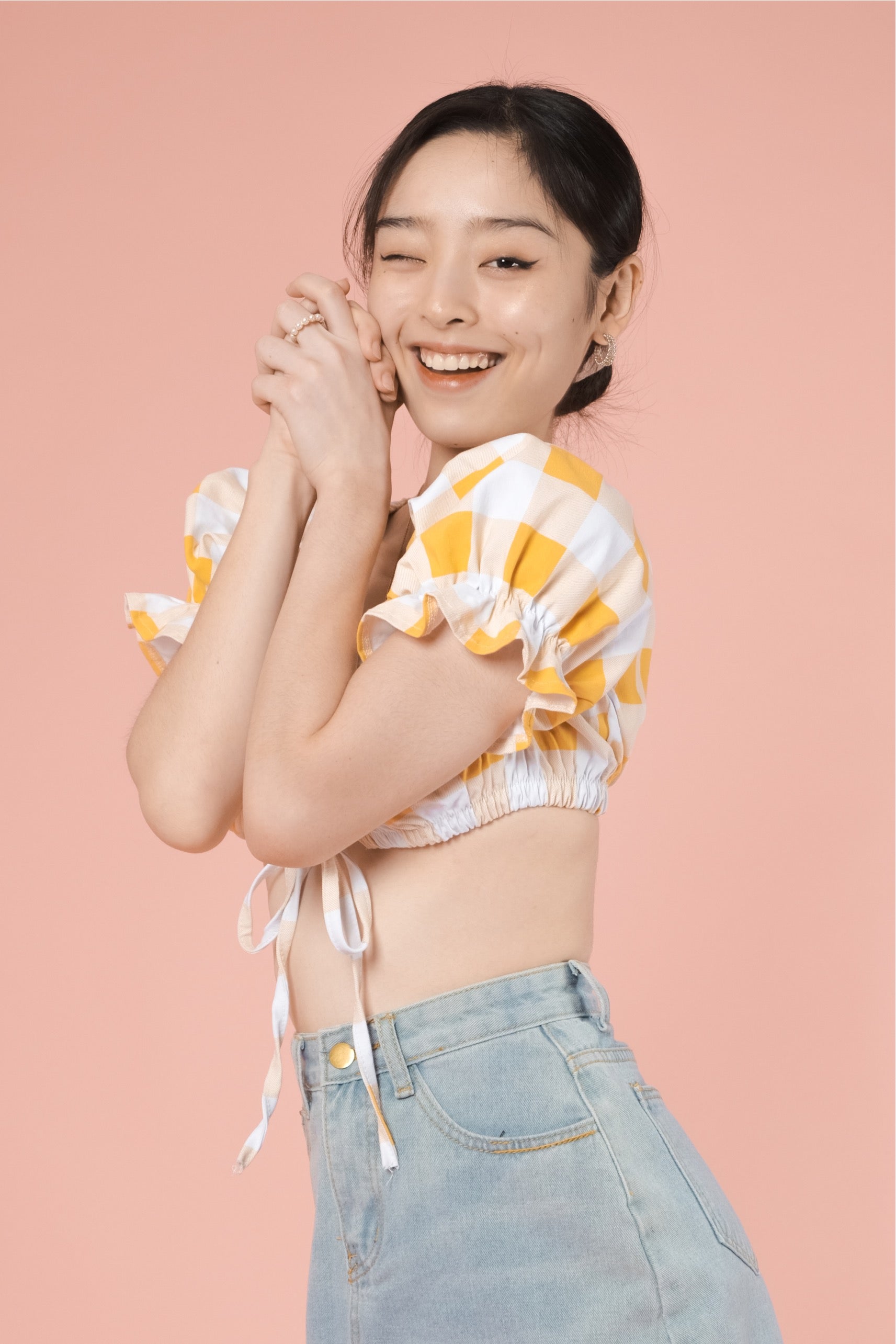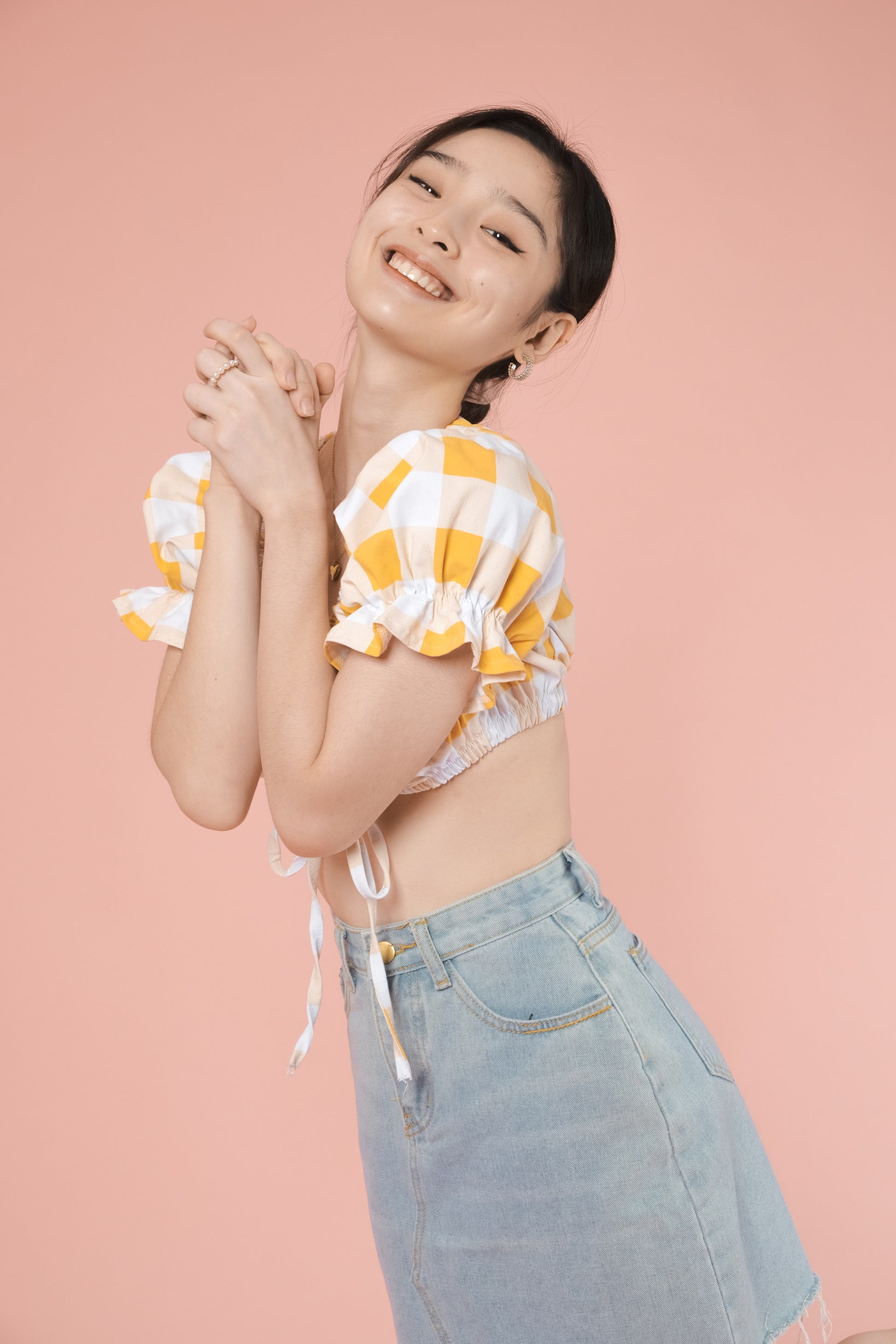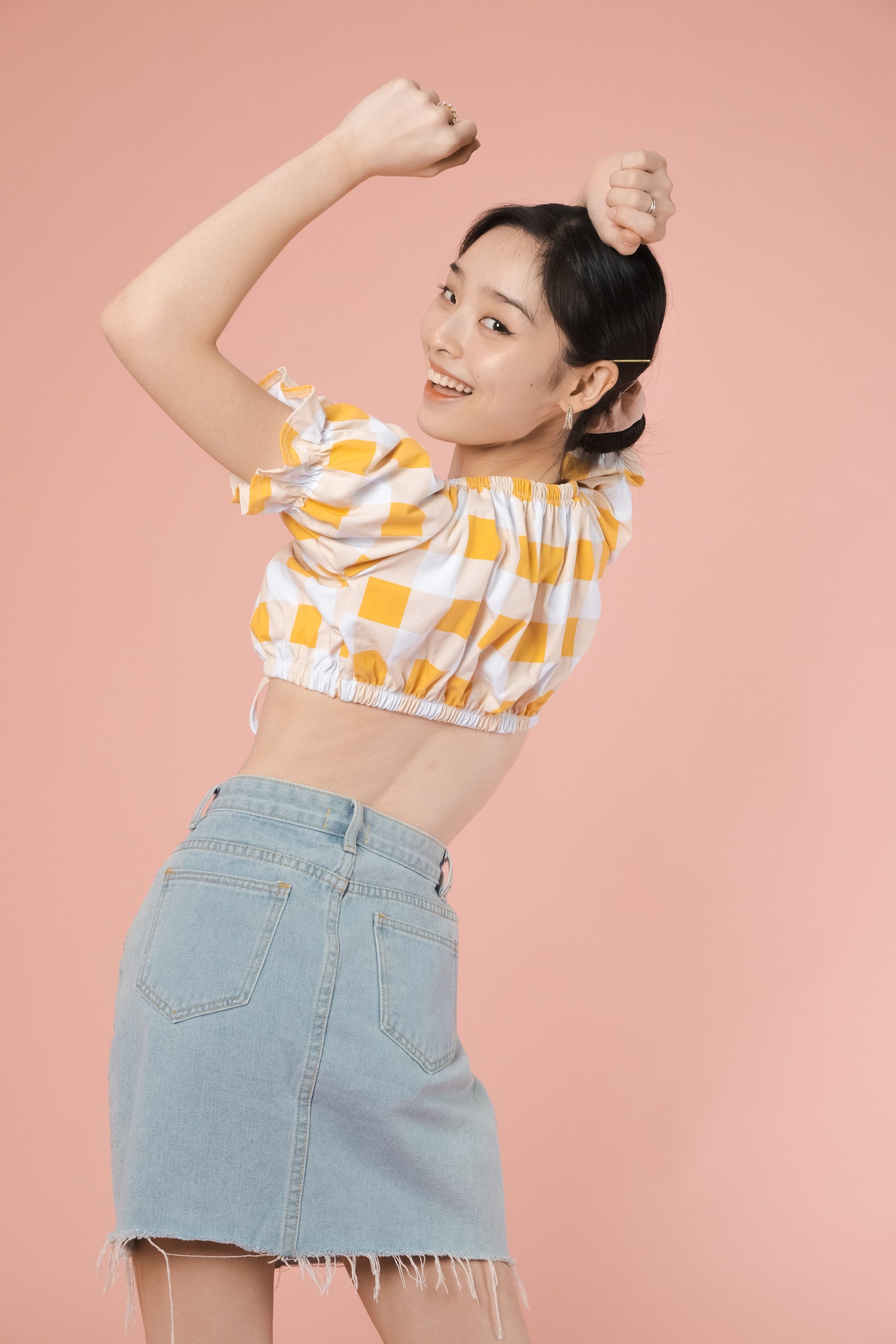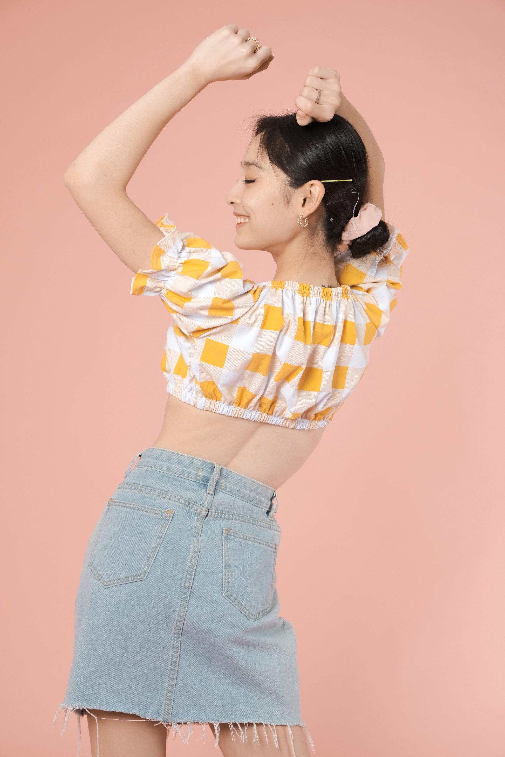 A woven top featuring V neckline with self-tie chest fastening, elasticized puff sleeves, and elasticized waist.