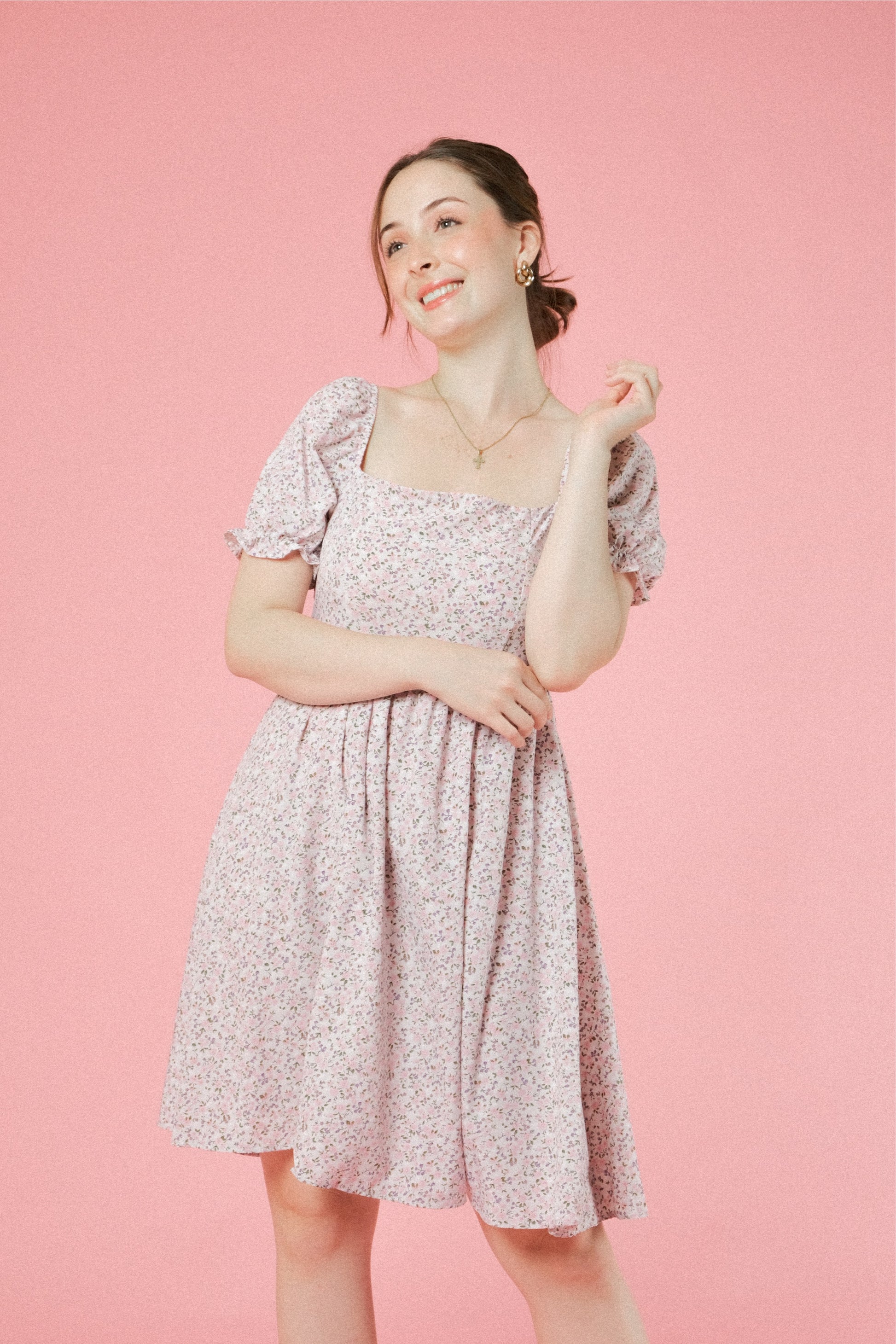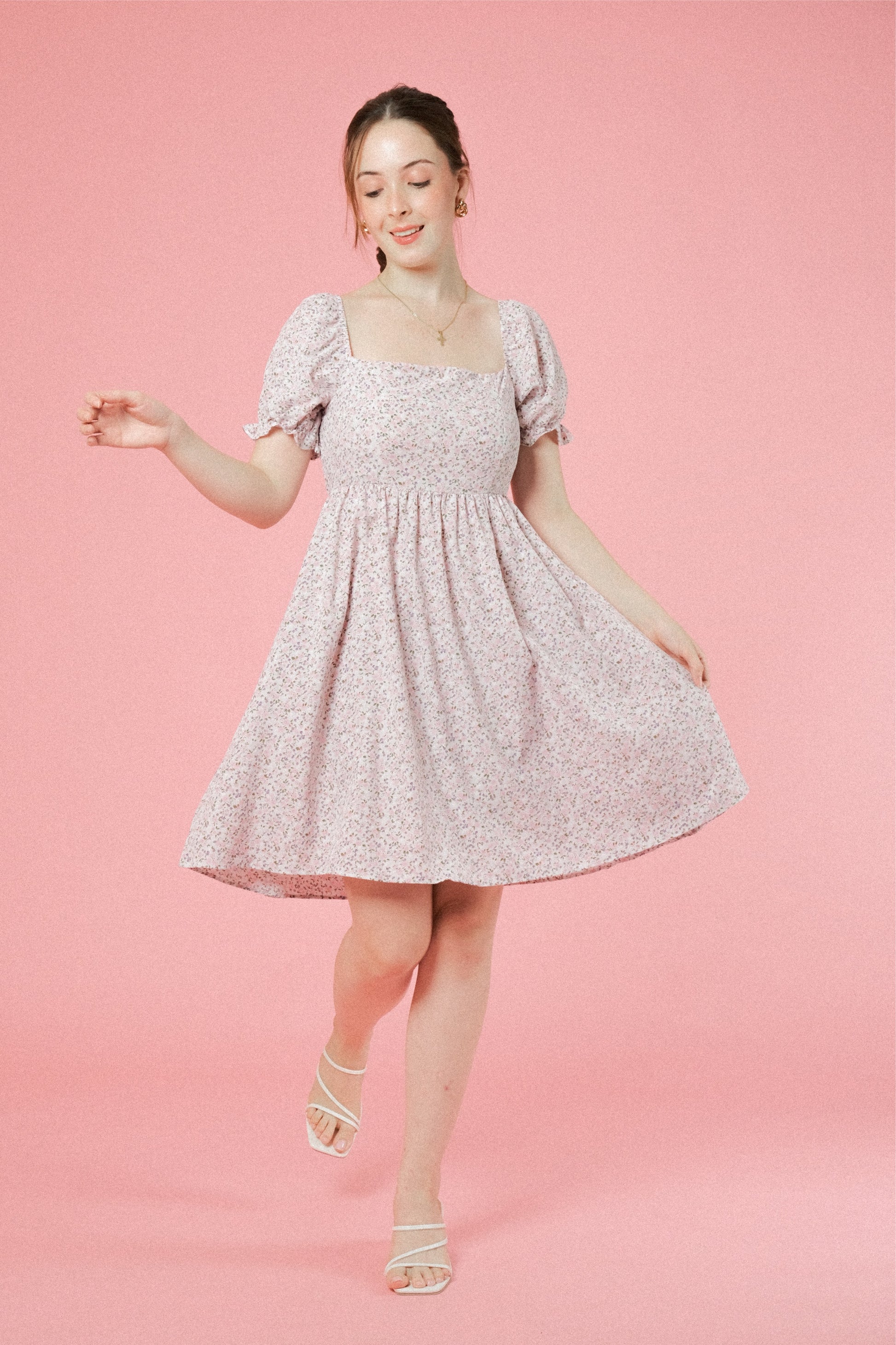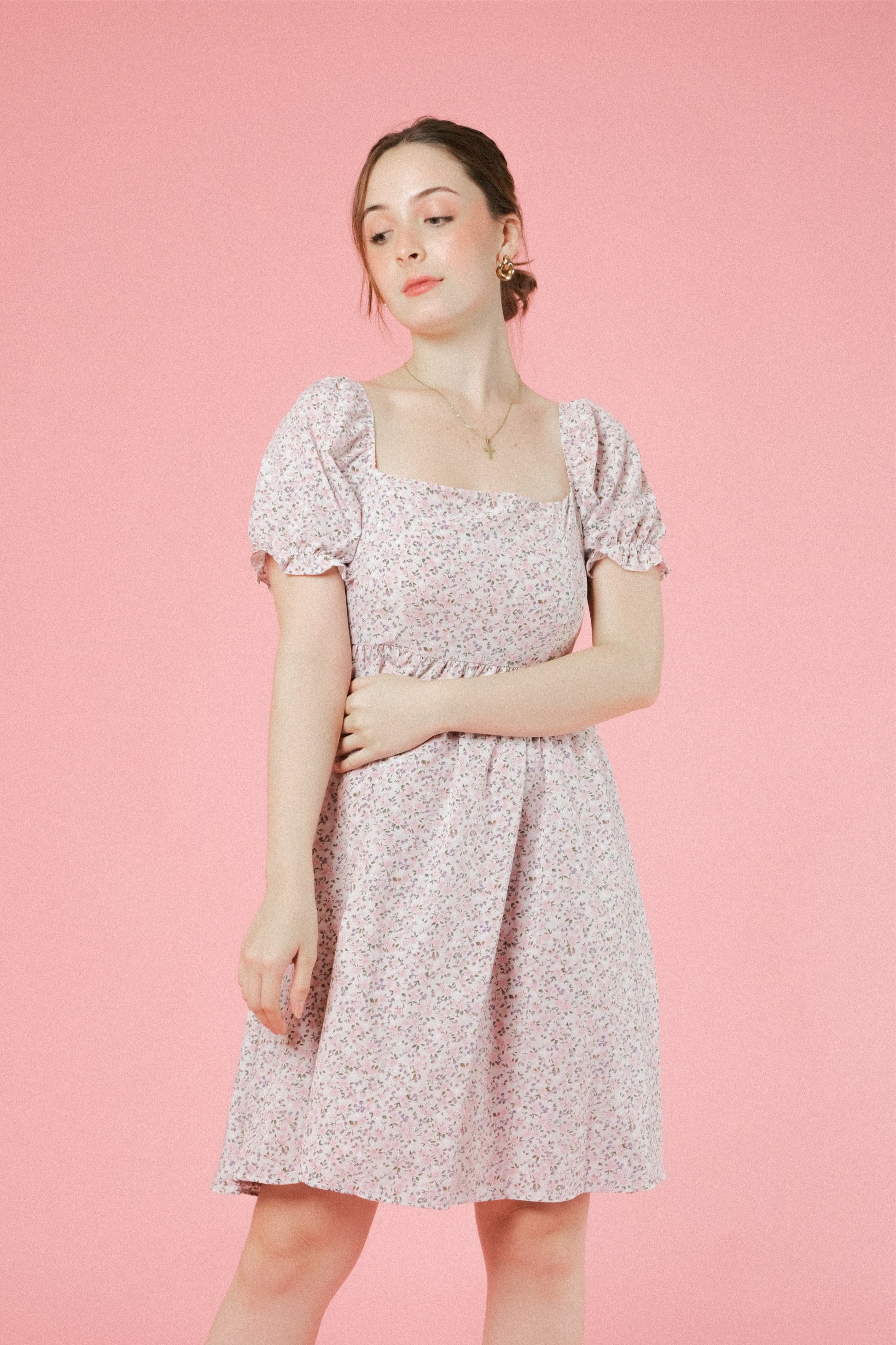 A woven floral dress featuring square neckline, short puff sleeves, smocked back bodice and flowy silhouette.