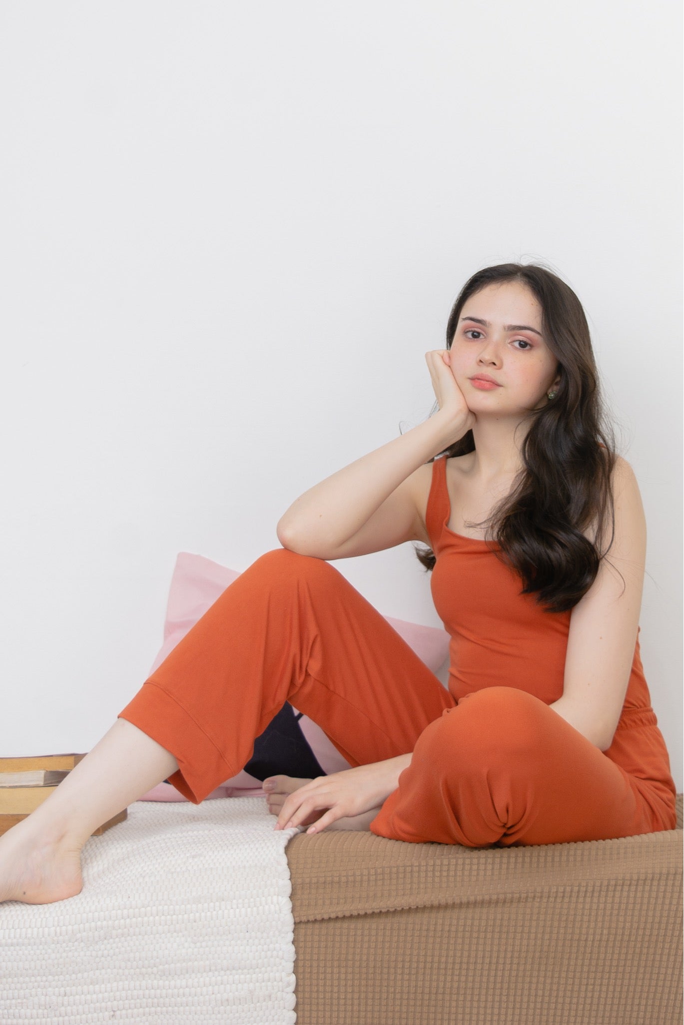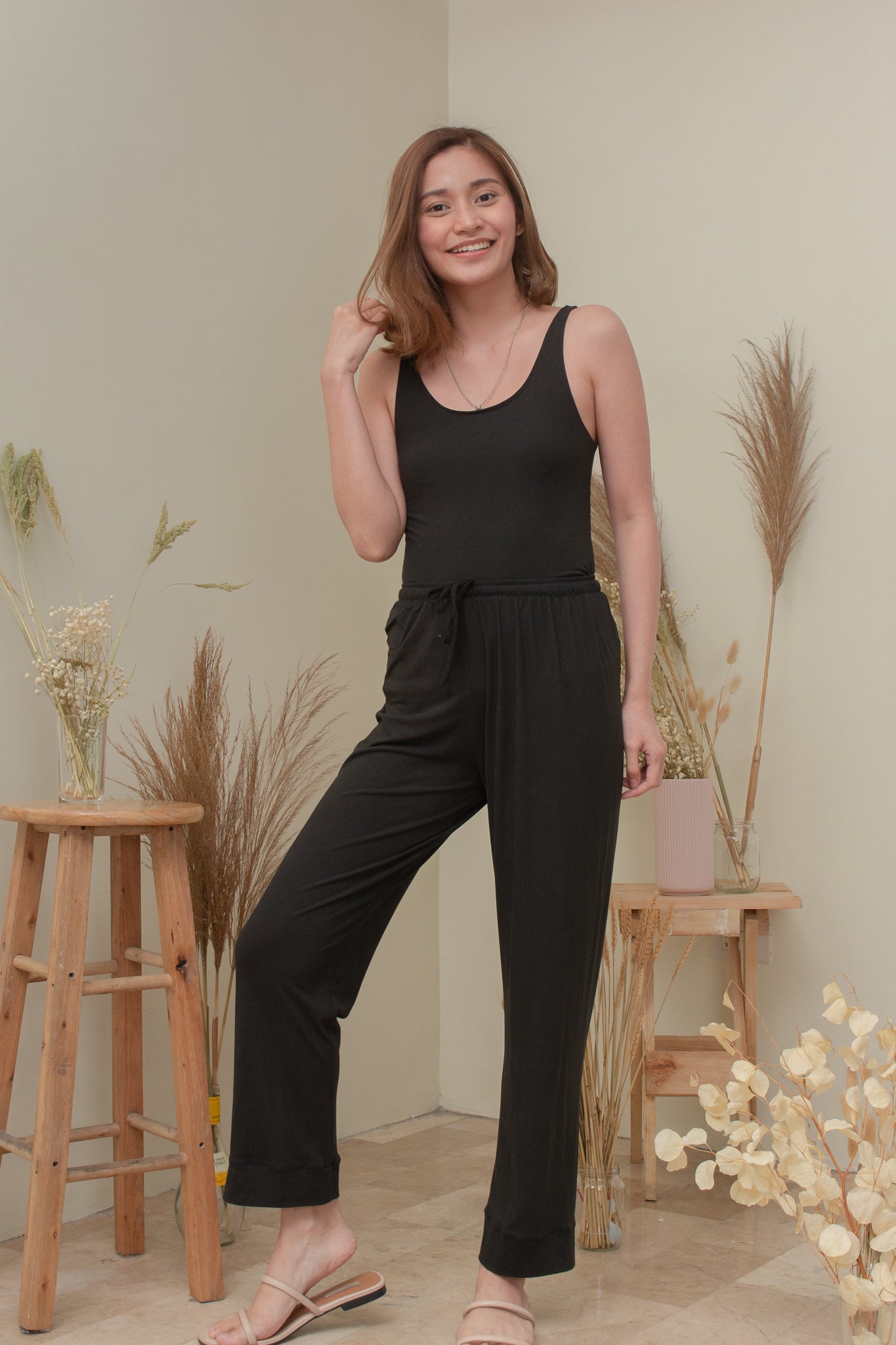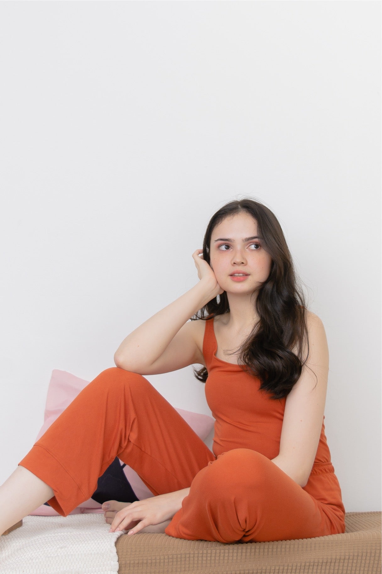 A two-piece woven lounge set featuring a relaxed cami with a scoop neckline and a matching pair of pants featuring elasticized waist with self-tie drawstring fastening.