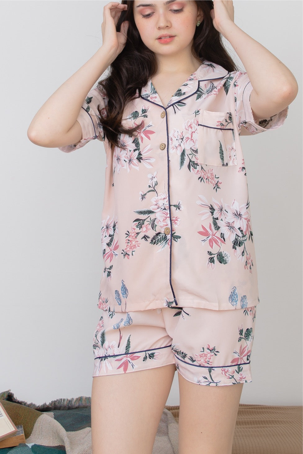 A soft woven floral pajama featuring a sleep shirt with contrasting piped trim, curved notched collar, button-down front that ends in a vented hem, jetted chest pocket, and short sleeves, and a pair of elasticized high-rise shorts with an elasticized waist.